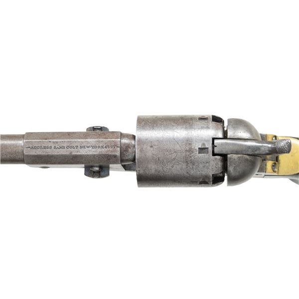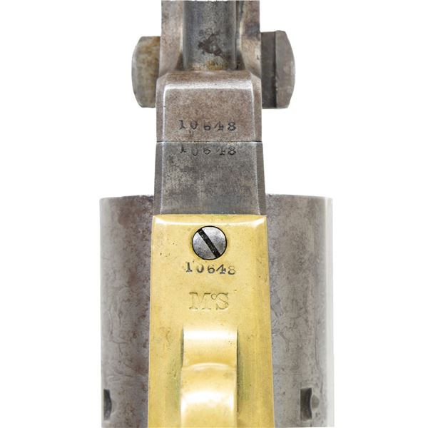 2ND MODEL DRAGOON REVOLVER CARRIED BY PROMINENT MASSACHUSETTS GENERAL CHARLES DEVENS OF WORCHESTER. Cal. 44. S# 10648. Only 100 Massachusetts 2nd model Dragoons were purchased. All bought by Mass board of Ordnance in 1852. All are scattered in the mid 10000 serial range. Several were owned by important Massachusetts personalities, such as one of a pair in Smithsonian carried in Civil War by General Benjamin Butler, S# 10603. Another was owned by 6th Mass surgeon who performed the field surgery of the Civil War, S# 10646. General Charles Devens, Jr (1820-1891) was Civil War Union Brigadier General with impressive bronze equestrian statue in front of Worchester County Courthouse since 1906. Another larger-than-life bronze statue of the general is displayed in Boston cast in 1895. Devens was longtime prominent & important Massachusetts personage, graduate of Harvard Law School in 1840, member of the Massachusetts State Senate in 1848, US Marshall of Massachusetts, 1849 to 1853 (where he probably received this revolver), general in Mass State Militia, and served on the US Department of Justice in 1860 just prior to the Civil War. He volunteered immediately and was appointed Major of the 3rd Mass Mounted Rifles, shortly after, has was promoted to colonel of the 15th Massachusetts and was wounded in action for the first of 3 times at the Battle of Balls Bluff. He was promoted Brigadier General in April 1862 and being wounded a second time at battle of Seven Pines. He was then given command of the 1st Brigade of the IV Corps in the Maryland Campaign. Assigned commander of the 1st Division, XI Corps in 1863, he fought at the Battle of Chancellorsville where he was wounded the 3rd time. In 1864, he was division commander at Battle of Cold Harbor and in the Overland Campaign. During the Siege of Petersburg, he commanded the 3rd Division, XXIV Corps and his troops were the first to occupy Richmond, Virginia in April 1865. For distinguished service, he was brevetted Major General of US Volunteers and served as commander of the military district of Charleston, South Carolina until 1866. After the war, he was judge of the Massachusetts Supreme Judicial Court. No wonder there are 2 statues of him in Massachusetts. Both statues are well known and considered among the finest aesthetic. When the equestrian statue was unveiled in 1906, over 1000 veterans attended and the flag of his old 15th Mass regiment was flown. Devens was also Commander of the Grand Army of Republic from 1873-1875 before being appointed Attorney General of the United States 1877-1881 under President Rutherford Hayes. The revolver is in beautiful condition in standard configuration for Colt 2nd model dragoon, blue and case colored, 7-1/2" octagonal to round barrel, German silver front blade sight and "ADDRESS SAML COLT NEW YORK" address. Trigger guard is stamped with S# and Massachusetts surcharge "MS". "COLT'S PATENT" / "U.S." stamped on left side of frame. Square back brass trigger guard is characteristic of 1st & 2nd model dragoons. Walnut 1-piece grip has 2 inspector cartouches "WAT" (William A. Thornton) and "JCB" (Joseph C. Bragg). Bragg sub-inspector initial "B" is seen on barrel, loading lever, frame, cylinder, trigger guard, backstrap, & grips. Revolver is 100% original and in configuration used in Civil War, all serial numbers match except cylinder which is 10510. Dr. Norman Smith was officer in 6th Mass Militia prior to war and carried S# 10646 just 2 serial numbers apart from General Devens revolver. Smith's revolver had mismatched cylinder like this revolver but was renumbered to match. Most dragoons were issued in pairs as noted by Ben Butler's, another known pair are S#s 10432 & 10549 both with "AME" monogram. The 2nd Model Dragoon was the lowest production of all the Dragoon models and of that limited production, only one hundred were purchased by Massachusetts. This is beautiful & rare Colt 2nd model dragoon owned by a prominent Civil War general, wounded 3 times during war and division commander from 1861-1866. UNATTACHED ACCESSORIES: Family file including notarized affidavit dated May 23, 2023 stating descent of this revolver from General Devens through family of Devens brother Arthur as the general never married. Also in lot is brief biography of General Devens and file on S# 10646 of Norman Smith, Mass militia, a very comparable revolver. CONDITION: very good to fine overall, small traces of blue observed in protected areas, and traces of case colors, revolver is overall smooth gray patina with crisp markings. Rolled "MODEL U.S.M.R." & "COLT'S PATENT" & "Dragoon-Indian fight" cylinder scene is very good, 5 of 6 safety pins are still crisp. Cartouches are both discernible & grips fit well. Mechanics are fine, bore is bright & shiny. PROVENANCE: Charles Devens, Jr (1820-1891), Devens family descent. (01-27273/JS). ANTIQUE. $10,000-15,000.