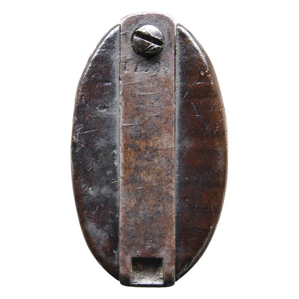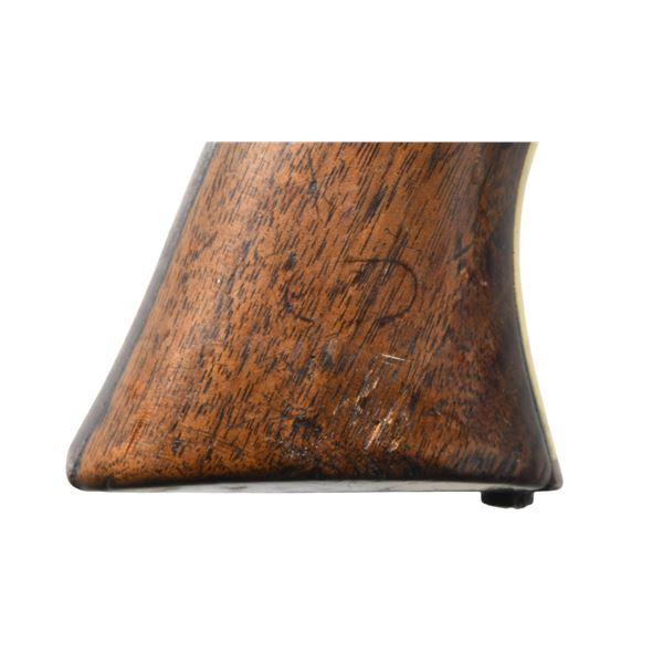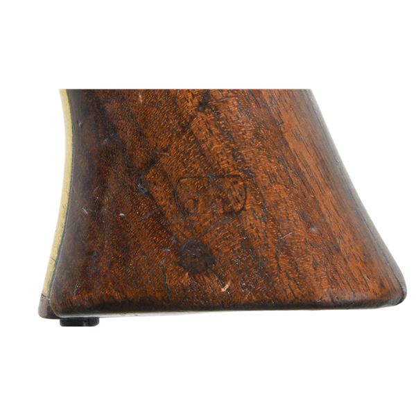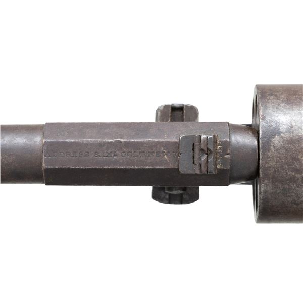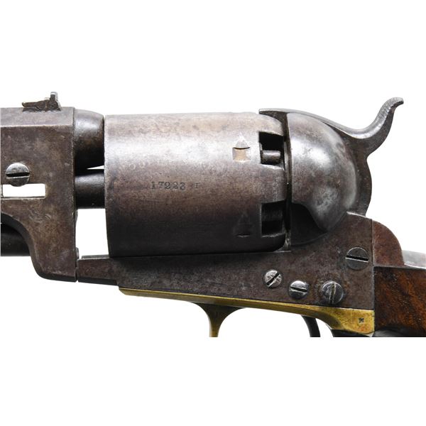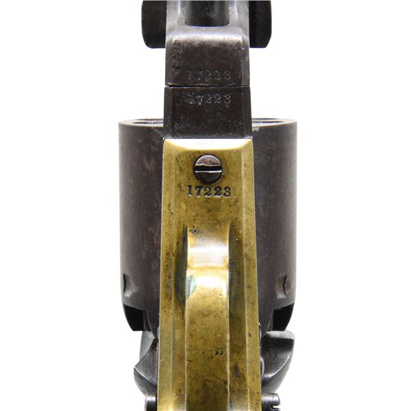 Cal. 44. S# 17223. Standard configuration blue and color case hardened with 7.5" octagonal to round barrel, German silver blade front sight, 1-line New York address, 3-position folding sight inset over part of address. Frame stamped "COLT'S PATENT" / "U.S.", made for shoulder stock with cutouts in recoil shields, 4th frame screw, and notched back strap. Brass trigger guard & iron backstrap contain an oil finished walnut grip with US inspector cartouches. Cylinder has the Ormsby engraved Dragoon-Indian fight scene and "MODEL U.S.M.R. / COLT'S PATENT" cartouches surrounding the S#. Several parts have sub inspectors initials, C, T, and M. This is an attractive gun, complete and original issued to 2nd US Dragoons at Fort Kearney in 1859 as one of 462 pairs of dragoons with stocks. UNATTACHED ACCESSORIES: binder of information on dragoon revolvers. CONDITION: very good overall, overall mottled brown/gray patina with staining and light pitting, all matching. Cylinder scene is about half discernible, safety pins smashed. Wedge missing spring, loading lever pivot screw replaced with hammered bolt during period of use. Mechanics need attention, hammer cocks but cylinder does not advance, good dirty rifled bore. (01-27905/JS). ANTIQUE. $5,000-8,000.