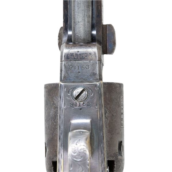 REVOLVER. Cal. 31. S# 91163. Standard configuration Colt model 1849 pocket revolver, 6" octagonal barrel hand engraved "SAM'L COLT" by Gustav Young during his heyday at Colt in 1854. Frame engraved in arc "COLTS PATENT" on left side. 5-shot cylinder has rolled stagecoach scene with small added hand engraved details which is rarely observed, 3 of 5 safety pins are present. Deluxe engraving is finer detail, more defined scrolls & finer pebbled background then the norm, elaborate foliate scrolls terminating in petaled flowers and 2 dog's heads on either side of barrel housing. S#s are accompanied by a small punch dot which indicated extra polish for engraving. Revolver is housed in rare beveled blue velvet lined oak casing with contoured divider for revolver. The case contains "COLTS PATENT" eagle & stars flask, a brass "COLTS PATENT" bullet & ball mold without sprue cutter, a packet of 6 combustible cartridges and a lacquered tin of Eley's caps with green label. CONDITION: fine, all matching and complete. Revolver retains most of its original finish, though only traces of blue on cylinder, and case colors are mostly muted. Grip strap engraved en suite retains most all its original factory silver, grips have good fire to burl retaining most all their bright factory varnish. Mechanics fine, crisp rifled bore. Casing is equally fine, "COLT'S PATENT" flask is very good with light denting and half of its original varnish, 2-cavity brass "COLTS PATENT" mold & cartridge pack are fine, Ely green label cap tin is good with flaking to label. Beveled oak casing is very good, but locked open with no key. PROVENANCE: Michael Simens collection; Steve Ardia collection; James Julia Auction lot 2122, March 15, 2016. (01-28152/JS). ANTIQUE. $10,000-15,000.