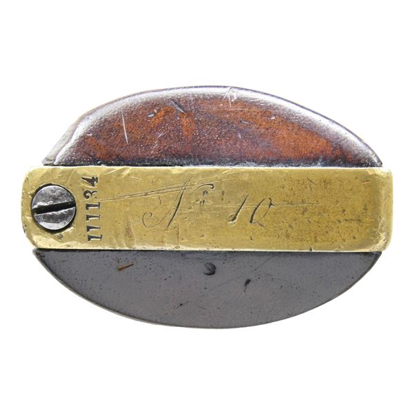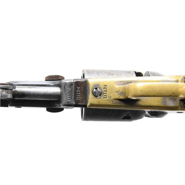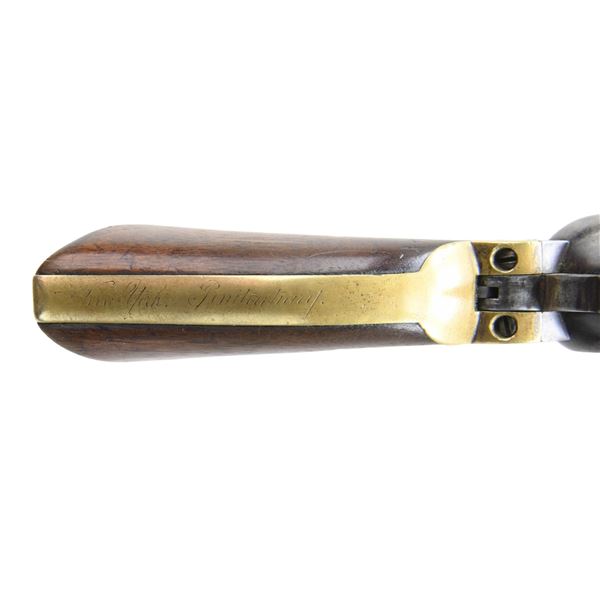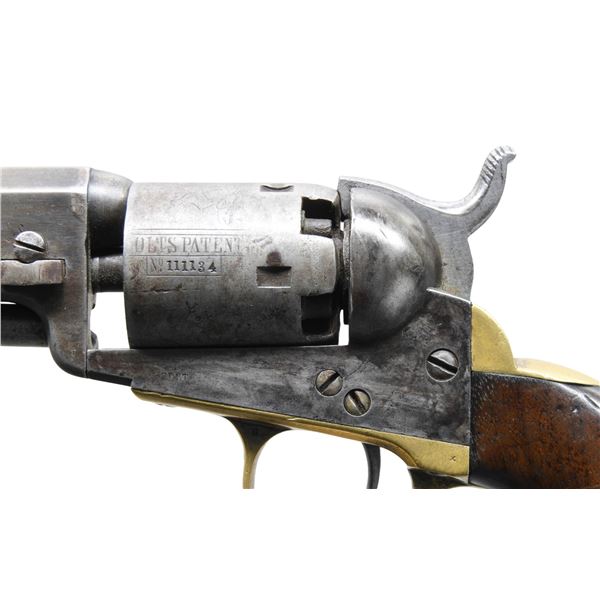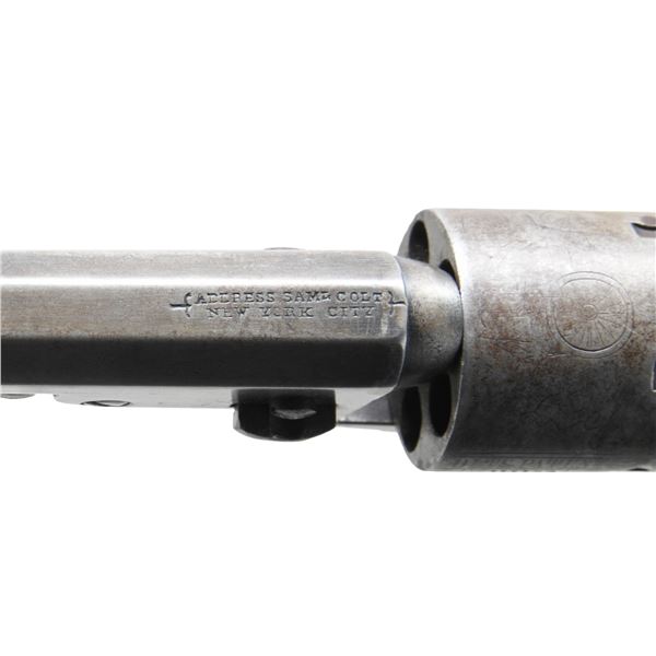 POCKET MODEL REVOLVER. Cal. 31. S# 111134. Standard configuration made in 1856, 4" octagonal barrel with 2-line "ADDRESS SAML COLT / NEW YORK CITY" address with brackets, small "COLT'S / PATENT" right side of frame, stagecoach holdup scene rolled 5-shot cylinder. Brass trigger guard and backstrap hold varnished walnut grips. Backstrap engraved in period script: "New York Penitentiary" and "No. 10" on butt. CONDITION: very good overall, all matching and complete, most of "stagecoach holdup" cylinder scene visible, cleaned gray metal, traces of finish in protected areas. Mechanically fine, good rifled bore, grips traces of their original factory varnish. (01-28135/JS). ANTIQUE. $1,200-1,500.