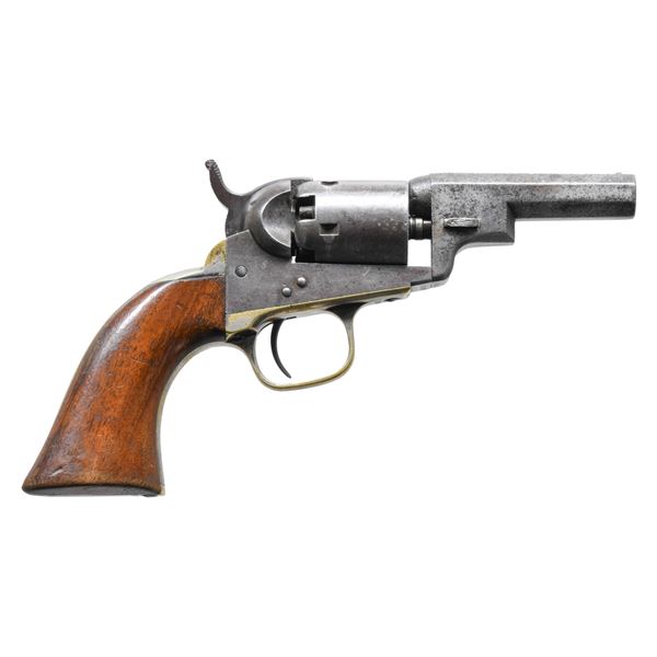REVOLVER. Cal. 31. S# 181636. Bbl. 3" octagon without loading lever has New York address and brass bead front sight. 5-shot rnd. cyl. with stagecoach scene roll engraving. Blue and case colored finish with silver finished large brass trigger guard and backstrap. Bbl., frame, grip straps, and cyl. have matching #s. Wedge has non-matching # "49052". Mfg. in 1861. UNATTACHED ACCESSORIES: Colt marked 2-cavity iron mold and 3 rnd. balls. CONDITION: metal has faded to gray showing areas of light pitting. Grip straps retain over 30% silver finish having acquired a partial dark tarnish. Grips show moderate wear and handling marks. Sound mechanics. Lightly pitted bore retains strong rifling. Bullet mold has faded gray appearance with areas of light pitting. (01-26681/DS). ANTIQUE. $1,000-1,500.