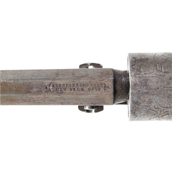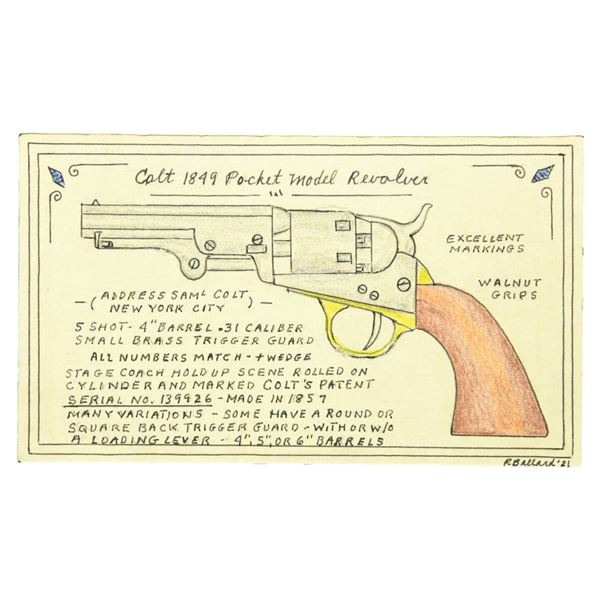 Cal. 31. S# 139926. Standard configuration made prior to Civil War circa 1858, 4" octagonal barrel with 2-line NEW YORK US AMERICA address with brackets, small "COLT'S / PATENT" right side of frame, stagecoach holdup scene rolled 5-shot cylinder. Brass trigger guard and backstrap hold varnished walnut grips. UNATTACHED ACCESSORIES: hand drawn colored collection card by Roger Ballard. CONDITION: very good overall, all matching, complete & original, good cylinder scene, functional safety pins intact, mottled gray iron patina, good markings, . Mechanically fine, good rifled bore, well fit grips retain traces of their original factory varnish. PROVENANCE: Roger Ballard Collection. (01-26289/JS). ANTIQUE. $700-900.
