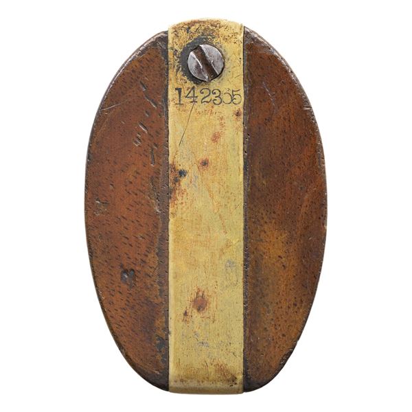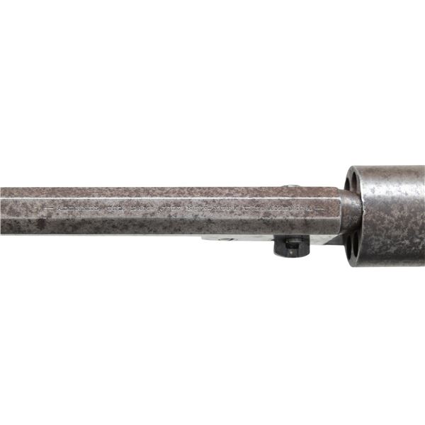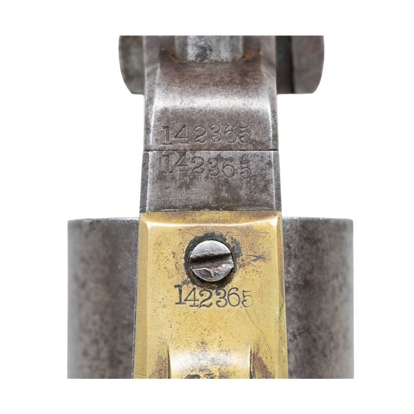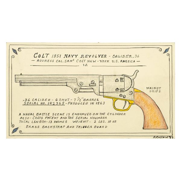 Cal. 36. S# 142365. Standard configuration made at height of Civil War mid-1863, standard configuration 7.5" octagonal barrel with 1-line NEW YORK US AMERICA address, small "COLT'S / PATENT" left side of frame, "36CAL" stamped on left side of trigger guard, 6-shot cylinder with rolled naval battle scene. Silver plated brass trigger guard and backstrap, varnished walnut grips. This is honest well cared for surviving Civil War navy revolver. UNATTACHED ACCESSORIES: hand drawn colored collection card by Roger Ballard. CONDITION: very good overall, all matching and complete, metal is mottled gray patina, tiny traces of blue in protected areas, grips retain virtually all their original factory varnish with light to moderate edge wear. Grip frame retains traces of original silver wash. Mechanically fine, sharp rifled bore with pitting. PROVENANCE: Rafael Eledge, Shiloh Relics; Roger Ballard Collection. (01-26288/JS). ANTIQUE. $1,200-1,600.