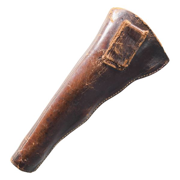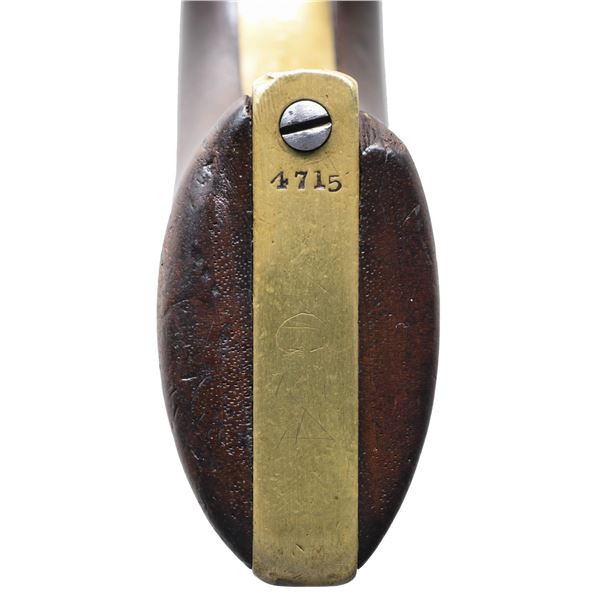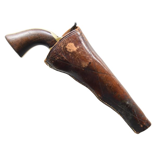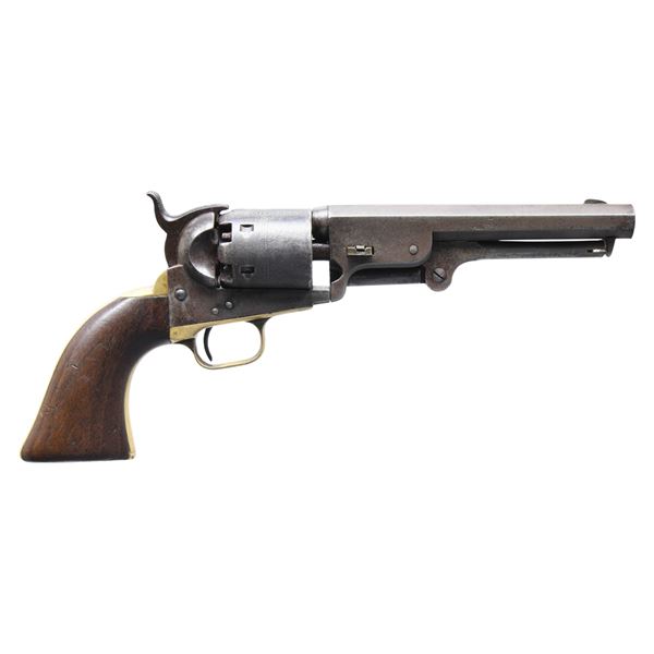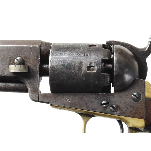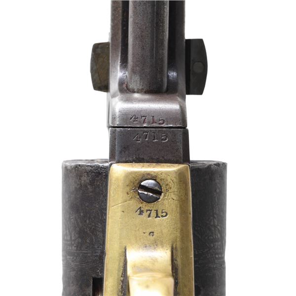 BARREL & HOLSTER. Cal. 36. S# 4715. Made in 1851, early features: "Slim Jim" grips, earliest short New York City address, tiny "COLTS PATENT" on left side of frame, barrel is cut back to 6", silver blade front sight, slim Jim brown leather holster. CONDITION: good to very good overall, loading lever cut back to barrel cut back 1.5". Wedge and hammer screw are replaced, matching S#s otherwise. Cylinder has partial cylinder scene, overall patinaed iron, polished and toned brass grip frame. Mechanics fine, crisp rifled bore. Holster is very good with scuffing especially belt loop, fits shortened revolver well. (01-27257/JS). ANTIQUE. $800-1,200.