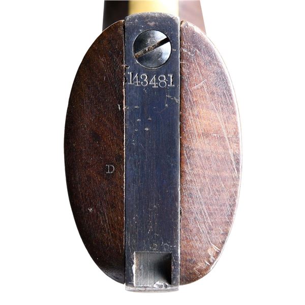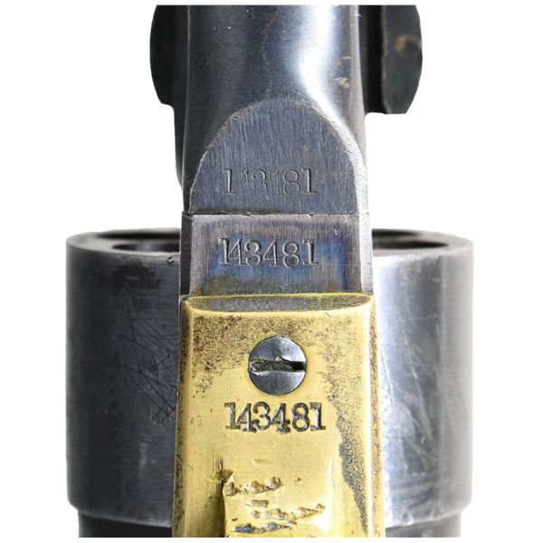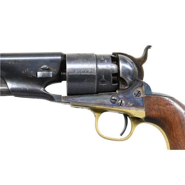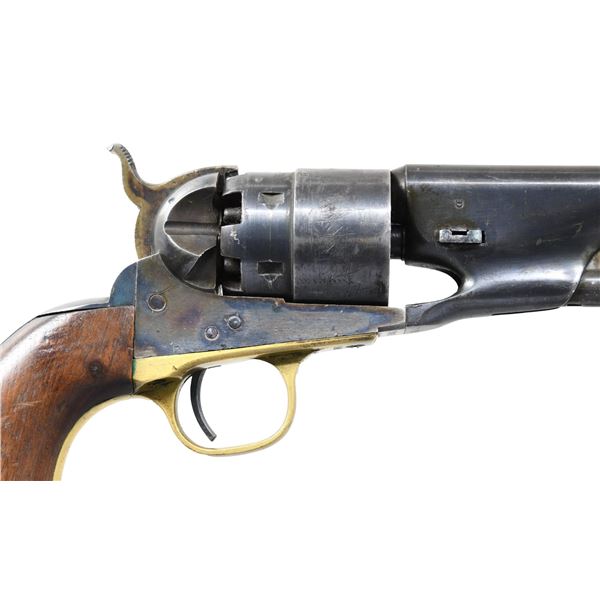 MODEL 1860 ARMY PERCUSSION REVOLVER. Cal. 44. S# 143481. The Colt 1860 army revolver had just been introduced at the beginning of the Civil War and over 100,000 were bought by the US government for use by cavalry, and no doubt the most popular sidearm of the day. Rarely do survivors surface that appear unused with bright finish like this example made at the height of the war in mid-1863. Standard configuration, blued 8" round barrel with rolled 1-line address "ADDRESS COL. SAML COLT NEW-YORK U.S. AMERICA", case colored frame, "COLTS/PATENT" stamped on left, blued steel back strap with shoulder stock notch, brass trigger guard. Cylinder retains most all its original military blue finish with crisp rolled Texas Navy battle scene, "ENGAGED 16 MAY 1843." and "COLT'S PATENT No./PAT. SEPT 10th 1850". The loading lever and hammer are casehardened with bright case colors like the frame. Good inspection cartouches are bright on both grips, and sub-inspection initials observed barrel, cylinder, back strap, & trigger guard. Rarely offered are Civil War military Colt armies that appear unfired retaining most of their original bright finish. CONDITION: excellent overall, all matching & crisp markings, retaining large amounts of bright finish, about 95% bright blue transitioning to plum, case colors are 90% on frame, loading lever, & hammer. Feathering of blue finish visible on either side of sight. There are a few scattered dings and dents. Grips are fine with light edge wear and both cartouches fine and discernible. Percussion nipples crisp showing no use and 6 crisp safety pins, some blue finish in chambers. Trigger guard is a yellow patina with tool marks visible on front edge of trigger bow. Mechanically fine, bright shiny rifled bore. PROVENANCE: Norm Flayderman family Collection. (01-27171/JS). ANTIQUE. $8,000-12,000.