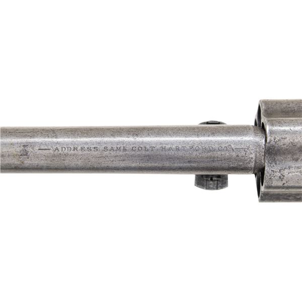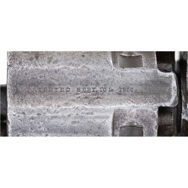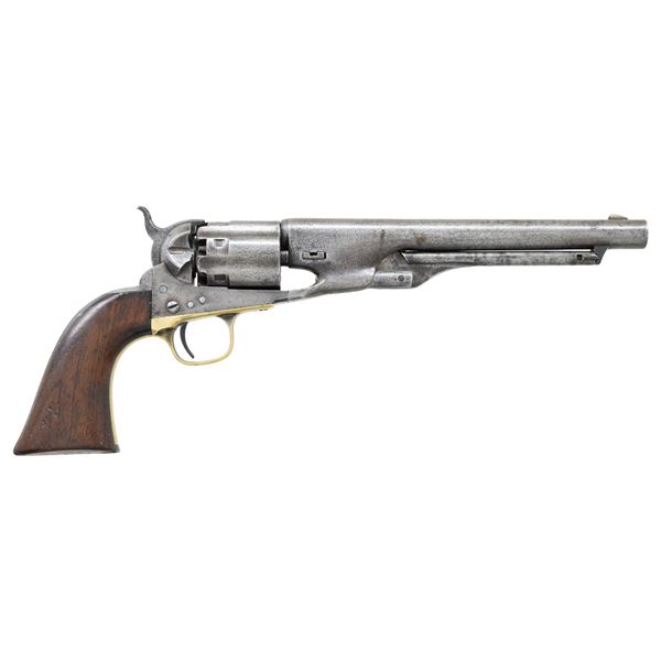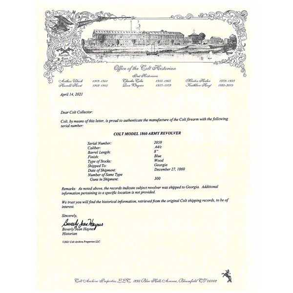 ARMY REVOLVER. Cal 44. S# 2059. Standard configuration, 8" barrel with 1 line Hartford address, German silver blade front sight. 300 Colt army revolvers were shipped to State of Georgia ordered by Governor Joseph Brown December 27, 1860. This revolver was part of Charles Pate collection and pictured and described in his exemplary 2021 text "The Colt Model 1860 Army Revolver" in chapter on "Southern New Model Army Colts". The 300 revolvers which this is one of the rare known survivors was probably issued to Phillip's Legion Cavalry which served with Jeb Stuart in Virginia. UNATTACHED ACCESSORIES: Colt factory letters confirming shipment to State of Georgia, December 27, 1860 and configuration of revolver. Signed copy of the Charles Pate Colt Army book detailed this exact revolver. CONDITION: very good overall, appears complete and matching. Matching serial number is found on barrel, frame trigger guard, backstrap, wedge, arbor, and last 3 digits inked in backstrap channel of grips. Markings all discernible including patent and serial number on opposite flutes of cylinder, 1-line Hartford address is well discerned as is "COLT'S / PATENT" on left side of frame. Iron has a mostly smooth mottled gray patina. Brass trigger guard has light mustard patina and traces of silver, and small factory inspection "G" on left at rear, a small "s" is stamped on left front web of trigger bow. Grips are well fit, hand worn patina, moderate edge wear, traces of original factory varnish. Mechanically fine with crisp discernible rifling. (01-27784/JS). ANTIQUE. $8,000-12,000.
