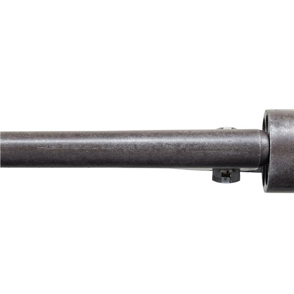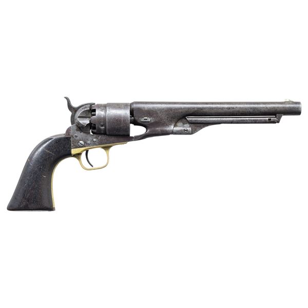 Cal. 44. S# 28792. The Colt 1860 army revolver cut for shoulder stock with 4-screw frame was manufactured early 1862. Standard configuration, notched steel backstrap, milled recoil shields, 8" round barrel with rolled address "COL. SAML COLT NEW-YORK U.S. AMERICA" with dashes, frame stamped on left "COLTS / PATENT", brass trigger guard. Cylinder has rolled Texas Navy battle scene. Sub-inspection initials observed barrel "S", cylinder "B" and "T", back strap "T", and trigger guard "T". Revolver is accompanied with original unopened paper wrapped pack of 6 Colt cartridges. CONDITION: good overall, all matching & complete except replacement reproduction wedge, grips fit well but no discernible inspection cartouches or S#, metal is overall mottled gray with scattered pitting, slightly loose at frame due to undersized wedge, cylinder scene is about 25% intact, all markings discernible, mechanics function, crisp rifled bore. Cartridge pack is very good. (01-28146/JS). ANTIQUE. $1,200-1,800.