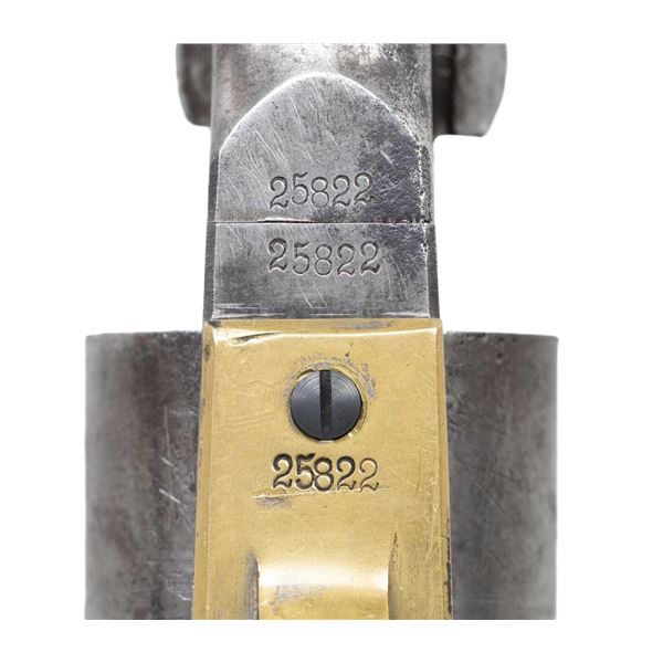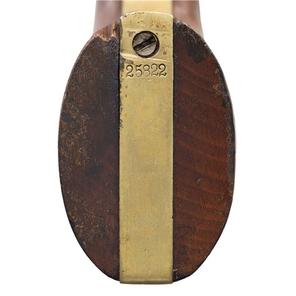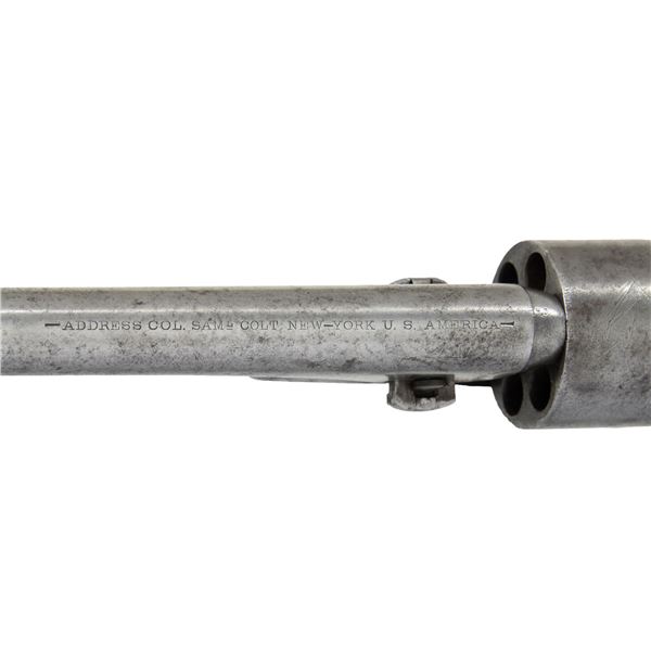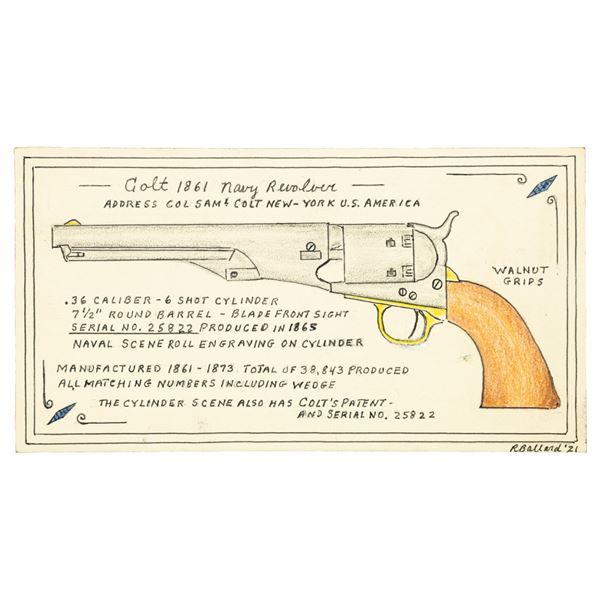 Cal. 36. S# 25822. Standard configuration of model 1861 navy revolver made last year of Civil War in 1865, standard configuration 7.5" round barrel with 1-line NEW YORK US AMERICA address, small "COLT'S / PATENT" left side of frame, "36CAL" stamped on left side of trigger guard, 6-shot cylinder with rolled naval battle scene. Silver plated brass trigger guard and backstrap, varnished walnut grips. Most 1861 navy revolvers were converted to cartridge, this is honest surviving example in original unaltered percussion configuration. UNATTACHED ACCESSORIES: hand drawn colored collection card by Roger Ballard. CONDITION: very good overall, all matching and complete, metal is mottled gray patina with scattered pitting, sharp marking, grips retain virtually all their original factory varnish with moderate edge wear. Brass grip frame retains traces of tarnished silver wash. Mechanically fine, sharp rifled bore. PROVENANCE: Doug Heiser, Franklin Civil War Show, 2021; Roger Ballard Collection. (01-26292/JS). ANTIQUE. $1,200-1,500.