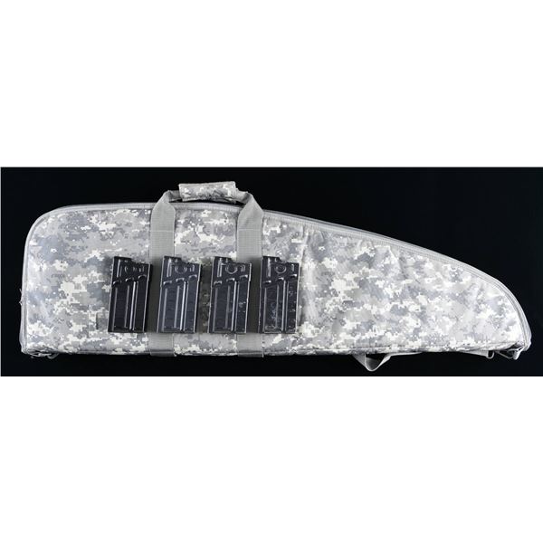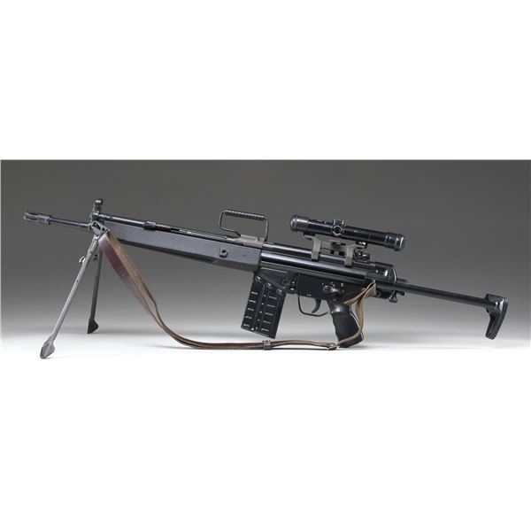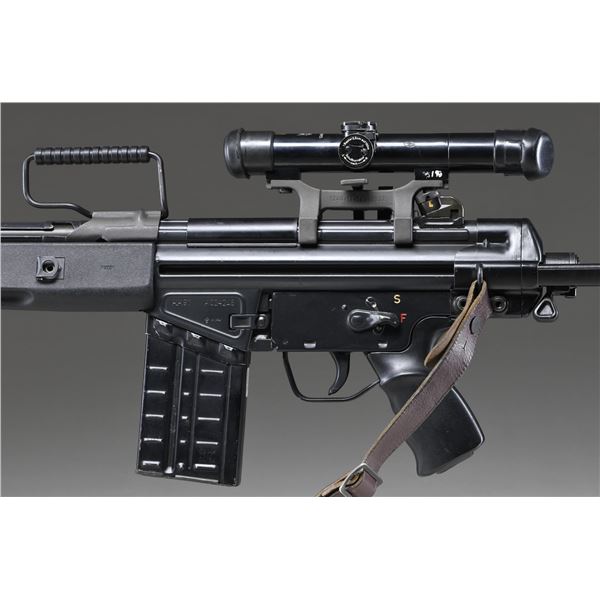 Cal. 308. S# A024246. Bbl. 17.7" w/ factory flash hider. HK model 91 w/ A-3 style, retractable shoulder stock. Black plastic wide forend w/ folding factory bipod. Factory 4 position drum style rear sight assembly. Hooded post front sight. Right side folding carry handle. Push button mag. release w/ S-F metal clip on trigger housing. Magwell right side marked, "Made in Germany / HK Inc. / Arl. Va. 22201 / Kal. .308". Left side magwell marked, "HK 91, A024246" w/ the proof codes: eagle, IA, antler signifying 1980 manufacture. German "SchuBrichtung" scope mount sporting Hensoldt Wetzlar w/ lateral graduation grid reticle. Snap-on ejection port buffer. Left side sling swivels, currently sporting brown leather sling. MAGS: 5 aluminum 20 rd. UNATTACHED ACCESSORIES: Digital camo pattern nylon transport case. CONDITION: dark black factory finish coverage complete & consistent w/ some thinning in areas of mechanical intervention & high spots. Shoulder stock locks tightly in both extended & collapsed positions. Scope glass is clear w/ sharp retical. Bore is bright w/ strong rifling. Fire control mechanism appears to function correctly when cycled by hand. (25-985/JZ). MODERN. $2,750-3,750.