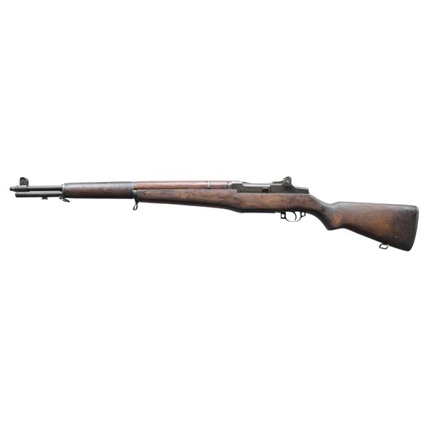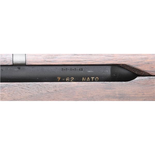RIFLE CONVERTED TO 7.62 NATO. Cal. 7.62x51. S# 1438584. Bbl. 24". Rifle originally mfg. in 1943. Has been converted to 7.62 NATO cal. by the addition of a sleeve in the chamber & has an added white spacer in the mag. to prevent loading w/ the original 30-06 ammunition. Bbl. is marked on right side "3-S-A-3-43" & enhanced in white "7.62 NATO". T105E1 aperture rear sight. Blade front sight w/ protective ears. All major parts markings are "SA". Milled trigger guard. Walnut stock set. Buttstock is marked only w/ faint encircled "P" under grip. UNATTACHED ACCESSORIES: cardboard shipping box containing 8 rd clip, green nylon sling, open bolt indicator, Fulton Armory advertisement & CMP owner's manual. Includes a CMP data sheet. Also includes a certificate of authenticity dated 2004 & signed by Gary Anderson. CONDITION: stock set has arsenal rework finish w/ extensive wear, staining, dents & handling marks. Front handguard has 2" crack in forward end. Metal retains 75% of its original parkerized finish including the two-toned receiver anneal. Very good shiny bore. PROVENANCE: The Estate Collection of Charles Wagner. (24-4682/RW). CURIO. $800-1,200.