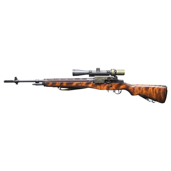 Cal. 7.62x51. S# 021782. Bbl. 22" unmarked with flash hider. Blade front sight with protective ears. Adjustable aperture rear sight. Rifle is also equipped with Leatherwood mount & 3-9x ART II scope. Scope has duplex crosshair reticle & good optics. Springfield Armory Inc. M1A with some USGI parts such as HRT marked bolt, stock & TRW trigger housing. Parkerized finish. USGI birch stock with bottom mounted sling swivels & canvas GI sling & green plastic handguard. MAGS: none present. UNATTACHED ACCESSORIES: gray plastic charging handle & muzzle cover. CONDITION: stock has added oil finish with some handling marks & light scratches. Metal retains 93% original parkerizing with some scattered edge wear mostly around gas cyl. assembly. Action functions properly when hand cycled. Bright near excellent bore. (25-539/MJC). MODERN. $2500-4000.