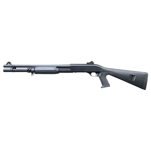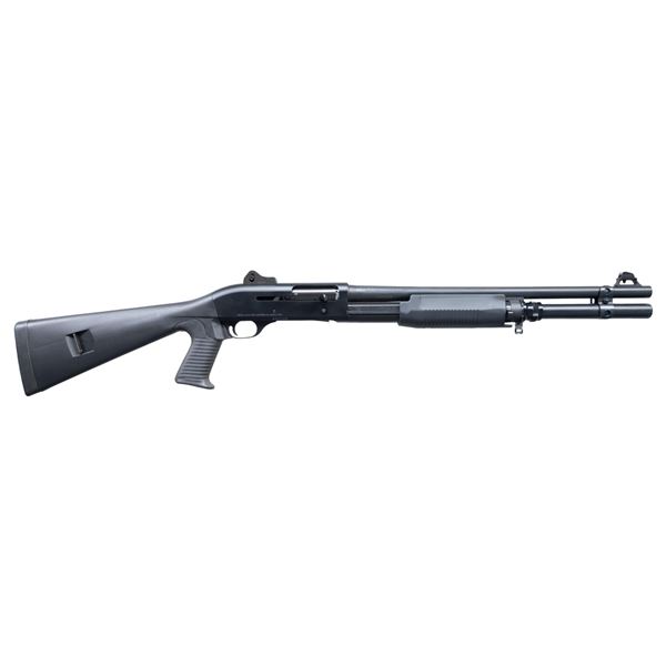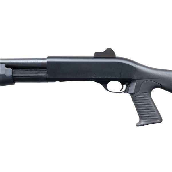 SHOTGUN. CAL. 12 GA., 2 3/4" & 3". S# M821144D. Mfg. 2013. Bbl. 19.8". Ghost ring sights. Matte black finish. Tubular mag. w/ extension. Benelli Inertia system allow for pump auction or semi automatic cycling. Black synthetic pistol grip stock set. CONDITION: near excellent overall appearance with minor handling wear. (25-4718/MD). MODERN. $1,000-1,500.