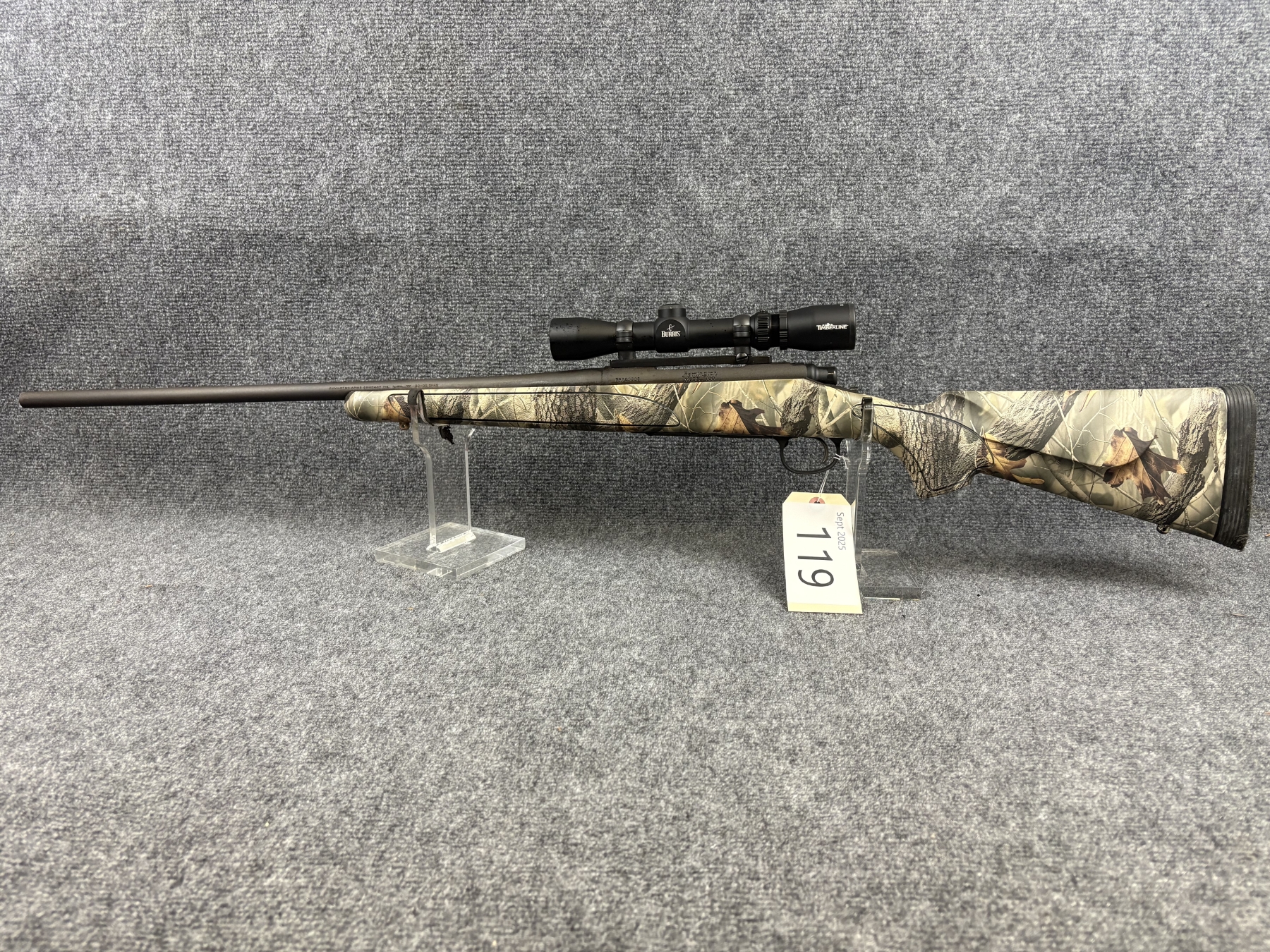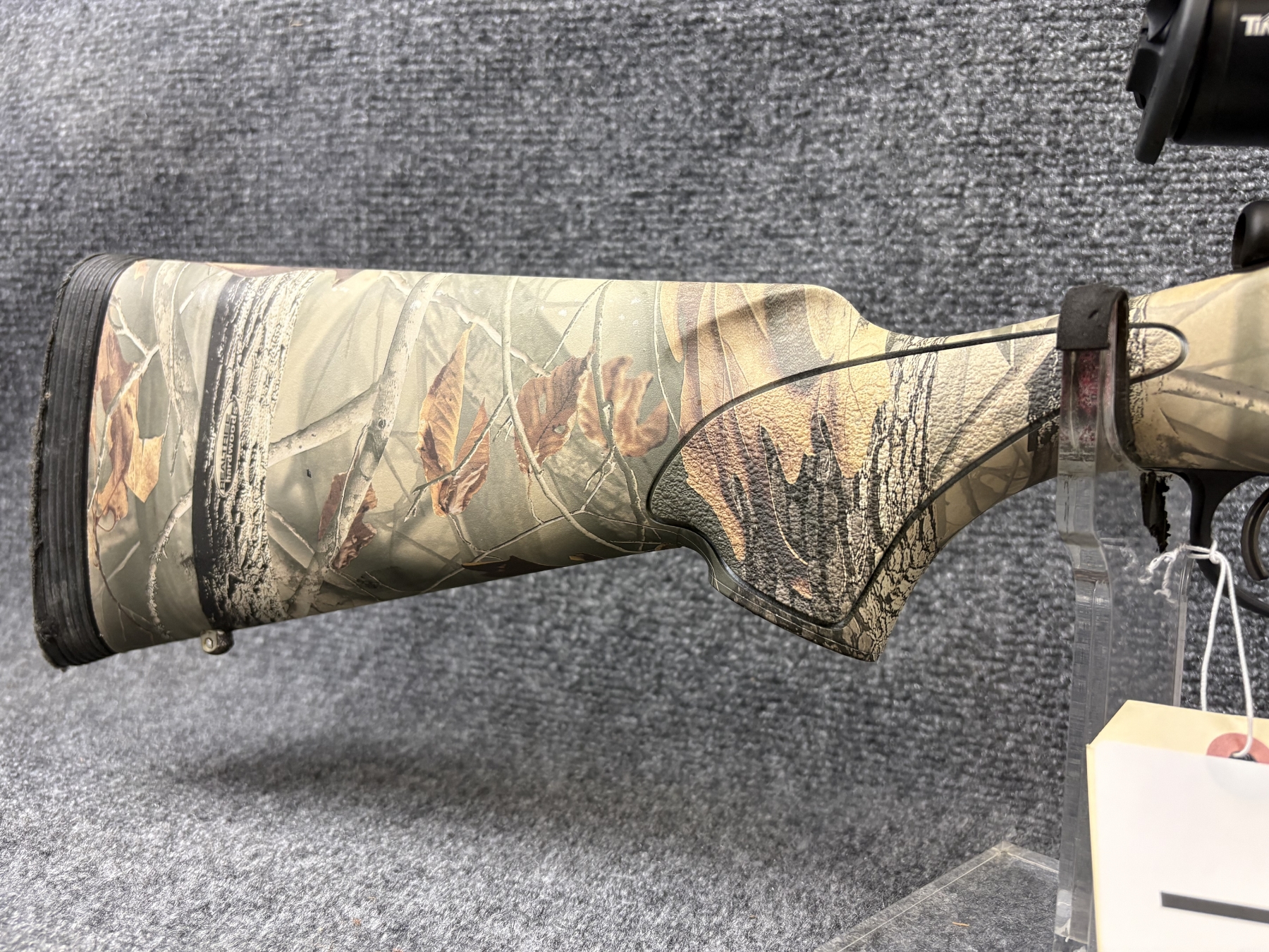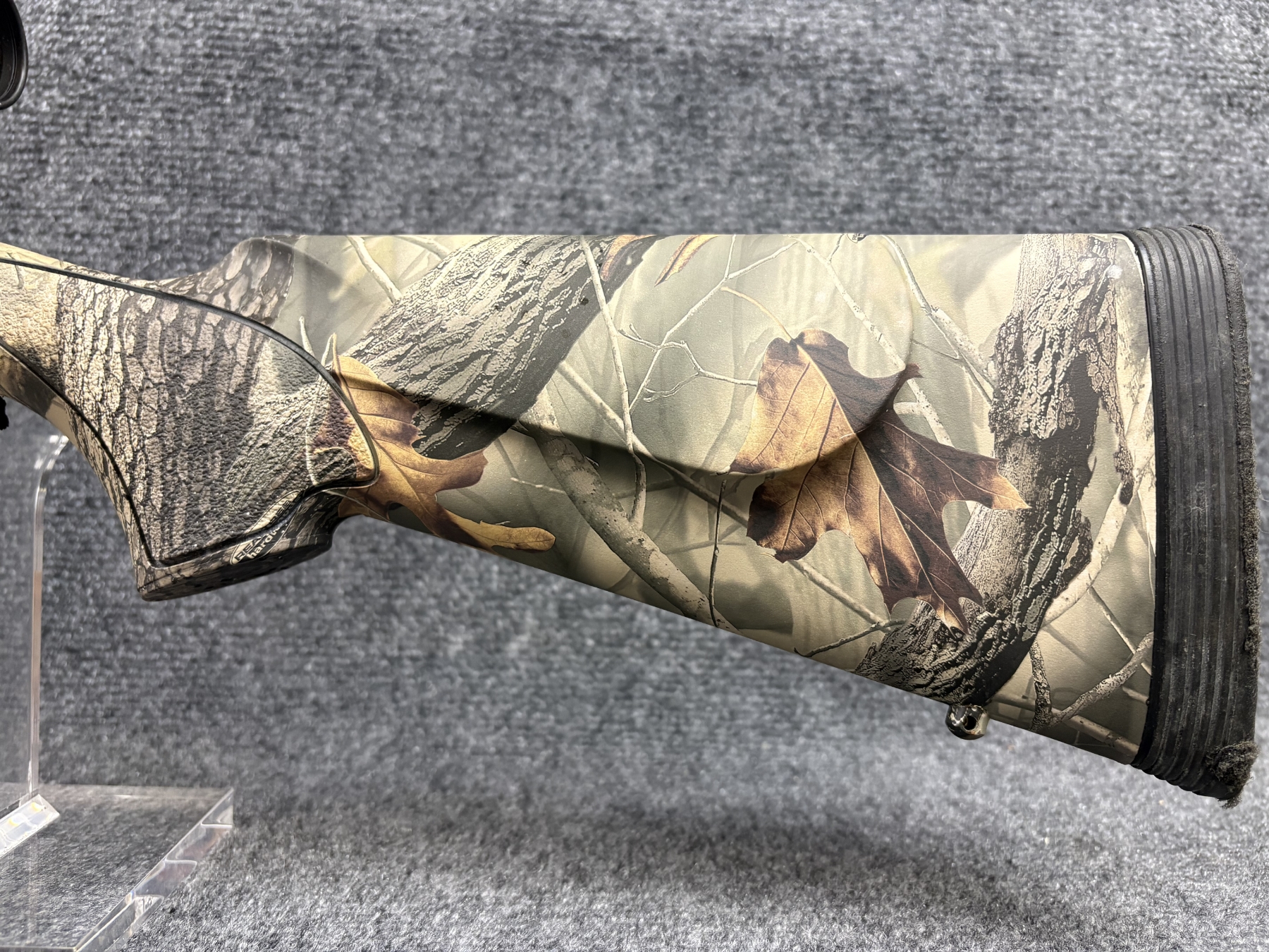 Only shallow surface rust on barrel. Composite camo stock. Burris 3-8x scope with Boone and Crocket aperture.