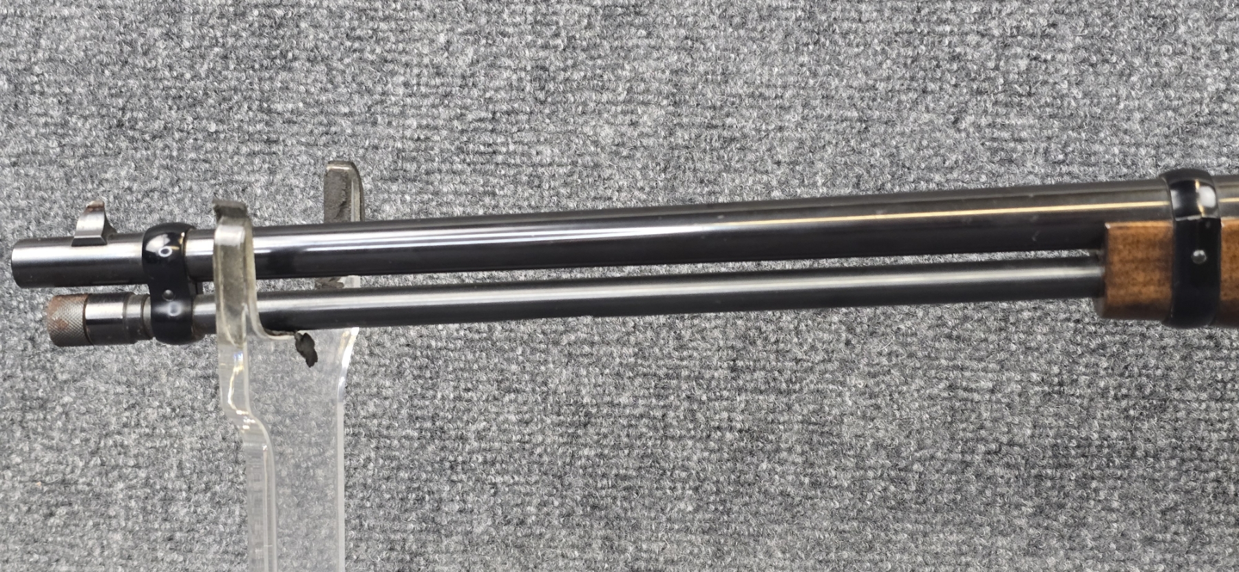 1 rust blemish on the mag tube. No tube dents. Comes with a Baush and Lomb 2.5-8x scope.