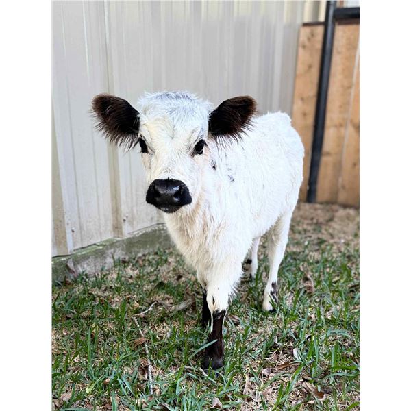NeviBelle- Micro Mini High Park Heifer.  Currently on the bottle.  Sired by Santiago and out of a micro mini black highland cow.  TINY!  This heifer is non chondro but still so small. Born at 37lbs and just shy of 21” tall. DOB 8/4/2025