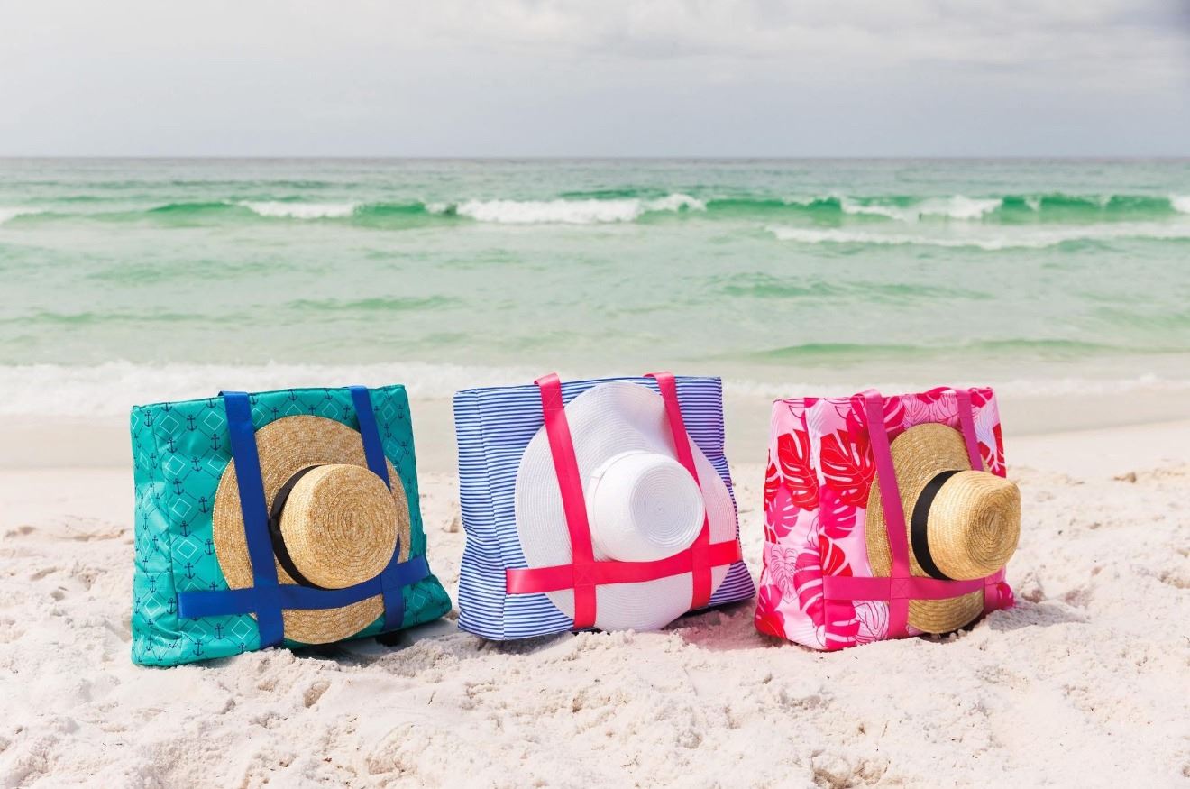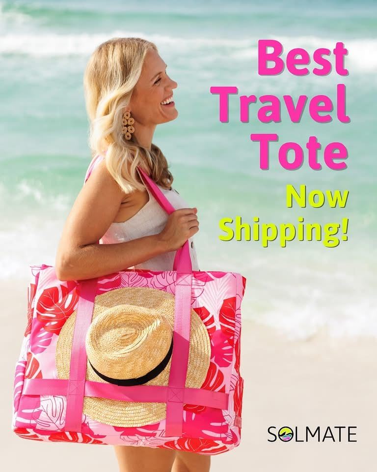 Solmate Beach tote bag and pink and red Stanley drinking cup