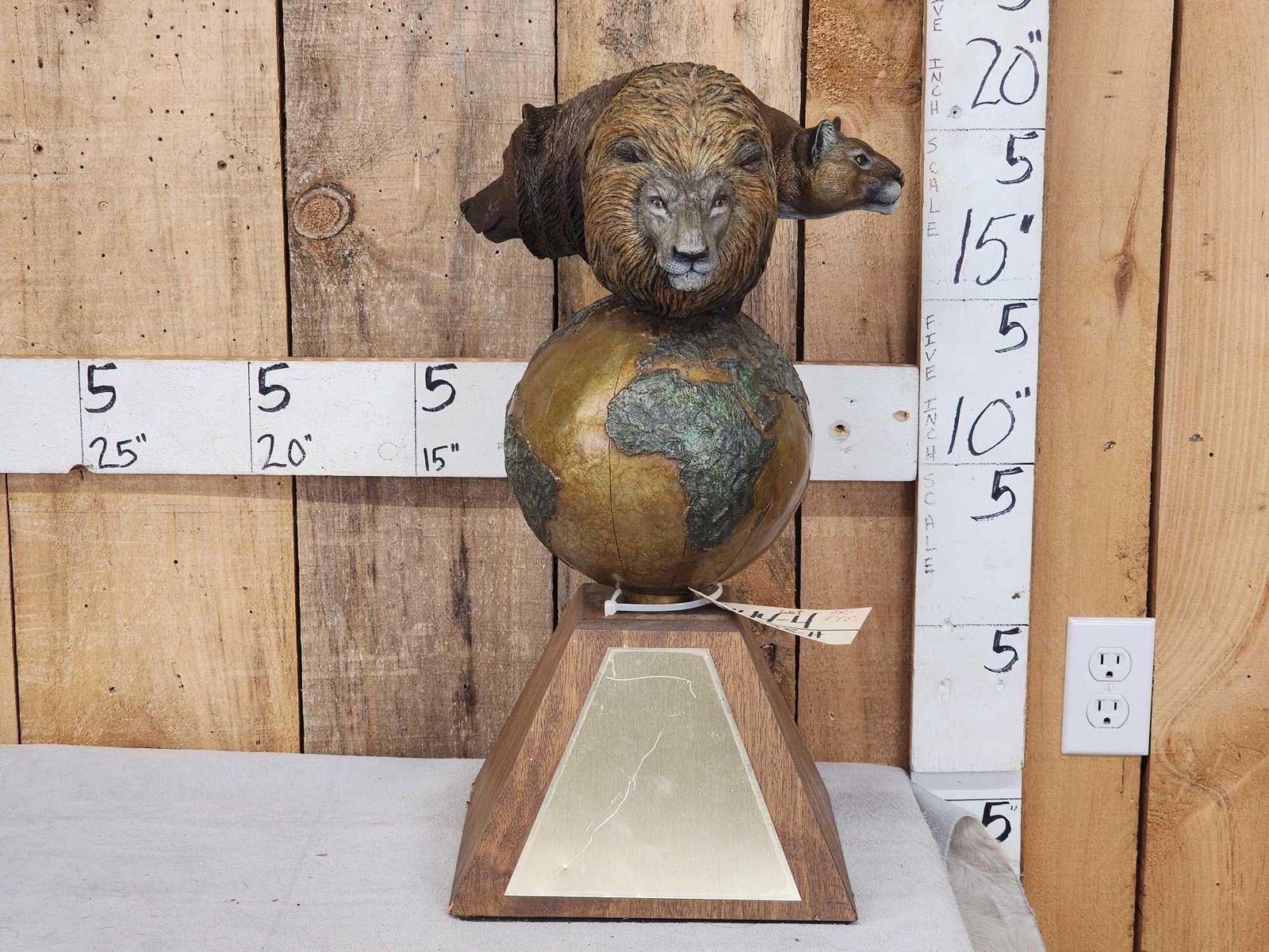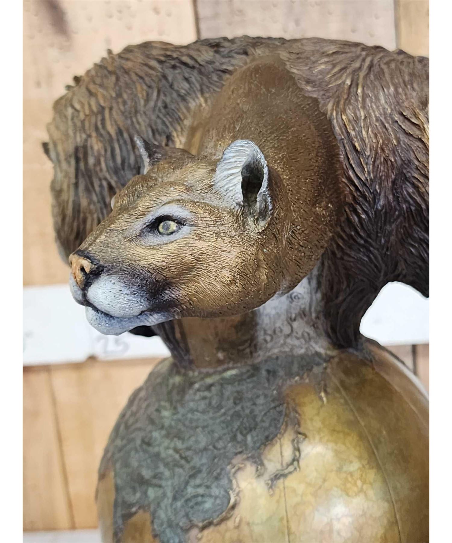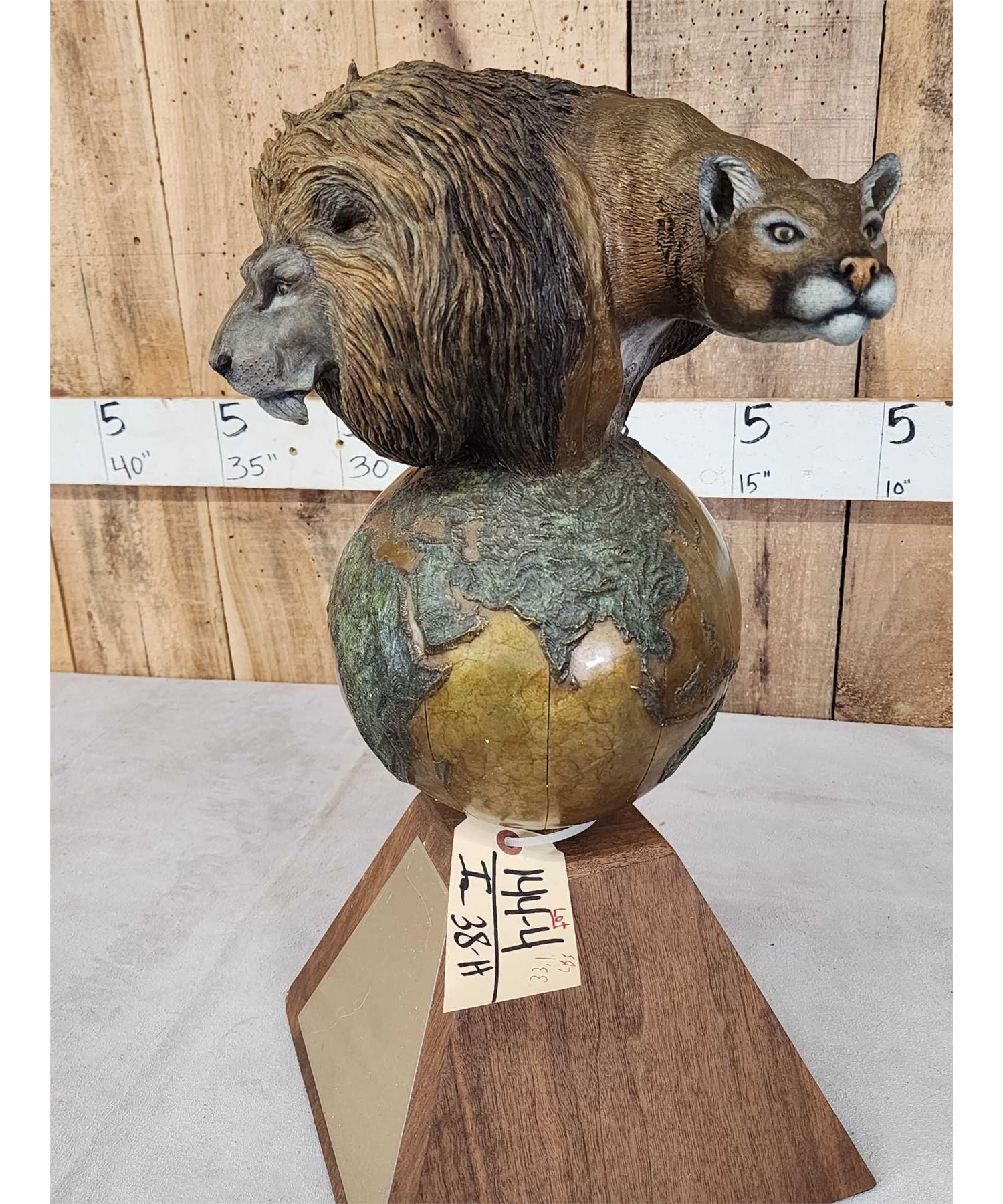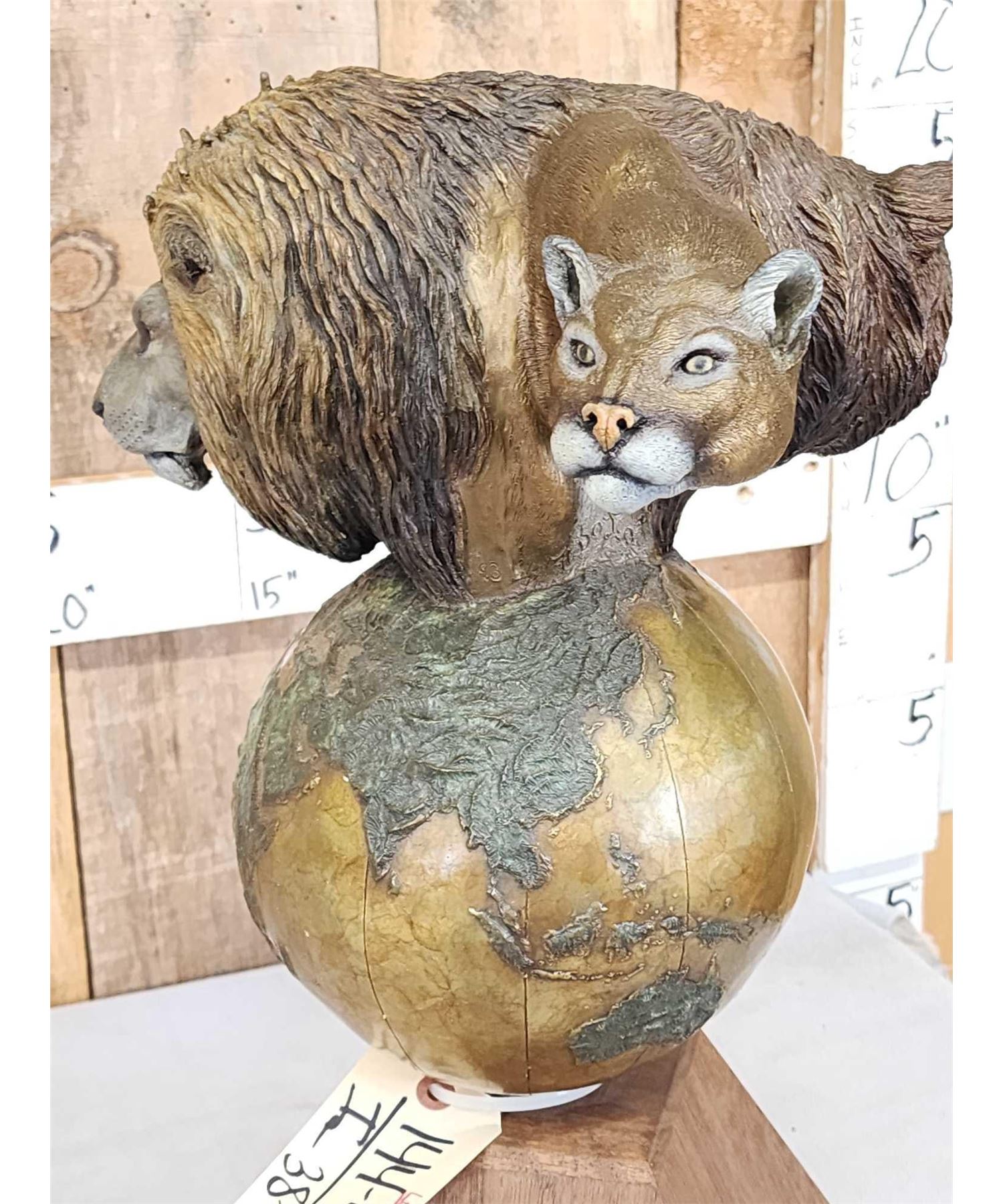 144.4 Awesome piece featuring African Lion , Grizzly Bear , Mountain Lion mounted on the world globe signed by world renowned artist Fred Boyer weight 33.1 Lbs