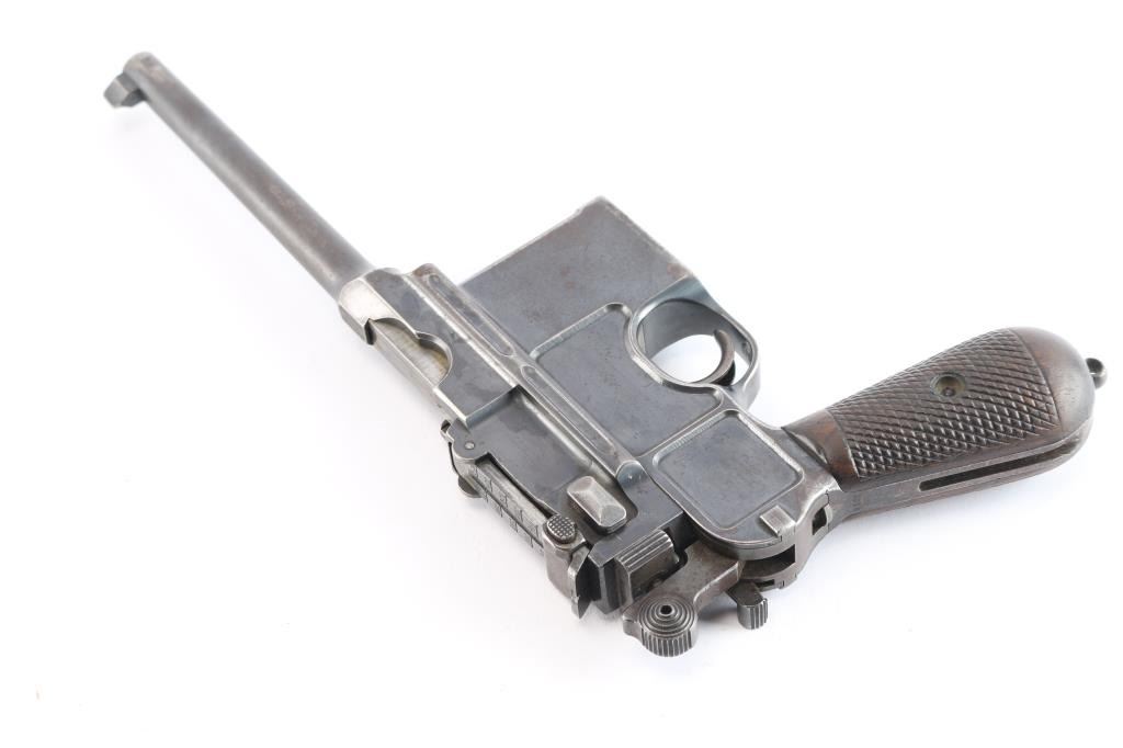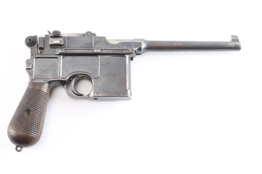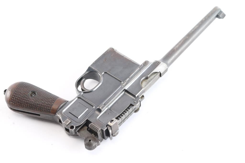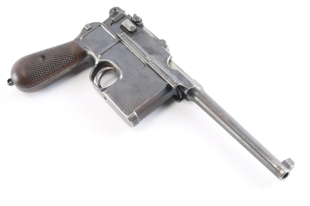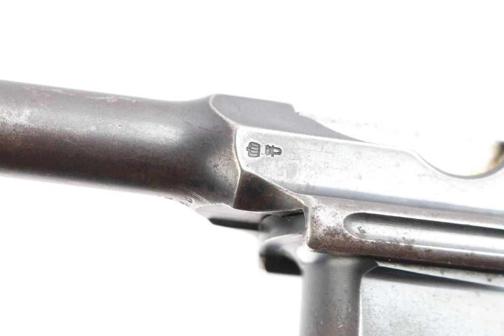 'Broomhandle' German commercial semiautomatic pistol. 'Cone Hammer'. Manufactured 1897. Features blued finish, hand checkered wood grips over the grooves, period done. 5.5" barrel, blade front & tangent rear sights, 50-500 meters, fixed 10 round magazine, manual thumb safety, lanyard stud (missing the ring) at butt. Backstrap slotted for shoulder stock. Bore is good condition,bright, strong rifling, lightly frosted. blued finish is about 70%, dulled somewhat with bare metal on high spots, handling/edge wear, some very light scattered pin-prick pitting. Grips are very good condition. Markings are crisp/clear, including "Waffenfabrik Mauser Oberndorf a N" on top of chamber flat, crown over 'U' on left barrel extension, 'antler' proof on right barrel extension (1897-1899) and German proof marks on the underside of barrel. Mauser banner not present. Serial numbers match where observed including stamped on the inside of both grip panels. Serial number not on barrel, correct for this time period. Action is smooth/crisp.