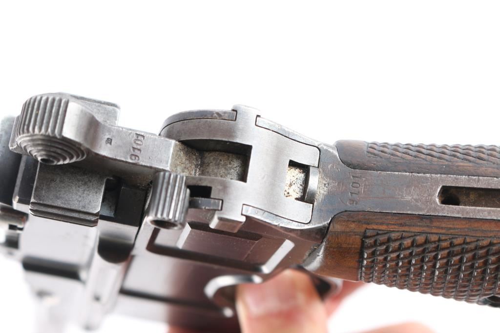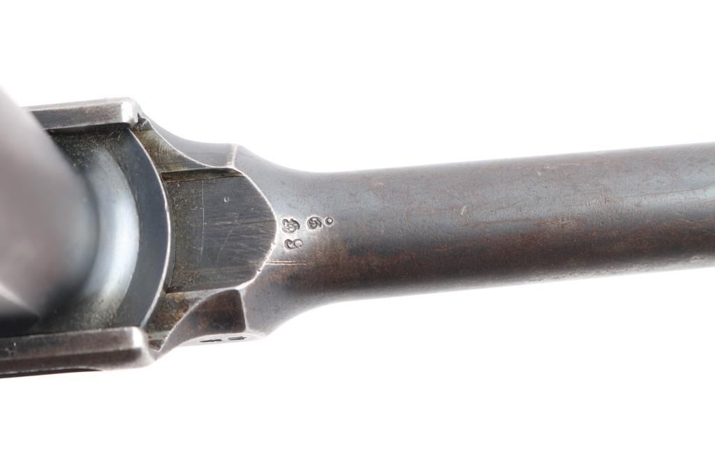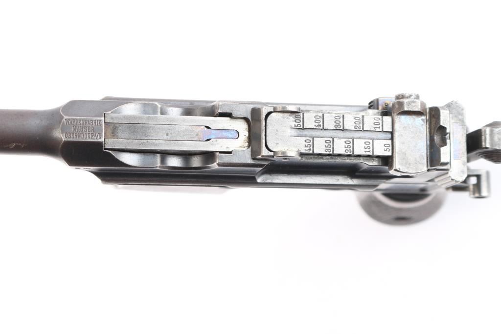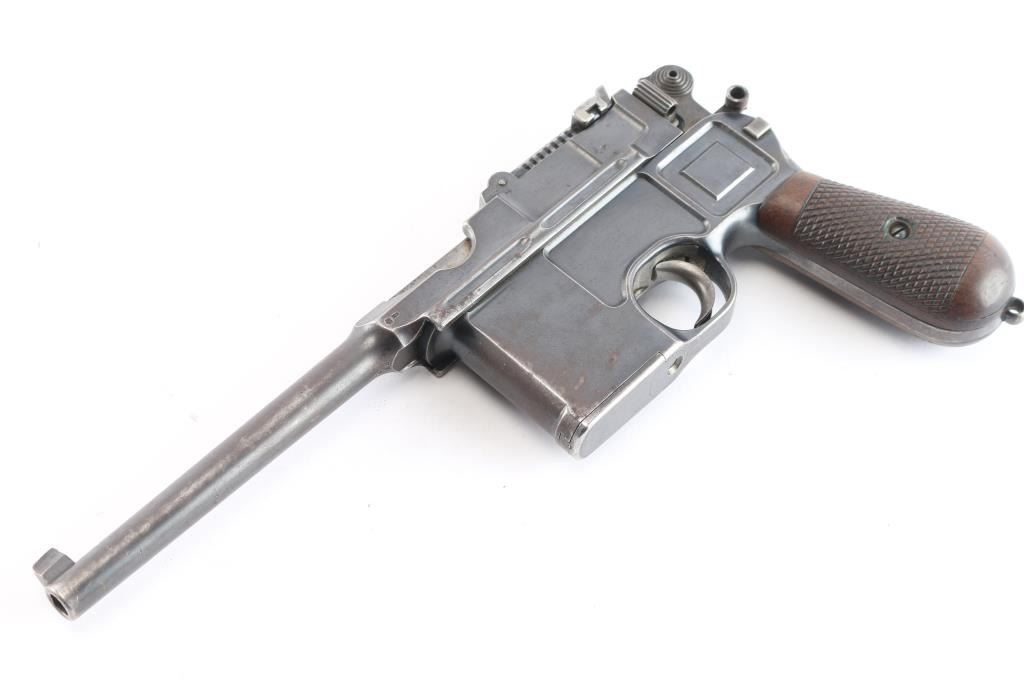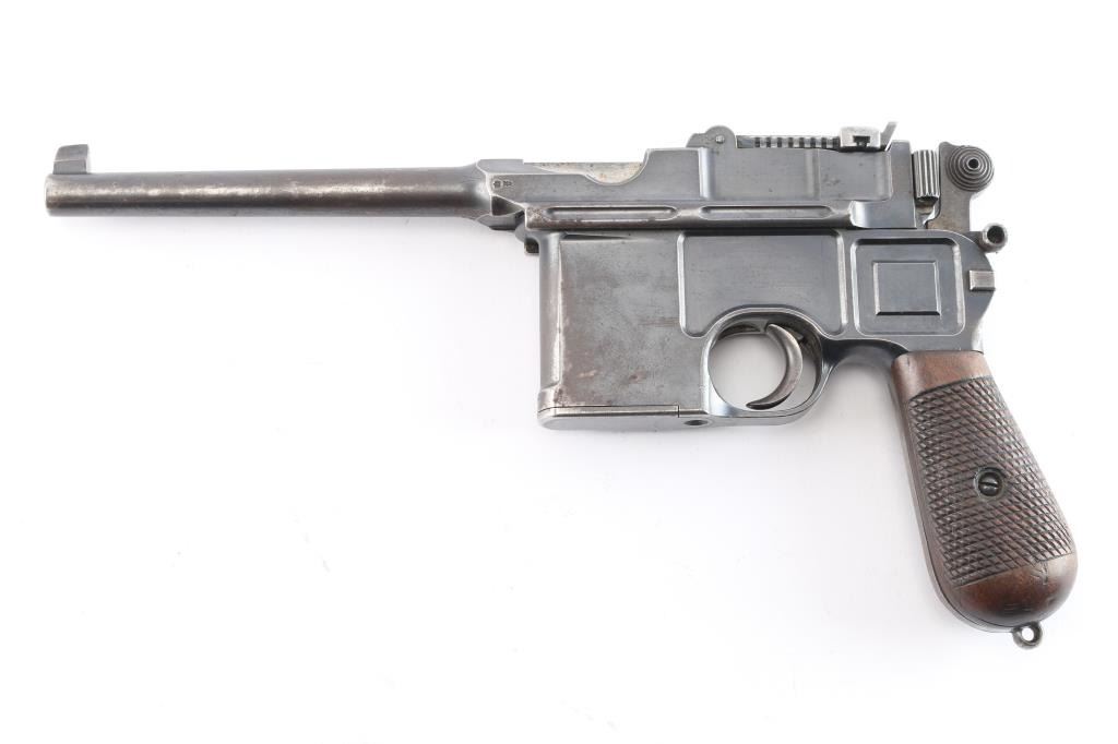 'Broomhandle' German commercial semiautomatic pistol. 'Cone Hammer'. Manufactured 1897. Features blued finish, hand checkered wood grips over the grooves, period done. 5.5" barrel, blade front & tangent rear sights, 50-500 meters, fixed 10 round magazine, manual thumb safety, lanyard stud (missing the ring) at butt. Backstrap slotted for shoulder stock. Bore is good condition,bright, strong rifling, lightly frosted. blued finish is about 70%, dulled somewhat with bare metal on high spots, handling/edge wear, some very light scattered pin-prick pitting. Grips are very good condition. Markings are crisp/clear, including "Waffenfabrik Mauser Oberndorf a N" on top of chamber flat, crown over 'U' on left barrel extension, 'antler' proof on right barrel extension (1897-1899) and German proof marks on the underside of barrel. Mauser banner not present. Serial numbers match where observed including stamped on the inside of both grip panels. Serial number not on barrel, correct for this time period. Action is smooth/crisp.