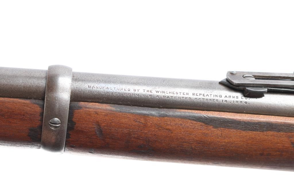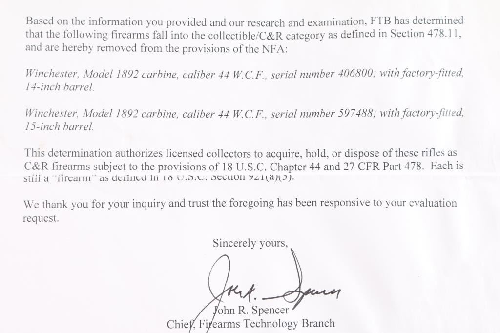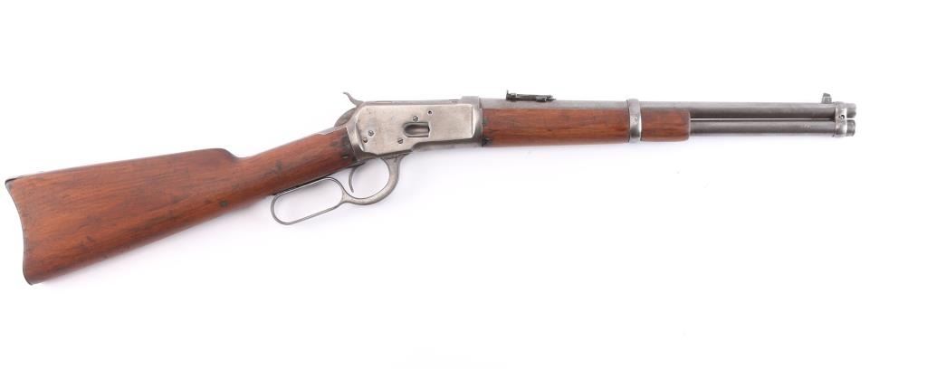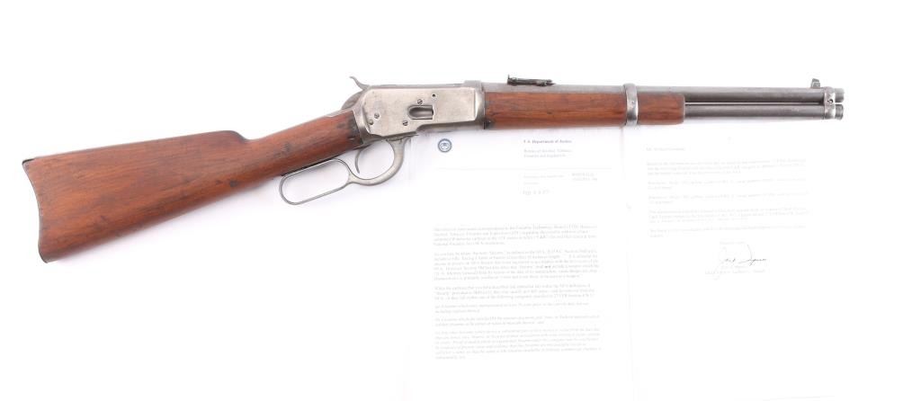 Rare Documented Factory 15 Inch Barrel Winchester Model 1892 Lever Action Trapper Saddle Ring Carbine with ATF Exemption. Manufactured in 1910 with standard barrel/tang markings, Winchester trade mark on barrel & receiver, full length tube magazine, original saddle ring in place. Fitted with pinned blade front and sliding ladder v-notch rear sights. Steel carbine buttplate, smooth walnut forearm and straight wrist shoulder stock, two barrel bands. The letter from the Bureau of Alcohol, Tobacco and Firearms lists this carbine as being removed from the purview of the National Firearms Act and classified as a curio and relic. The lever action is smooth, bore is overall good/bright, good rifling with some scattered light pitting, the wood is very good with some minor scratches/dings, hay have been lightly sanded at some point and the blue finish has turned a gray/brown patina with age & handling. The Winchester stampings are crisp/clear. **Modern Firearm**