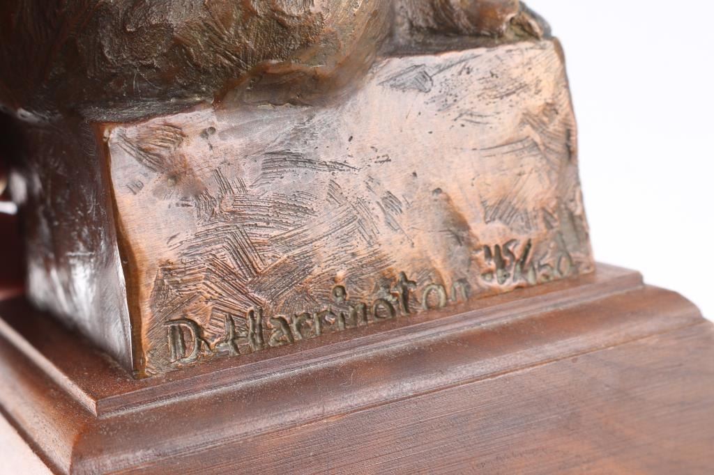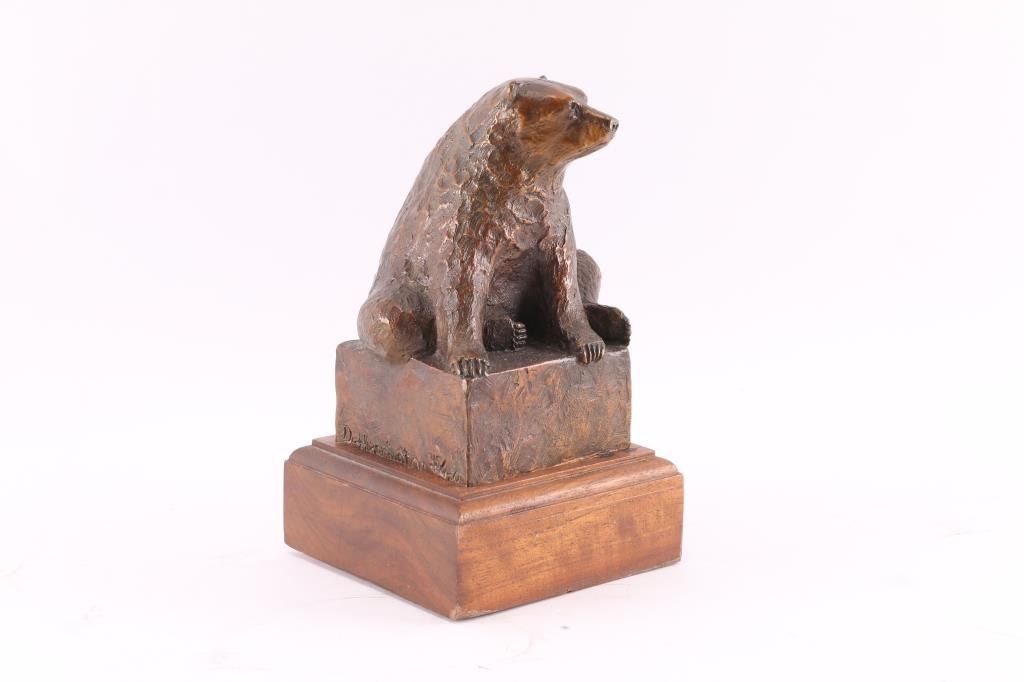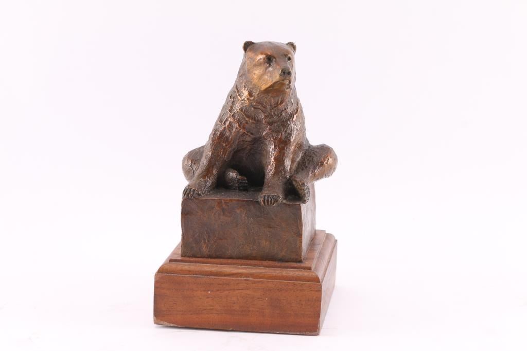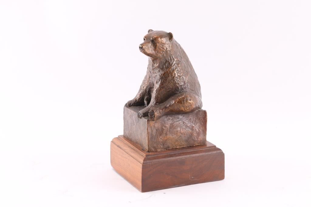 By Dennis Harrington, signed on side and numbered 45/50. Rendering of bear sitting casually on bronze square. Dennis Harrington was born and raised in Bozeman, Montana. Initially, Harrington wanted to be an Air Force pilot but an elective art class drastically changed his perspective and he enrolled in the Seattle Art Institute. Harrington studied illustration and didn’t begin using clay until a few years past graduation. Sculpting the west became a full time profession for him in 1990. "Guardian Spirit" is Harrington's first notable bronze and is on display at Bozeman’s Gallatin Airport. This bronze is on a 4 1/4" squared wood stand; sculpture and stand measure 7 1/2" tall.