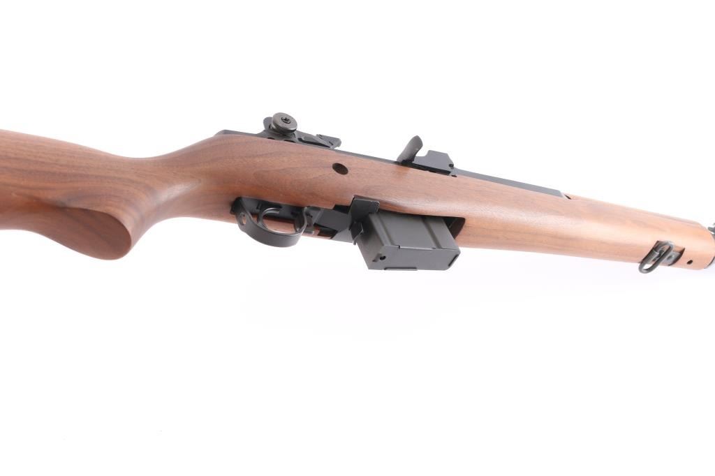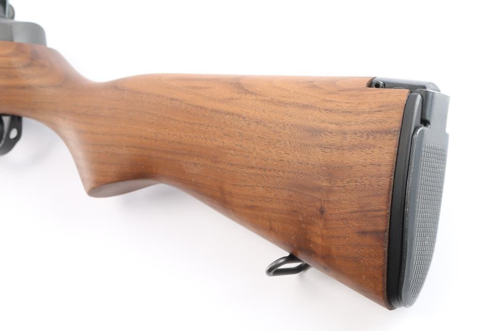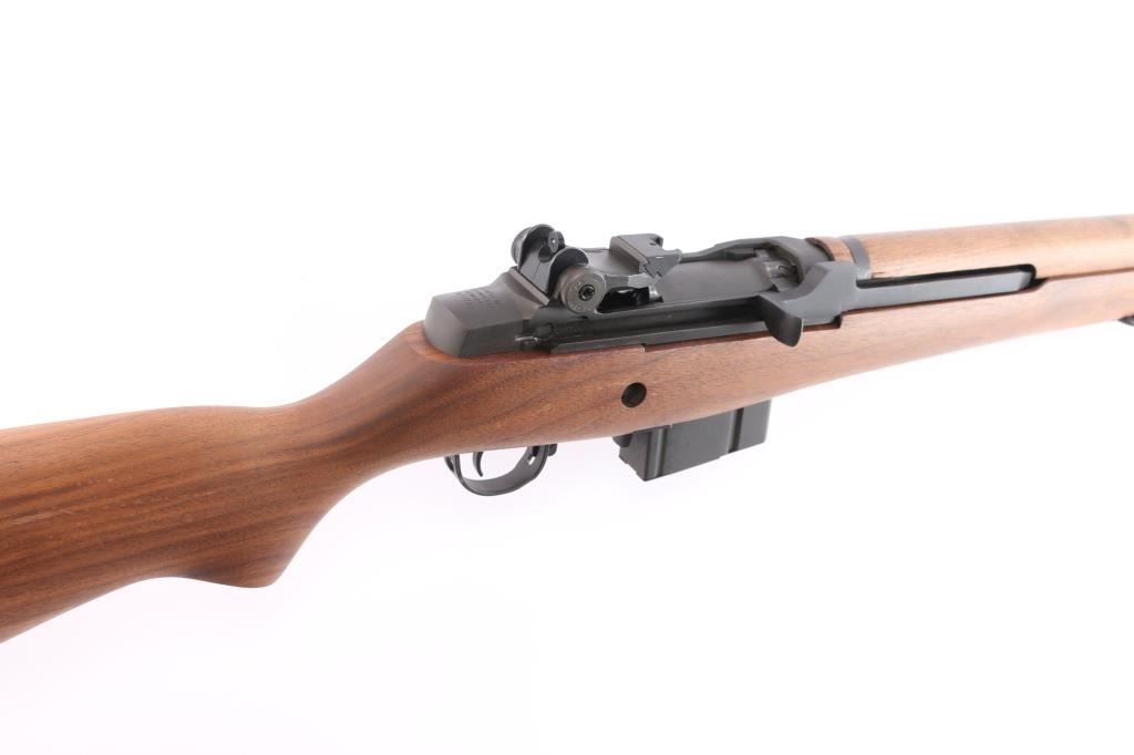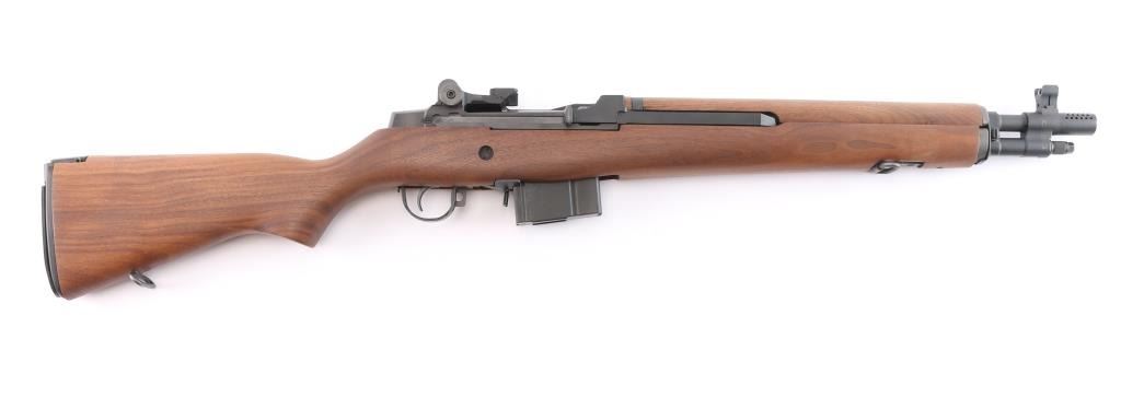 ‘Scout Squad’ Semi-automatic scout variant of the gas operated M14 battle rifle chambered in .308 Winchester, manufactured in Geneseo, IL. Features a parkerized finish, 18" barrel, ported muzzle break , shrouded .062 NM blade front sight, adjustable rear aperture sight, smooth NM tuned two-stage trigger, manual safety, 10 round magazine, stripper clip guide, oversized walnut semi-pistol grip shoulder stock and handguard with sling swivels & flip-up buttplate w/ trapdoor compartment. Rifle retains approximately 99% of its original finish showing very little wear. Action is smooth, the bore is excellent and the wood stock is excellent. Comes with a Springfield Armory soft carry case with owners manual/paperwork.