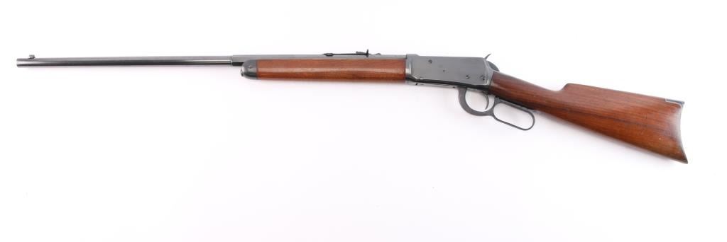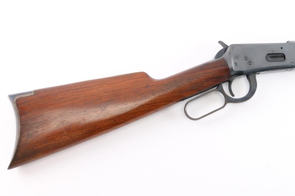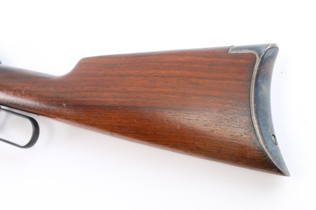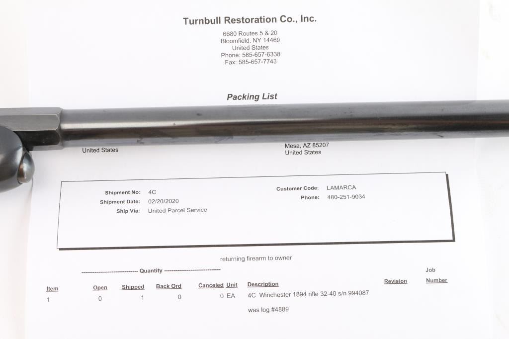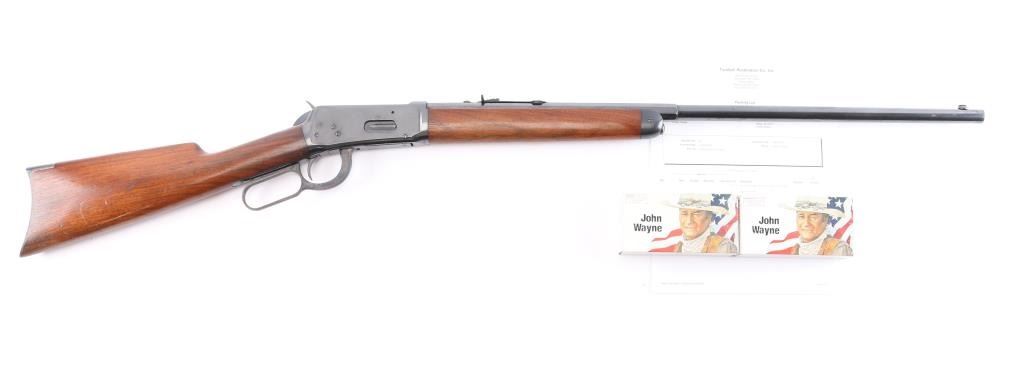This is a Turnbull Restoration, Manufactured 1925. Winchester model 1894 rifle chambered in .32-40. 26" half round, half octagonal barrel with dovetailed blade/bead front, elevation adjustable rear sporting sights. "Nickel Steel" marked. Blue finish with case colored finger lever and crescent buttplate. Smooth straight wrist shoulder stock and forearm. Bore is excellent/bright, wood is overall excellent with a few very minor dings, action is smooth and the finish is excellent. Winchester tang, barrel and trade marks are crisp/clear. Comes with Turnbull Restoration Co. packing letter with this rifle, matching serial number. Also included are two boxes of Winchester John Wayne edition .32-40 165Gr. SP cartridges containing 20 each.