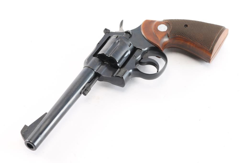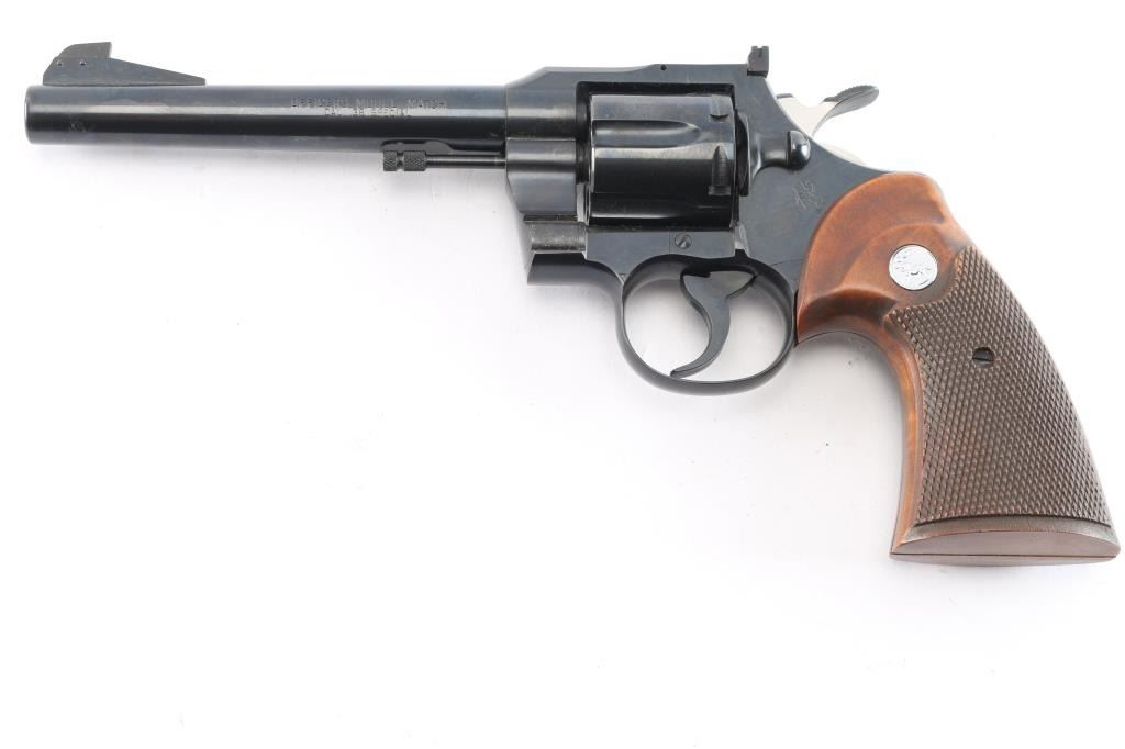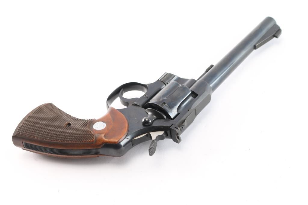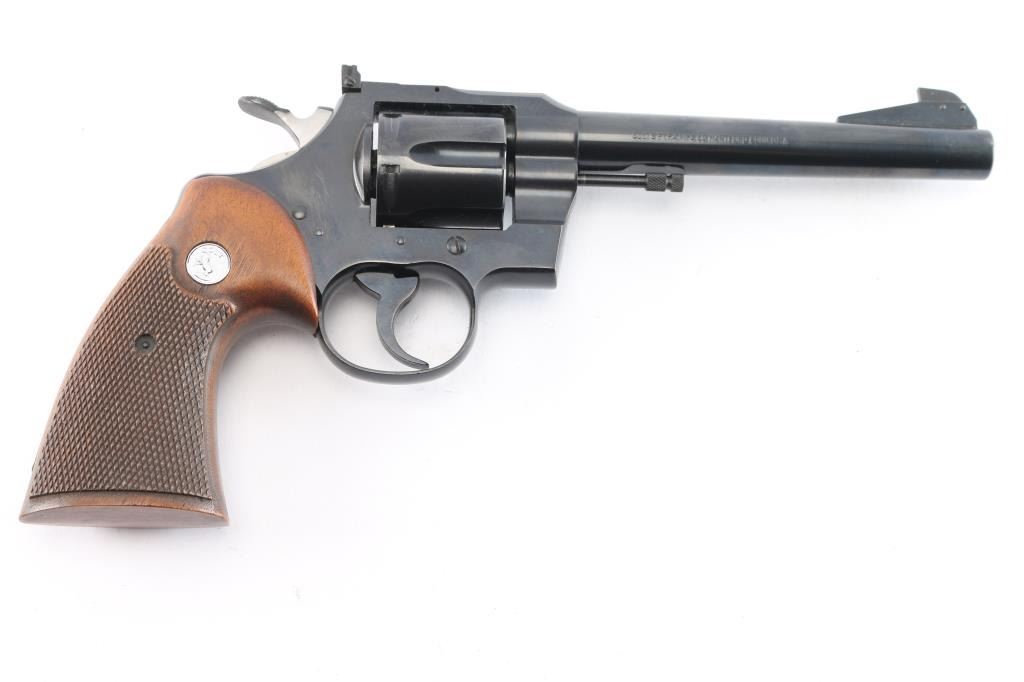 Double action target revolver manufactured circa 1962. Built on a J frame. Features blued finish, sides of hammer polished, wide knurled hammer spur, serrated trigger and straps, checkered wood target type grips with silver color Colt medallions, 6" barrel with raised Partridge front and Accro adjustable rear sights, un-shrouded ejector rod. Bore is excellent/bright. Retains 99% finish with few handling marks. Grips are excellent. Action is smooth/crisp.