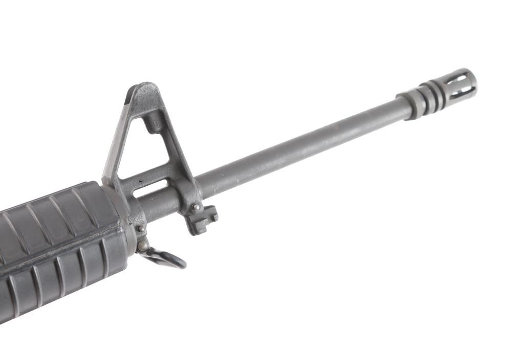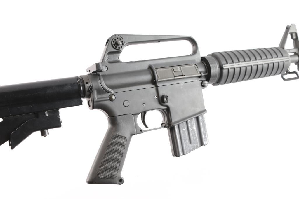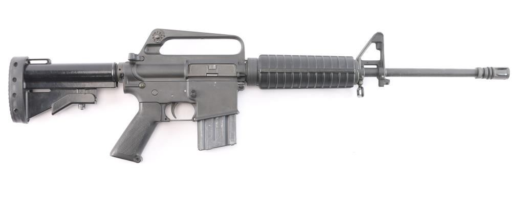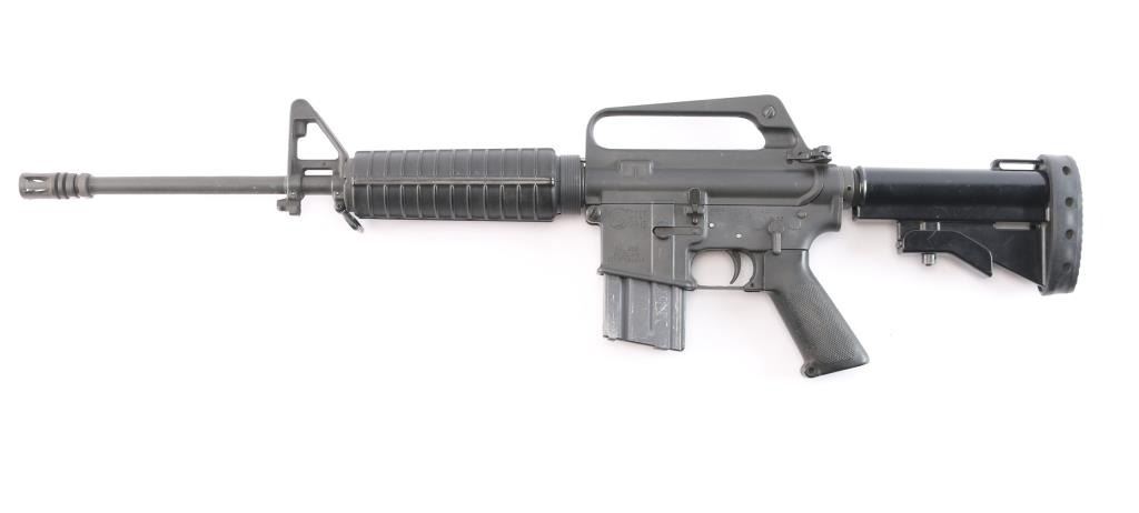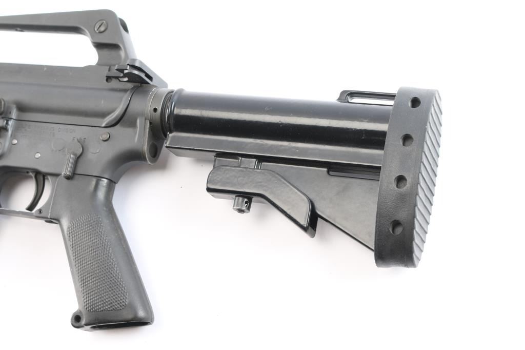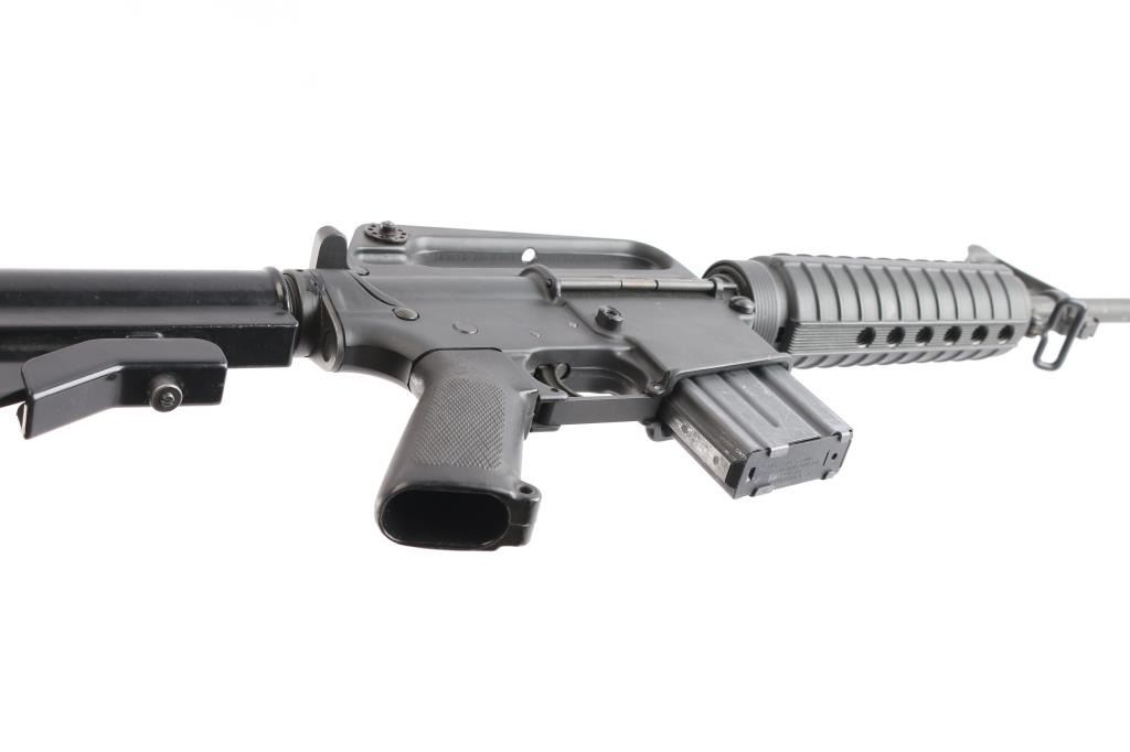 'R6001' Semiautomatic rifle manufactured circa 1985, last year of production. The R6001 SP1 Carbine is the carbine-length version of the R6000 SP1. Features parkerized finish, black plastic furniture, two position collapsing stock with slot for sling, round carbine hand guards, 16" lightweight barrel, 6 flute flash suppressor, bayonet lug, adjustable sights (front post sight with protector ears, rear L-flip peep), early "slick side" A1 type upper receiver without forward assist, spring loaded ejection port cover, early style lower receiver without fence around magazine release, dual screw style front take down pin, manual safety, sling swivel on front sight base. Barrel appears earlier 1-12 twist, hard chrome lined, marked "C MP CHROME BORE". Bore is very good condition. Overall external appearance is very good with few blemishes, retains 95% finish, with minor edge losses, scratches,Plastic furniture is very good condition with scuffs and other minor blemishes. Includes one 20 rd magazine, black nylon web sling.