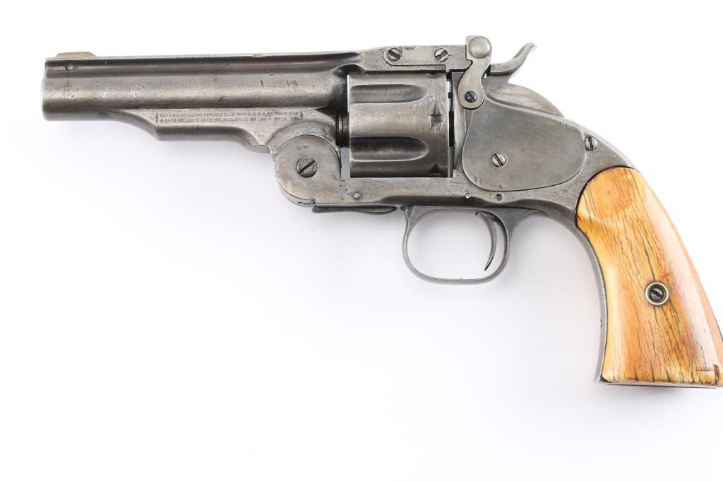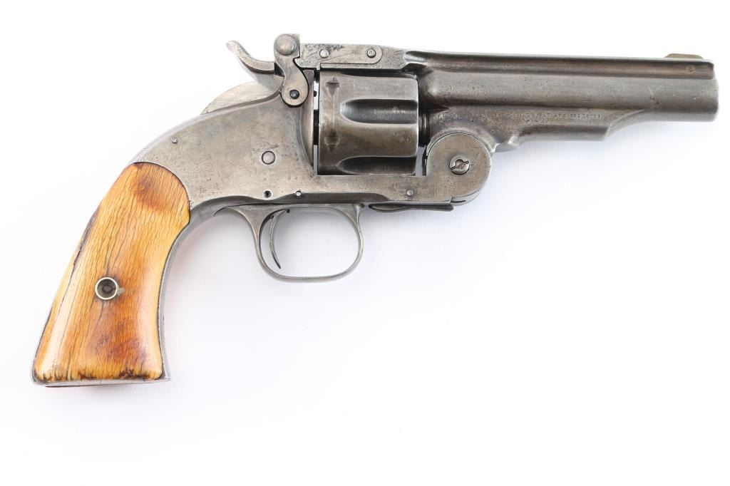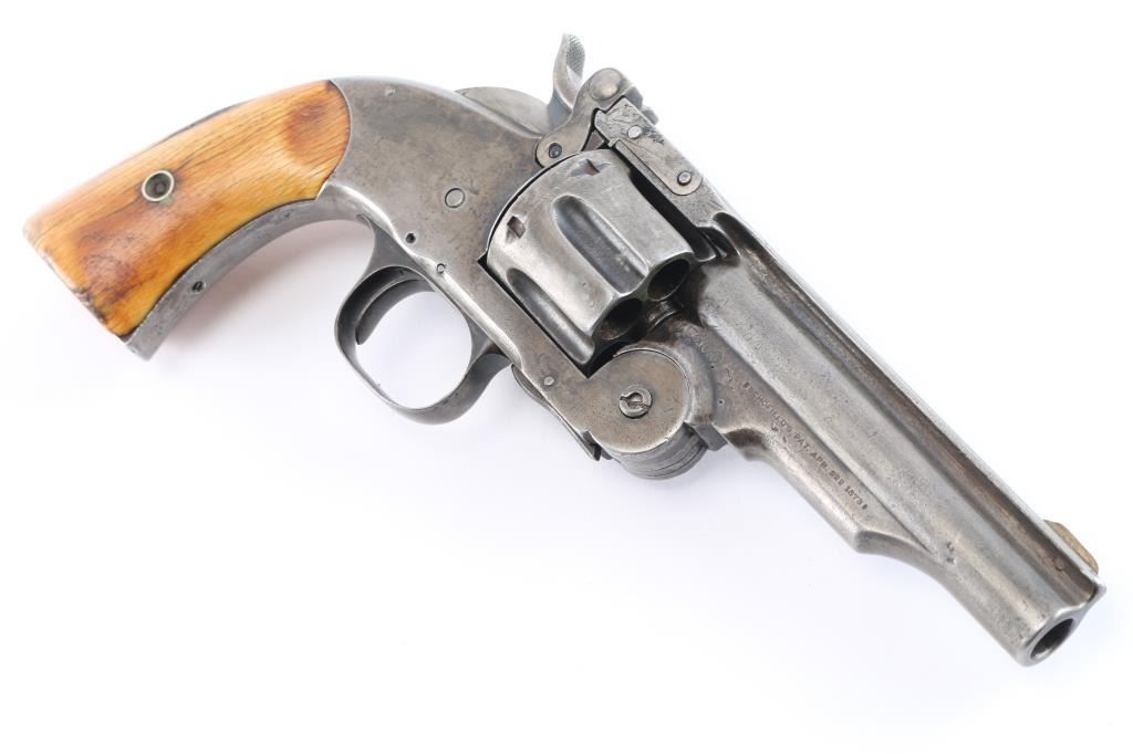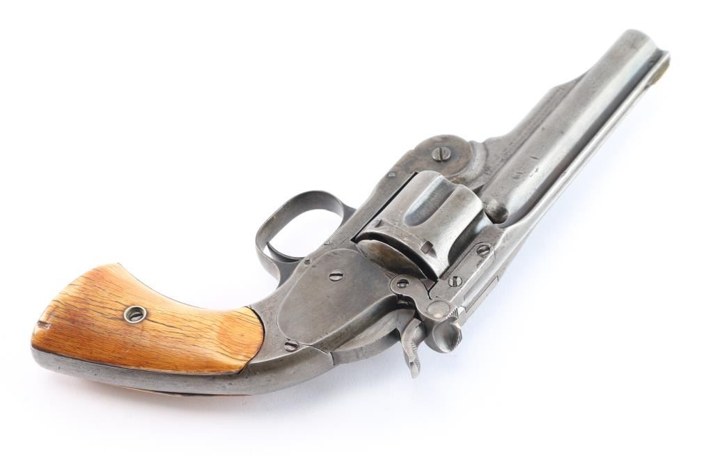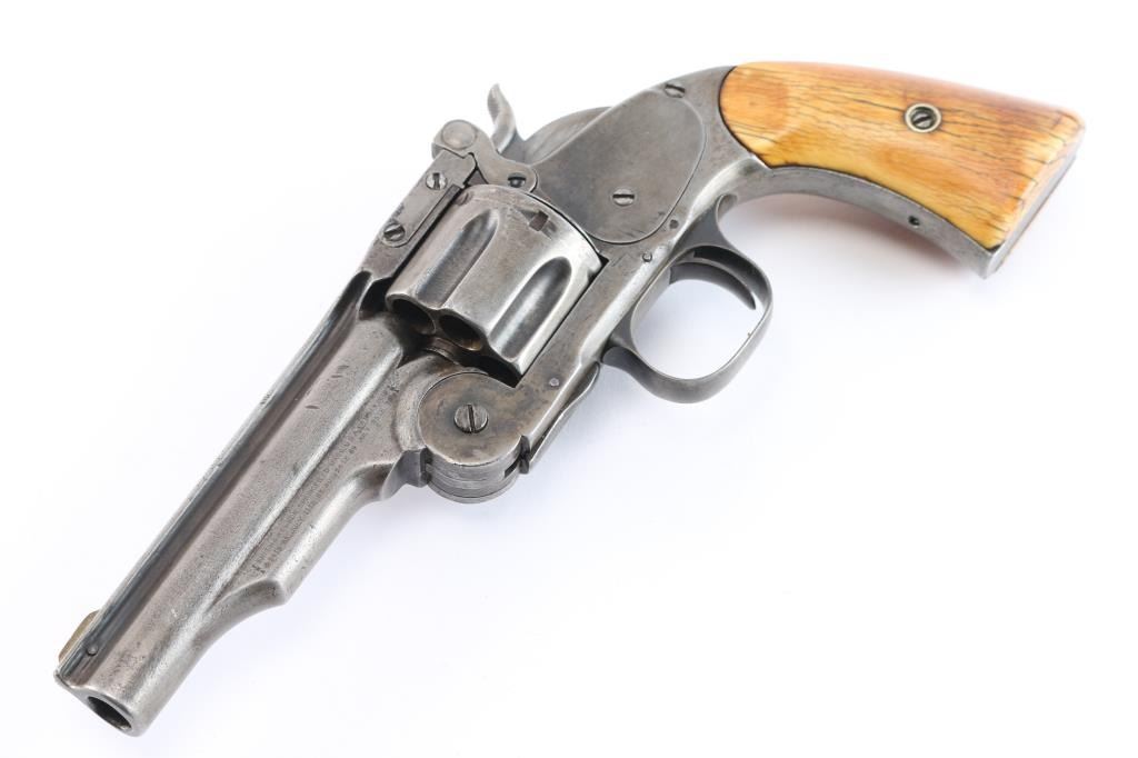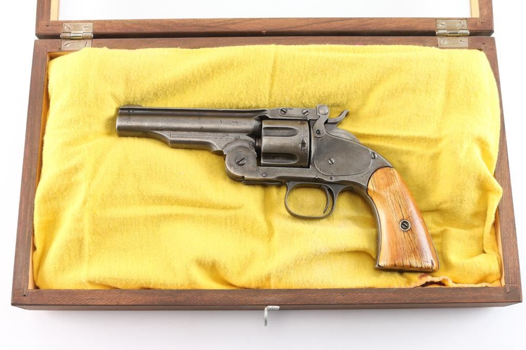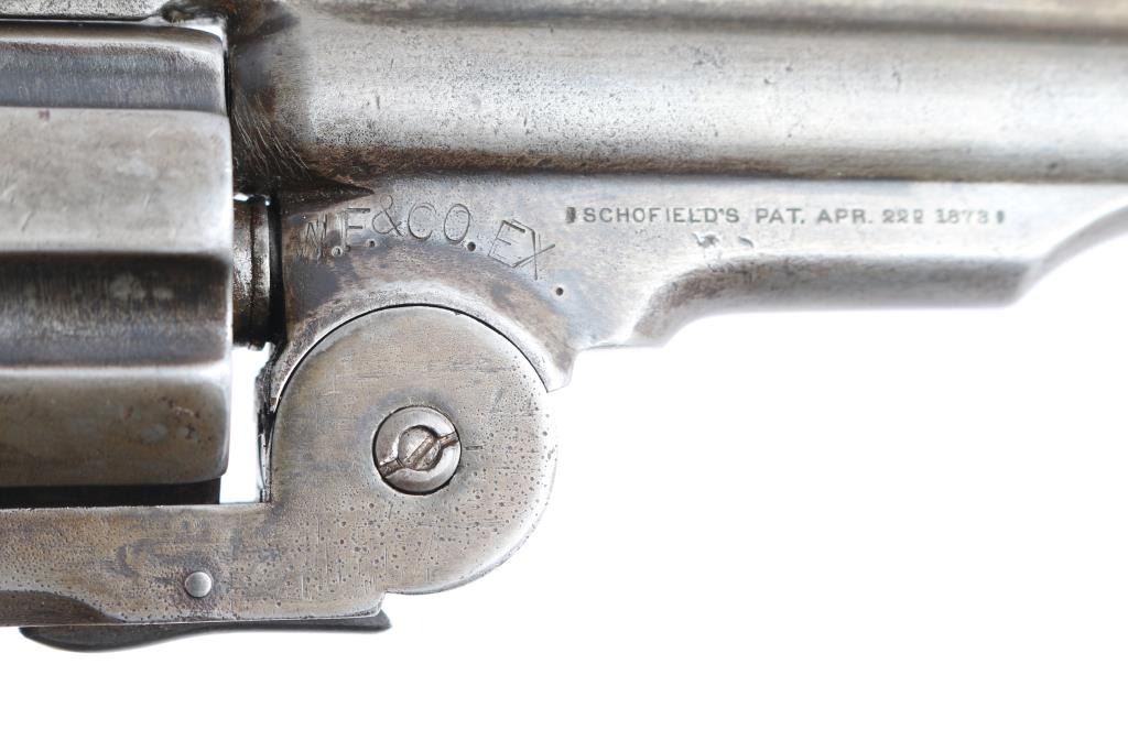 Smith & Wesson "2nd Model Schofield" No. 3 revolver in .45 Smith & Wesson Caliber. ( Second Model features a large, raised circle at the top of the latch), "W.F. & CO.. EX." marked top break single action revolver manufactured circa 1876-77, rare commercial model, approximately 650 revolvers produced without martial markings with a total of 5,934 Second Model Schofield’s manufactured. Lugged barrel has been shortened to 4 1/2" with sighting rib, pinned brass front sight blade, v-notch on lever, S&W address and patent dates in 2 lines on left barrel lug, 1 line 1873 Schofield patent date on right lug, with the Wells Fargo stamp to the rear of it. Serial number stamped on the heel, with matching number stamped on cylinder. The problem with the Wells Fargo stamp is known examples serial numbers are under 6000, they shortened the 7" barrels to 5" not 4 1/2" and the original stamps were small, fitting under the patent dates and followed by the re-stamped serial number. S&W markings are clear, two cock hammer action is crisp/tight, star extractor works well, bore is fair, strong rifling with some scattered light pitting, the blue finish is about 15% with handling/holster wear with the rest turned a gray color, barrel locks up tight. The revolver is fitted with a period of use set of nice aged ivory grips with decades of wear and patina, good fit. Comes in a glass covered display case.