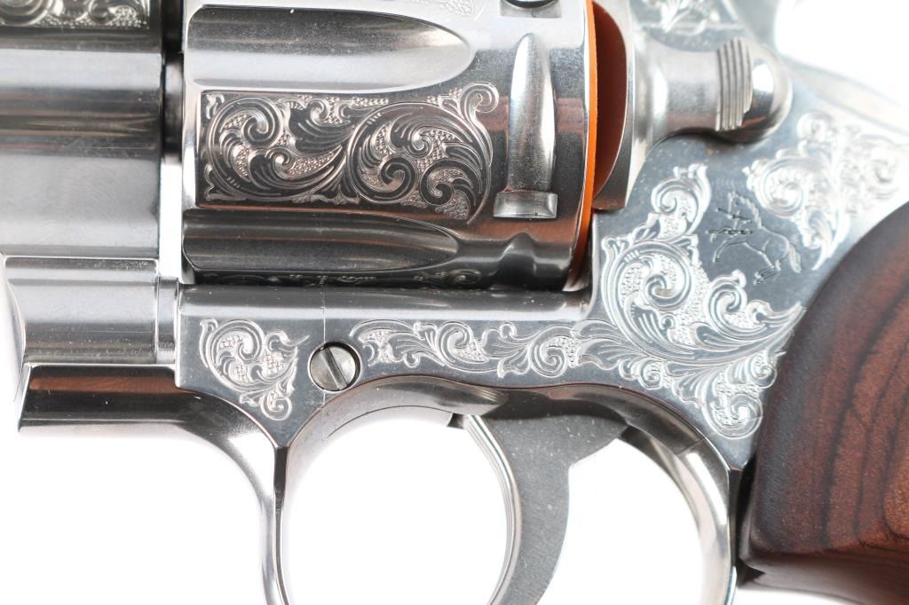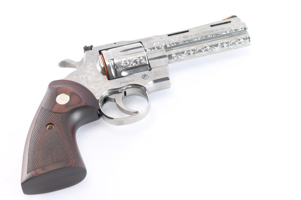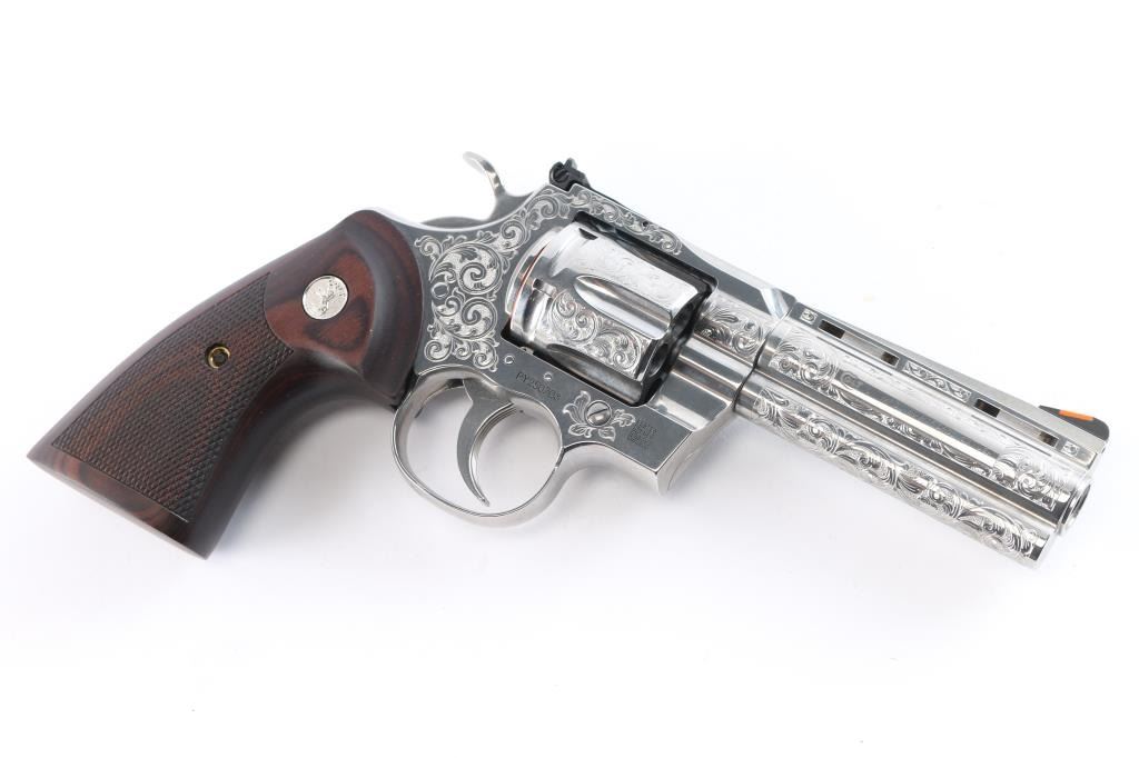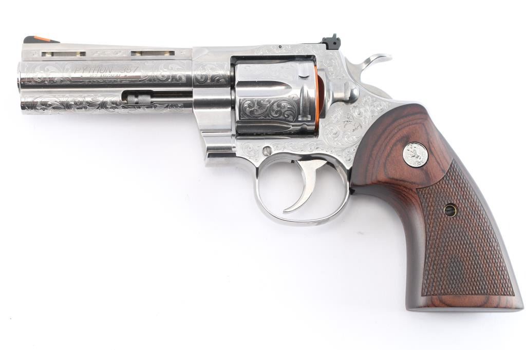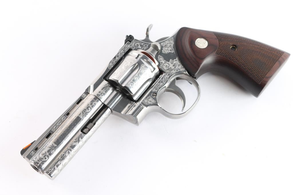‘2020, Davidsons Exclusive’ Premium quality medium frame double action revolver chambered in .357 Magnum. Manufactured in Hartford, Connecticut and machine engraved by Automated Finishing Co. with 75% coverage scroll patterns & punch dot background. The updated 2020 Python has been fully redesigned using a new rear sight with more material on the tostrap of the frame and improved action with fewer internal parts. Features stainless steel construction with a polished finish, 4.25" vent ribbed barrel with recessed crown & full underlug, ramp front sight with orange insert, fully-adjustable rear sight, fluted six-shot cylinder, serrated trigger, serrated wide hammer spur, flat-top I frame, and Altamont checkered brown laminated wood grips with silver Colt medallions. Includes the original factory hard case with matching end label, documents, hang tag and lock.. Revolver exhibits little to no visible wear. Action is smooth with a tight lock-up, the bore is excellent, and the wood grips are excellent.
