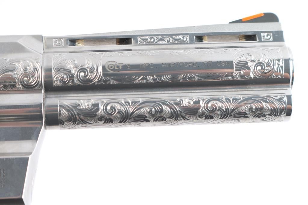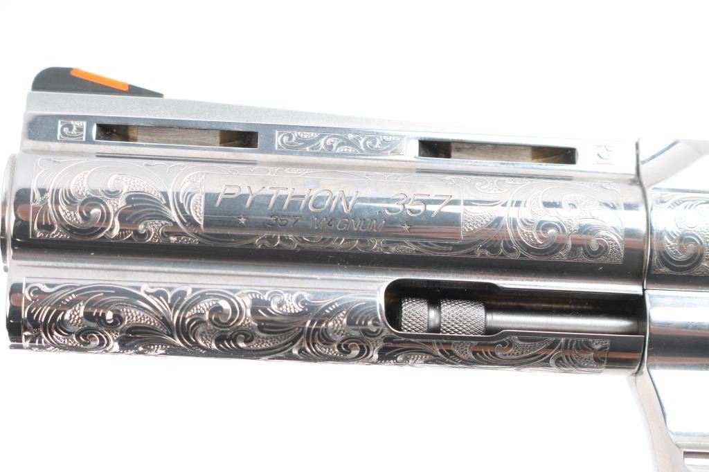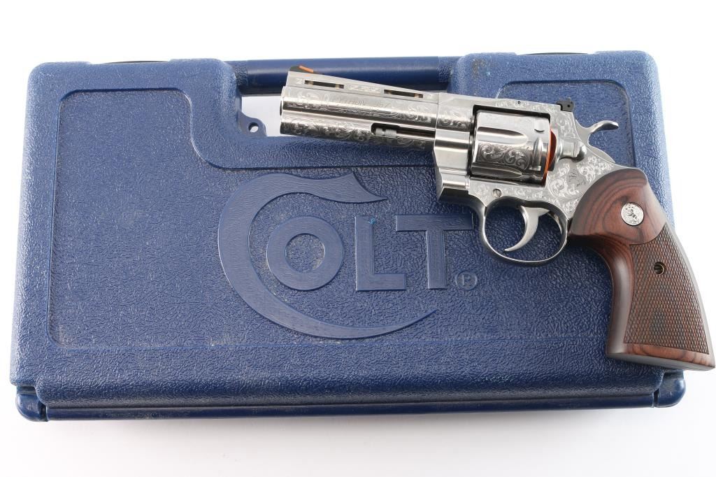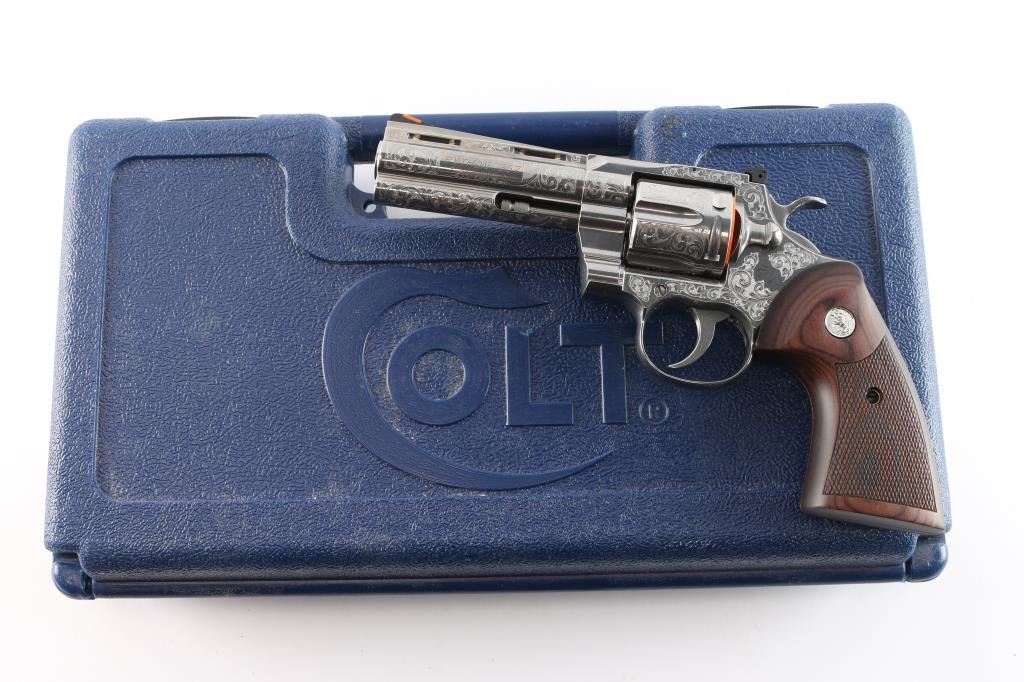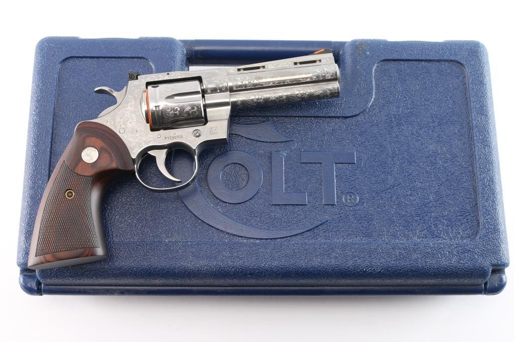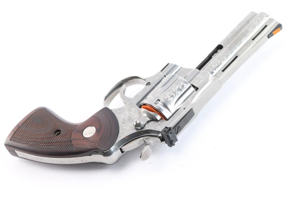 ‘2020, Davidsons Exclusive’ Premium quality medium frame double action revolver chambered in .357 Magnum. Manufactured in Hartford, Connecticut and machine engraved by Automated Finishing Co. with 75% coverage scroll patterns & punch dot background. The updated 2020 Python has been fully redesigned using a new rear sight with more material on the tostrap of the frame and improved action with fewer internal parts. Features stainless steel construction with a polished finish, 4.25" vent ribbed barrel with recessed crown & full underlug, ramp front sight with orange insert, fully-adjustable rear sight, fluted six-shot cylinder, serrated trigger, serrated wide hammer spur, flat-top I frame, and Altamont checkered brown laminated wood grips with silver Colt medallions. Includes the original factory hard case with matching end label, documents, hang tag and lock.. Revolver exhibits little to no visible wear. Action is smooth with a tight lock-up, the bore is excellent, and the wood grips are excellent.