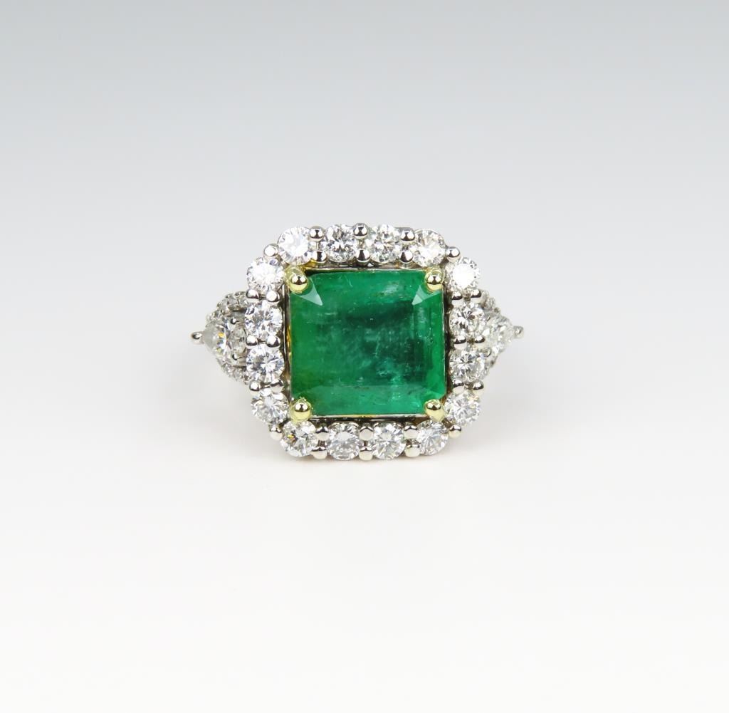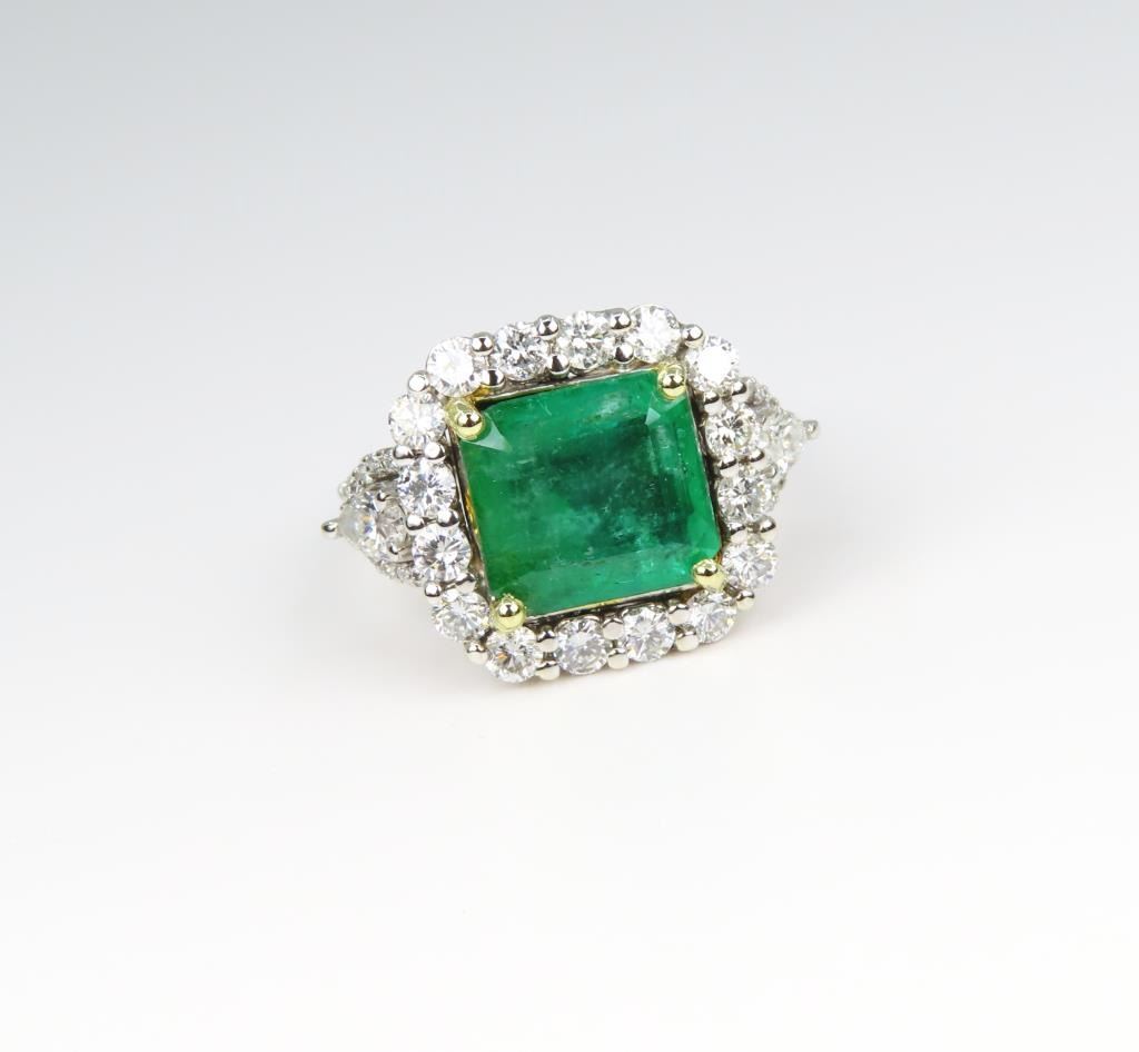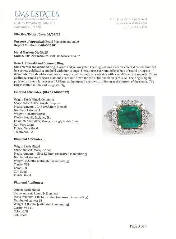 Emerald and Diamond Ring featuring a rectangular cut Emerald weighing 4.36 carats with strong Blue Green color. Emerald is accented with 50 round and marquise cut Diamonds weighing approx. 2.12 carats with G-H colors and VS clarity, set in an elegant design crafted in 18 karat white and yellow gold, ring size 7. Full Retail Appraisal- $24,500.00