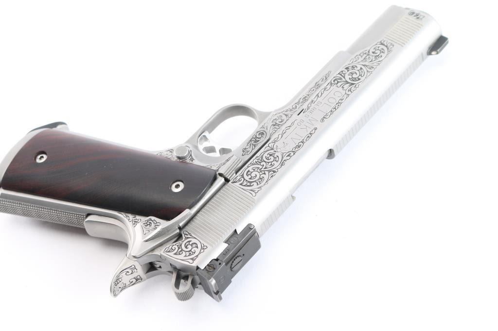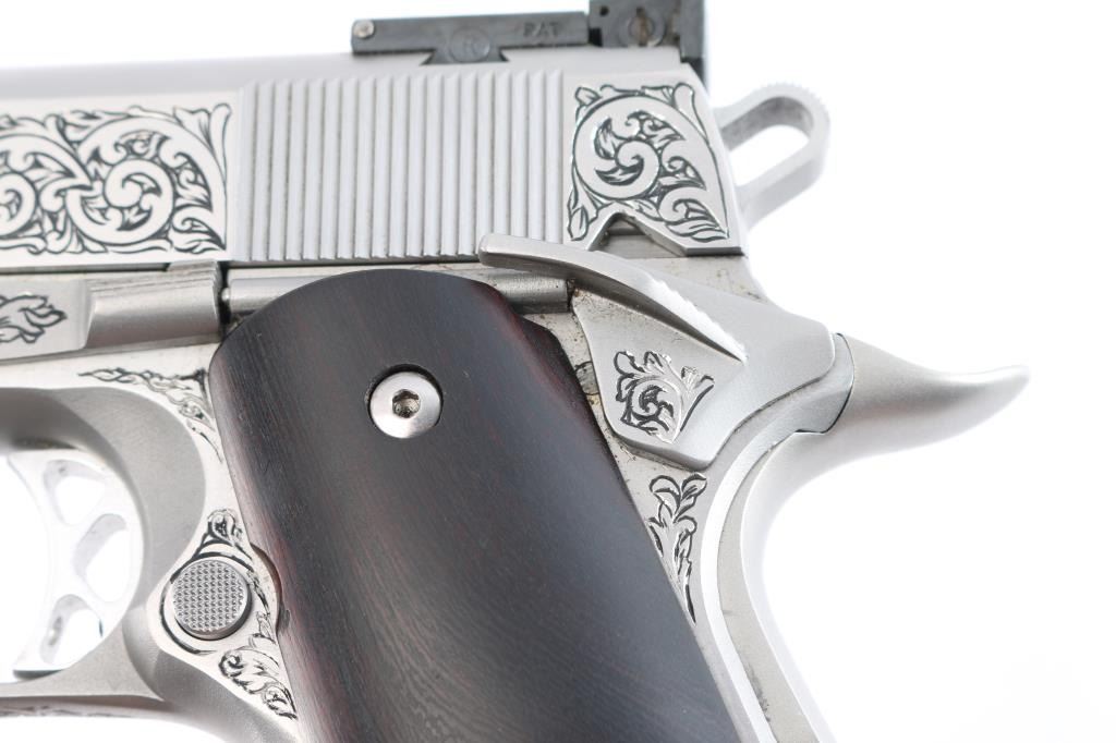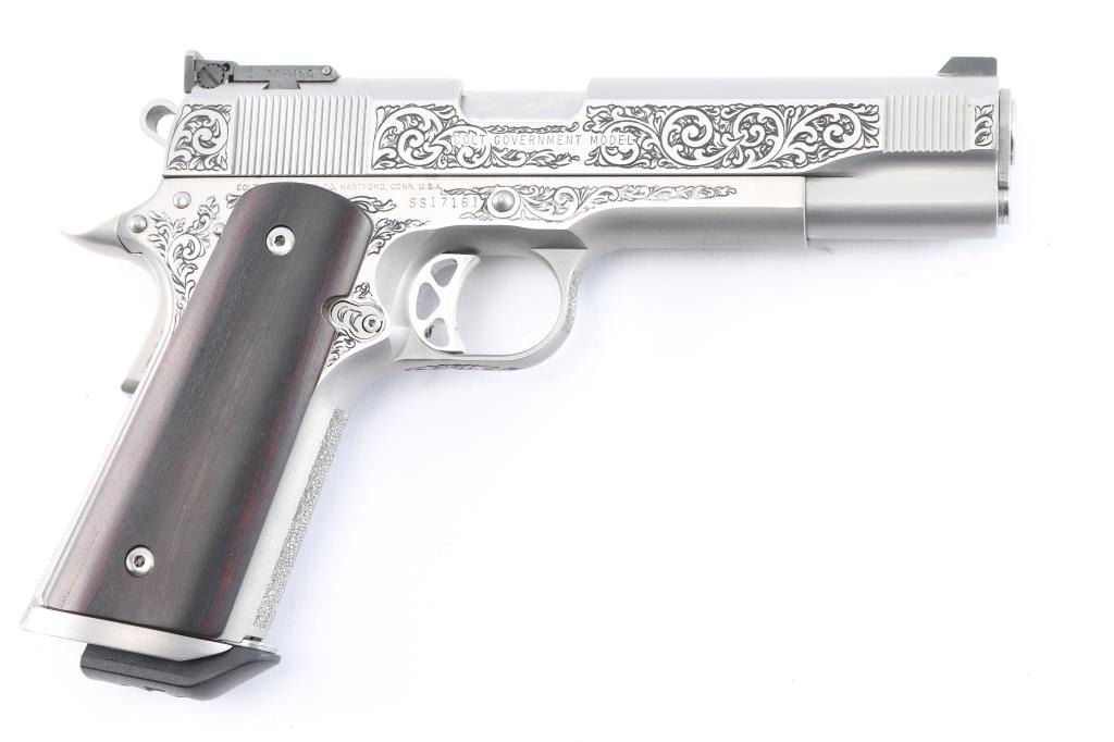 'MK IV Series 80' Engraved stainless steel 1911 pattern single action semi-automatic pistol chambered in .45 Auto. Manufactured in Hartford, CT circa 1986 and subsequently upgraded & engraved. Features a matte finish with polished flats, 50% coverage scroll pattern hand engraving, anti-glare angled cuts on the top of the slide as well as fore & aft cocking serrations on the sides, 5" barrel, two-piece full-length guide rod, white dot front sight, fully-adjustable Bo-Mar rear sight, serrated “k-hole” aluminum trigger with overtravel adjustment, skeletonized hammer, extended thumb safety on the left side of the frame, upswept grip safety, checkered push button magazine release, 8 round magazine with bumper pad, stippled front strap, checkered mainspring housing with beveled magazine well and smooth ironwood grips with mag well cut. Pistol exhibits minor contact wear on the slide with no major wear observed. The action is mechanically sound, the bore is excellent, and the ironwood grips are excellent.