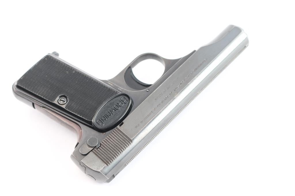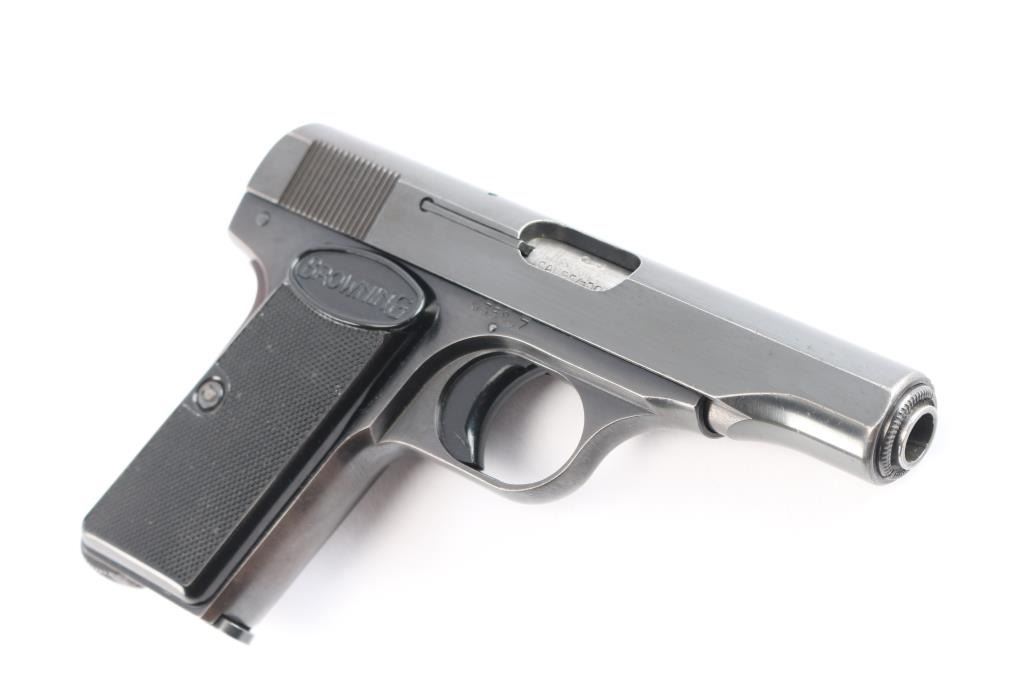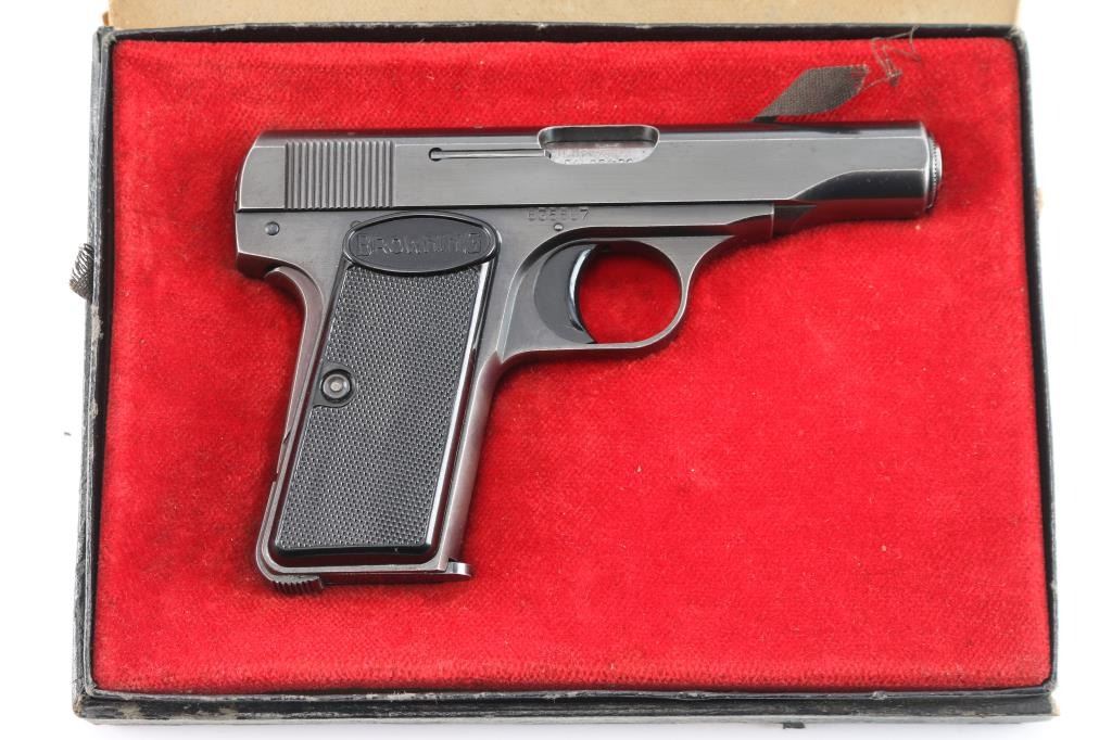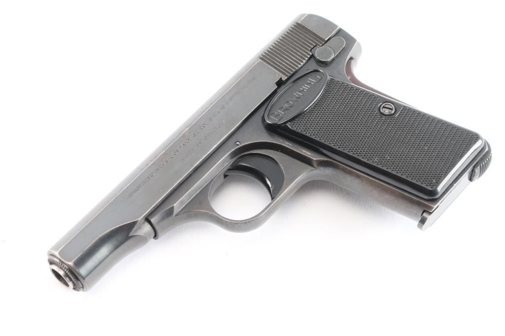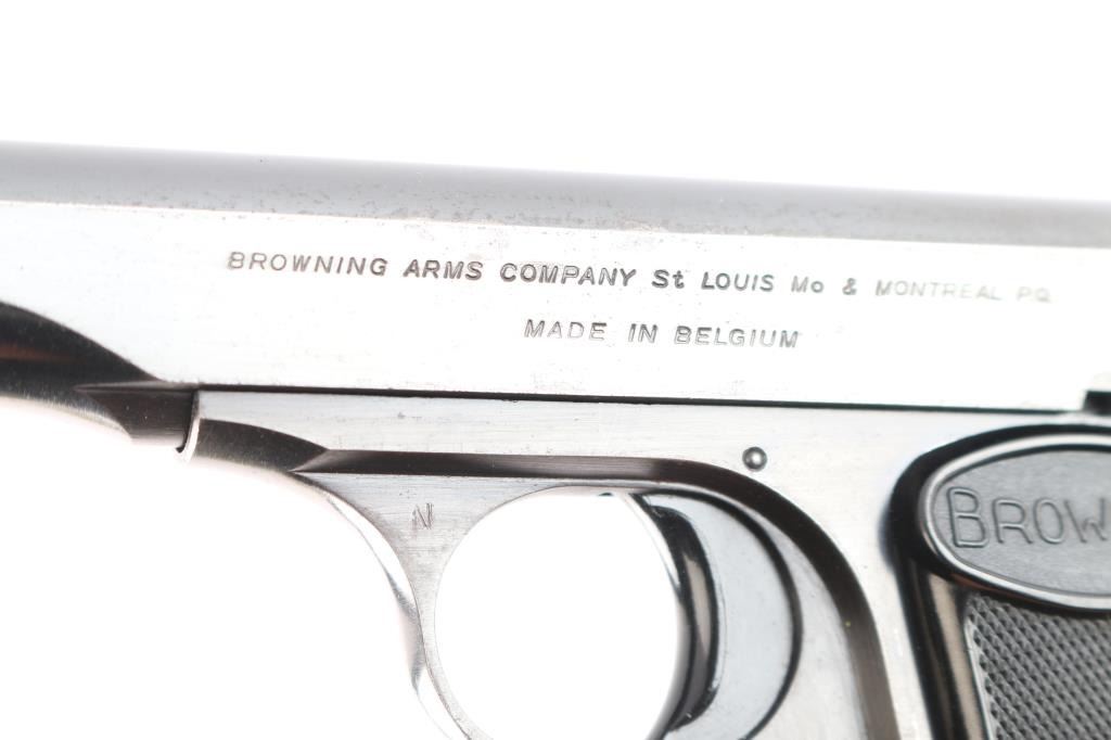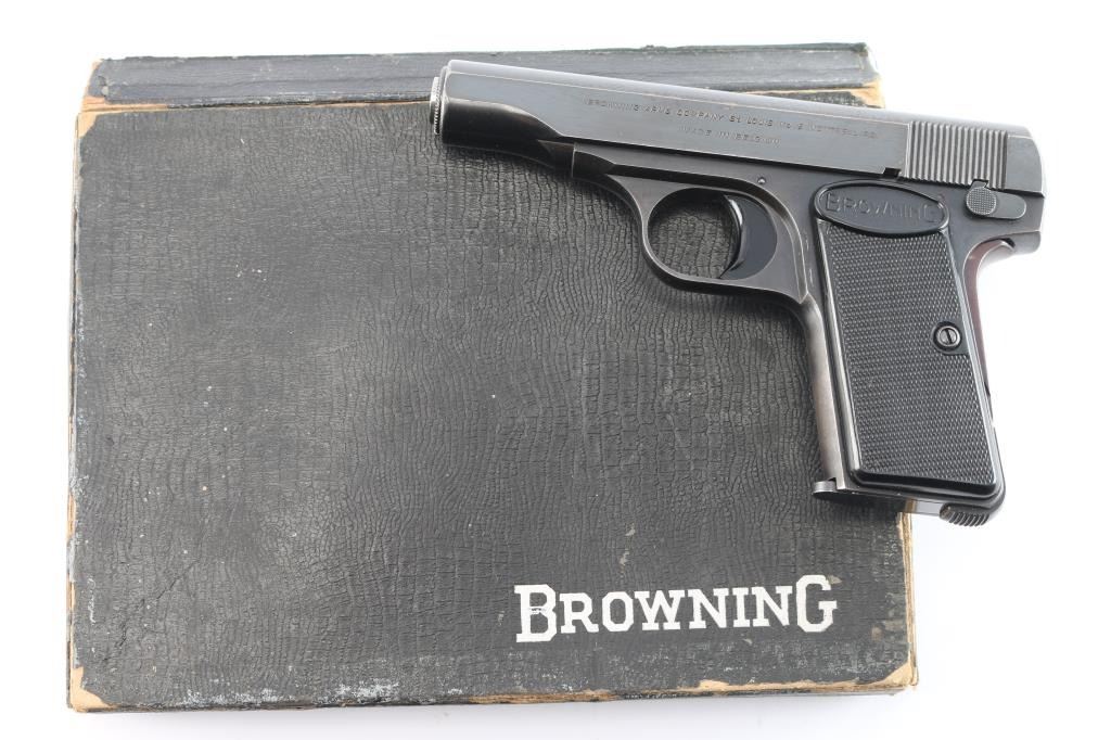 Striker fired semi-automatic pocket pistol chambered in .380 Auto. Manufactured in Belgium by Fabrique Nationale circa 1969 and imported/marketed by Browning Arms Company of St. Louis, MO. Features a polished blued finish, 3 1/2" barrel, diminutive fixed sights, smooth curved trigger, thumb safety/slide lock, grip safety, steel frame, heel magazine release, “FN” marked 6 round magazine, and checkered black plastic grips with “BROWNING” on the tops. Matching serial numbers are found on the frame, slide, and barrel. Includes a period factory black cardboard box with red velvet lined fitted insert and sticker on the bottom with non-matching serial number written on it. Pistol retains approximately 80% of its original blued finish showing edge wear, some scattered pin prick pitting, dings and finish loss on the grip straps / grip safety. The action is mechanically sound, the bore is excellent and the plastic grips are excellent. Box is in poor condition.