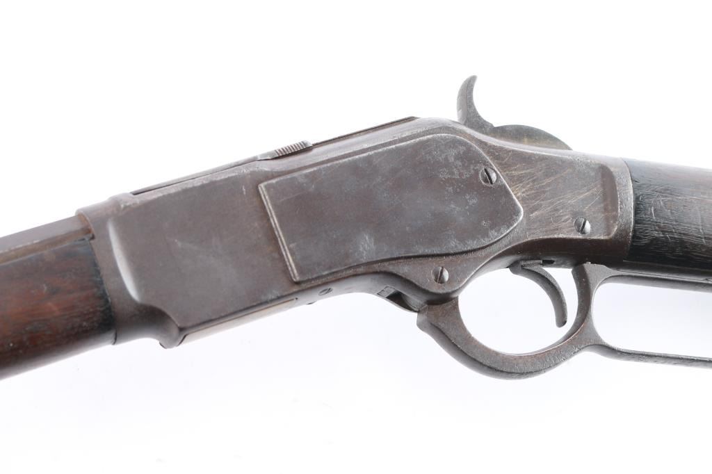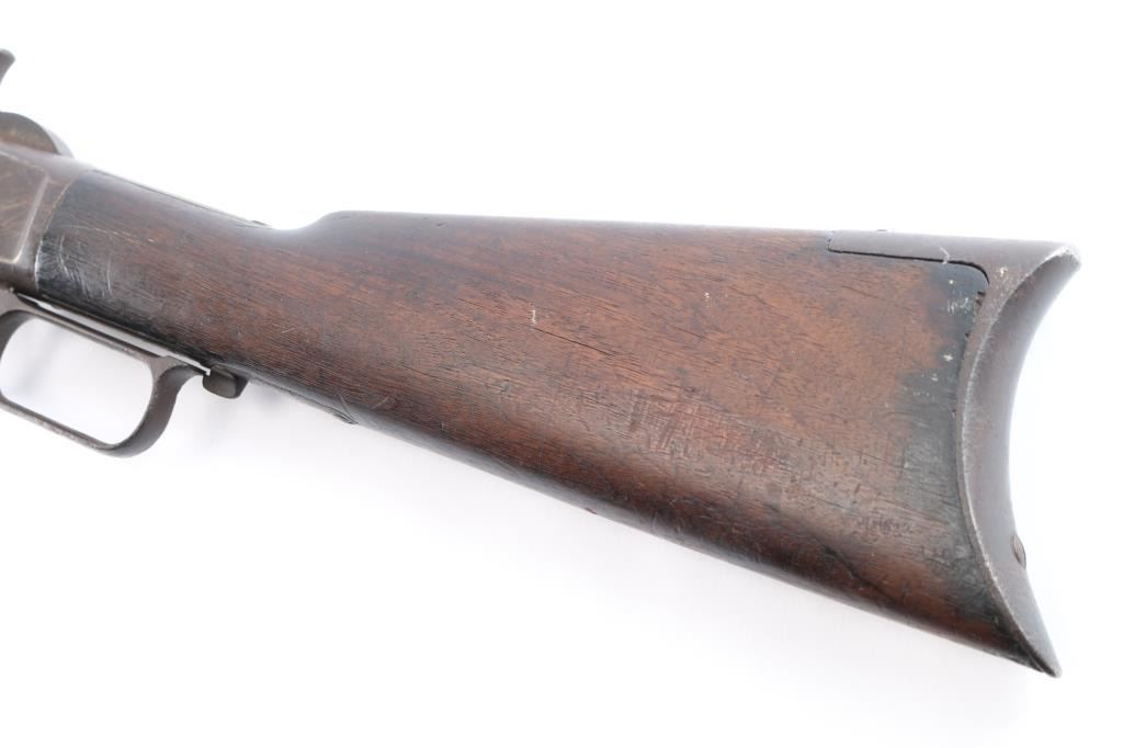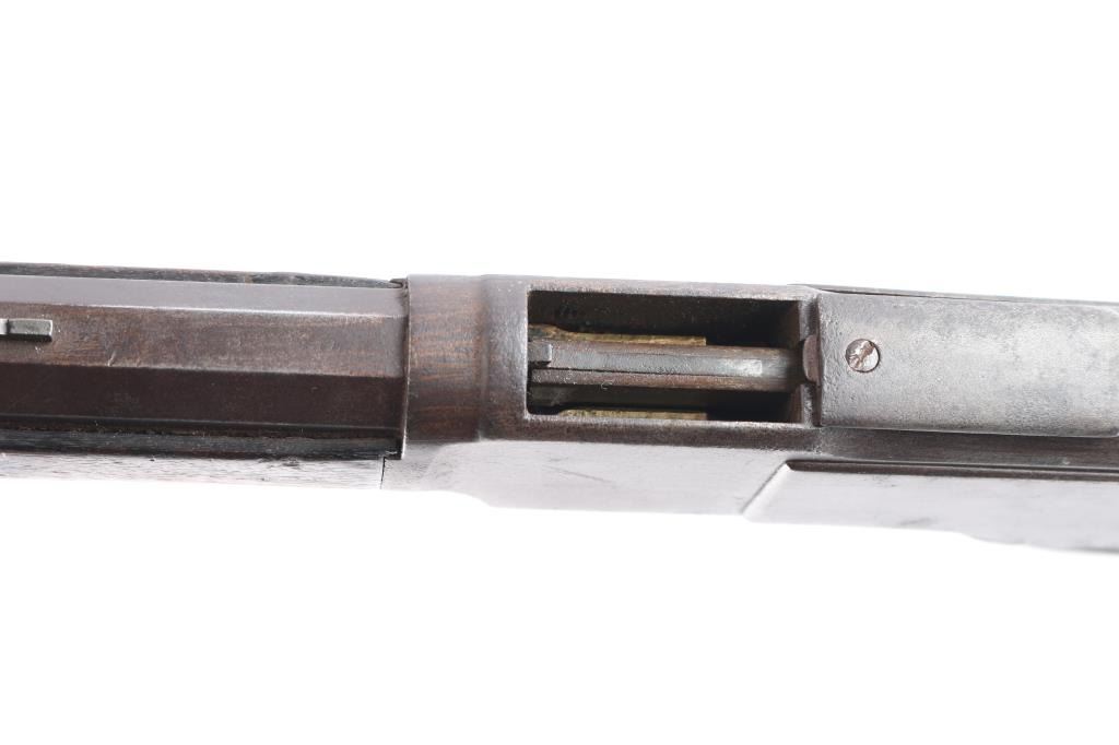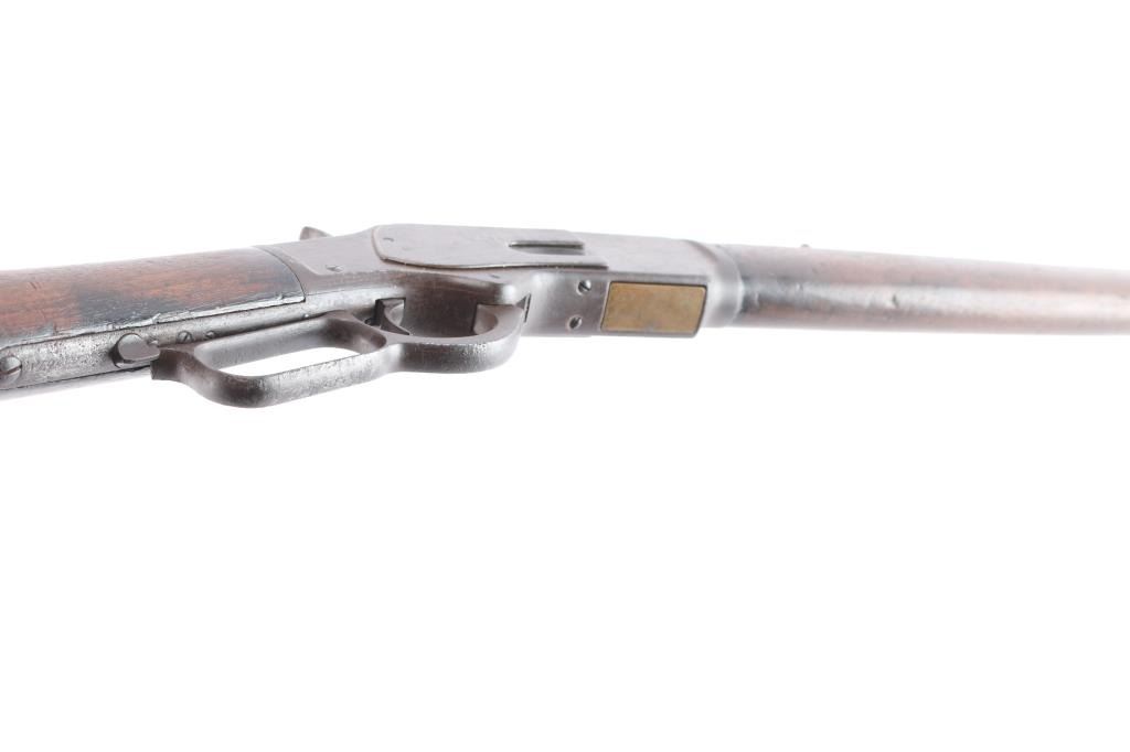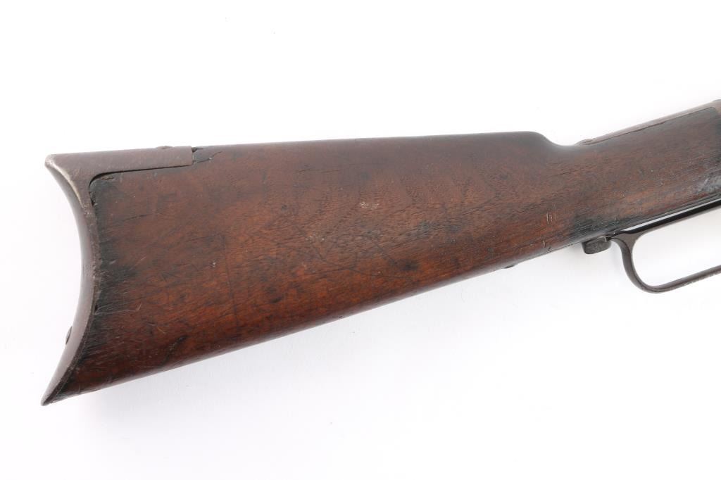 'Third Model' manufactured circa 1885. Features 24" octagon barrel, full length magazine tube, buckhorn sights, straight wrist, finger lever latch, smooth sliding dust cover with side rear serrations, steel crescent buttplate. Bore is poor to fair condition, pitted and eroded throughout, with visible rifling. Metal surfaces show a mostly mottled brown colors, thinning on edges and where handled or where action parts rub. Screw slots are generally very good. Wood is overall very good/sound, with many minor dents and scratches throughout. Butt has good fit to tang. Action is smooth. Model marking on top tang is very feint from handling, unreadable. two line barrel address is clear, readable and serial number on bottom tang is feint but readable. Brass lifter is unmarked.
