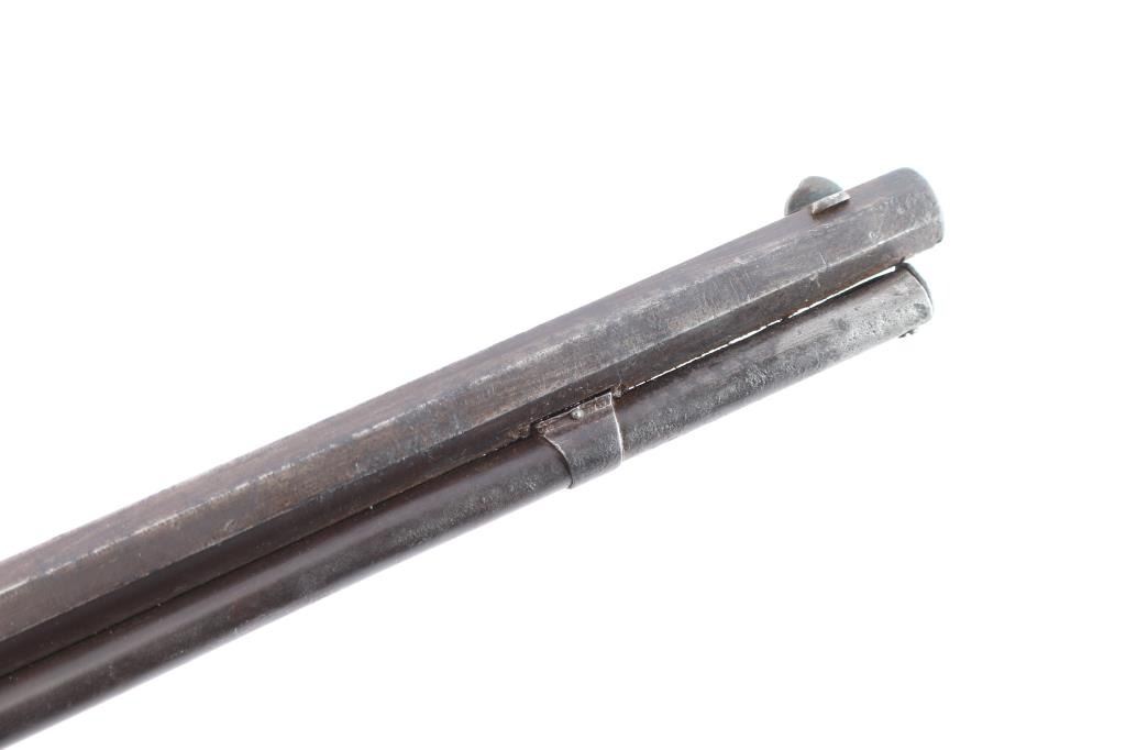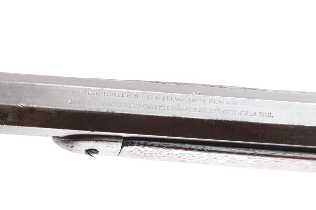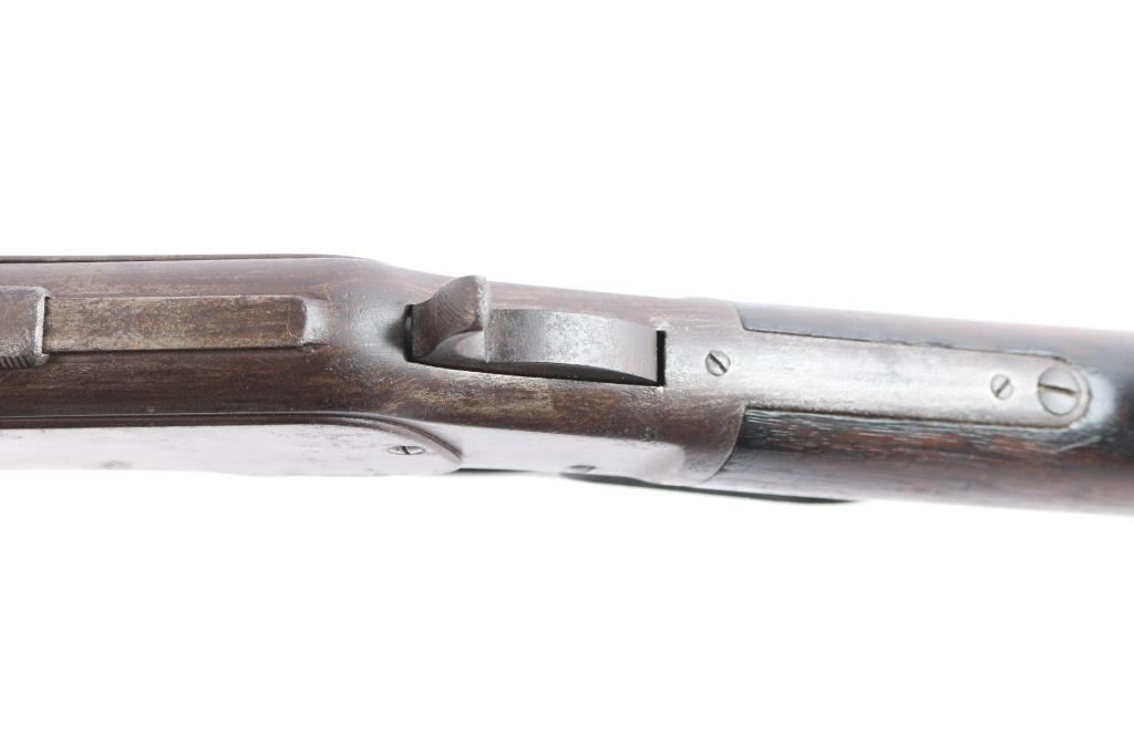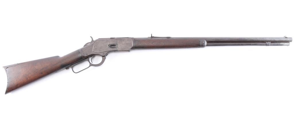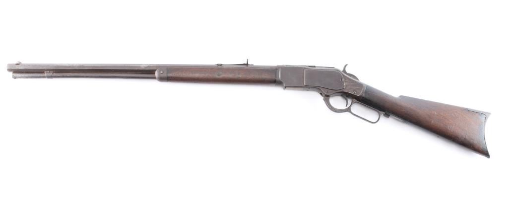 'Third Model' manufactured circa 1885. Features 24" octagon barrel, full length magazine tube, buckhorn sights, straight wrist, finger lever latch, smooth sliding dust cover with side rear serrations, steel crescent buttplate. Bore is poor to fair condition, pitted and eroded throughout, with visible rifling. Metal surfaces show a mostly mottled brown colors, thinning on edges and where handled or where action parts rub. Screw slots are generally very good. Wood is overall very good/sound, with many minor dents and scratches throughout. Butt has good fit to tang. Action is smooth. Model marking on top tang is very feint from handling, unreadable. two line barrel address is clear, readable and serial number on bottom tang is feint but readable. Brass lifter is unmarked.