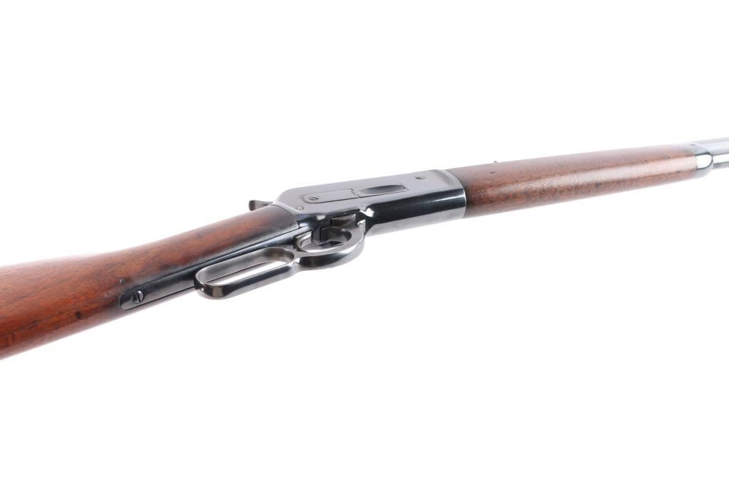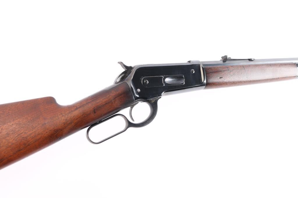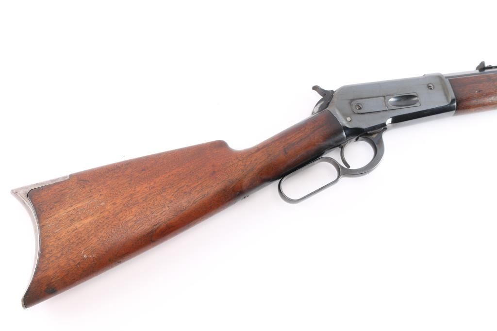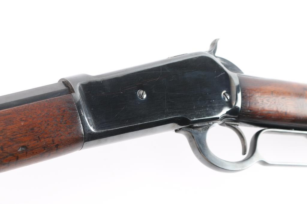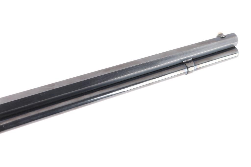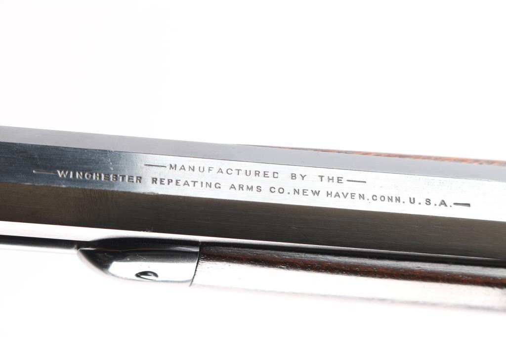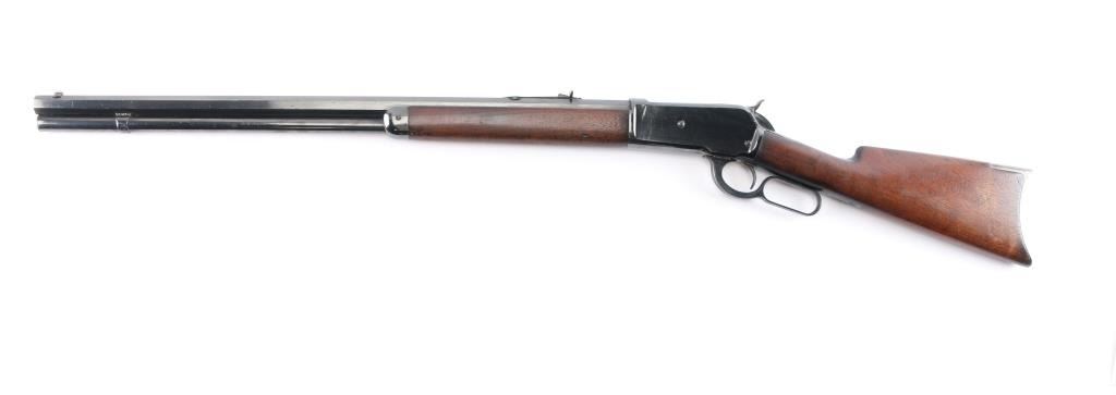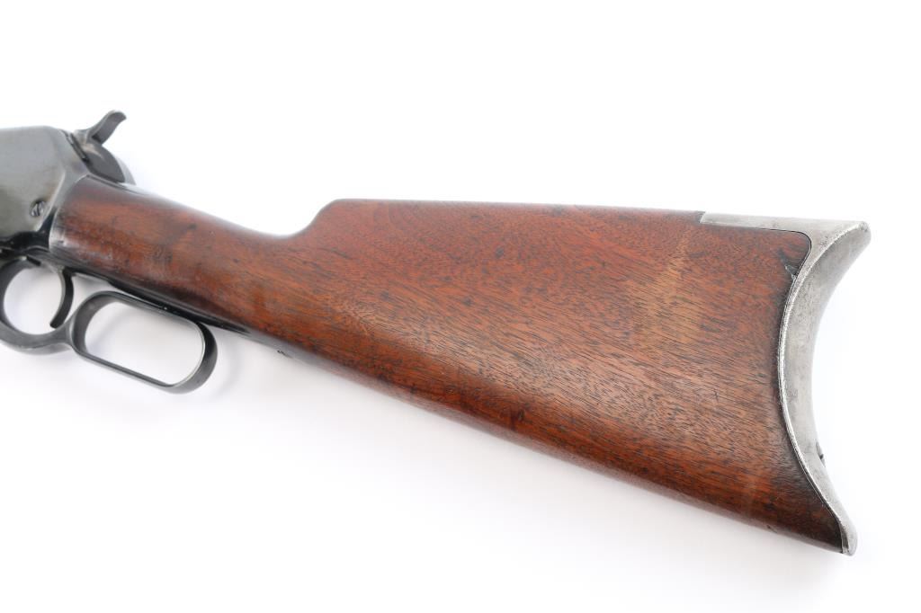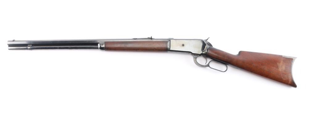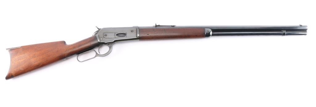 Antique lever action rifle manufactured circa 1889. Desirable 45-70 caliber. Features 26" octagon barrel, full length magazine tube, blade front sight, sporting rear sight, smooth walnut forend & straight wrist shoulder stock, steel smooth crescent buttplate. Bore is very good/bright, strong rifling. Rifle has a high polish reblued finish which is about 95% with scratches, edge wear, buttplate is in the white, the action is crisp, smooth and the wood is overall very good/sound with with some minor scratches/dings. Winchester markings are sharp.