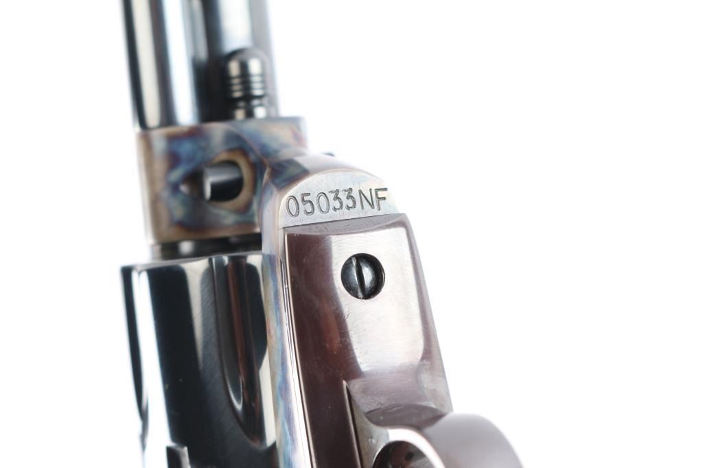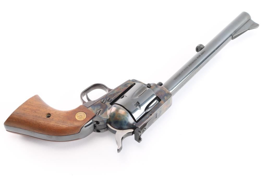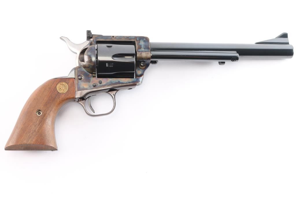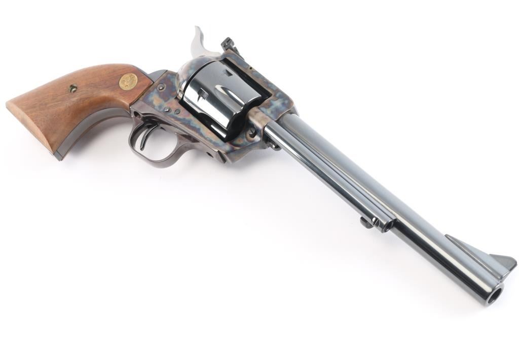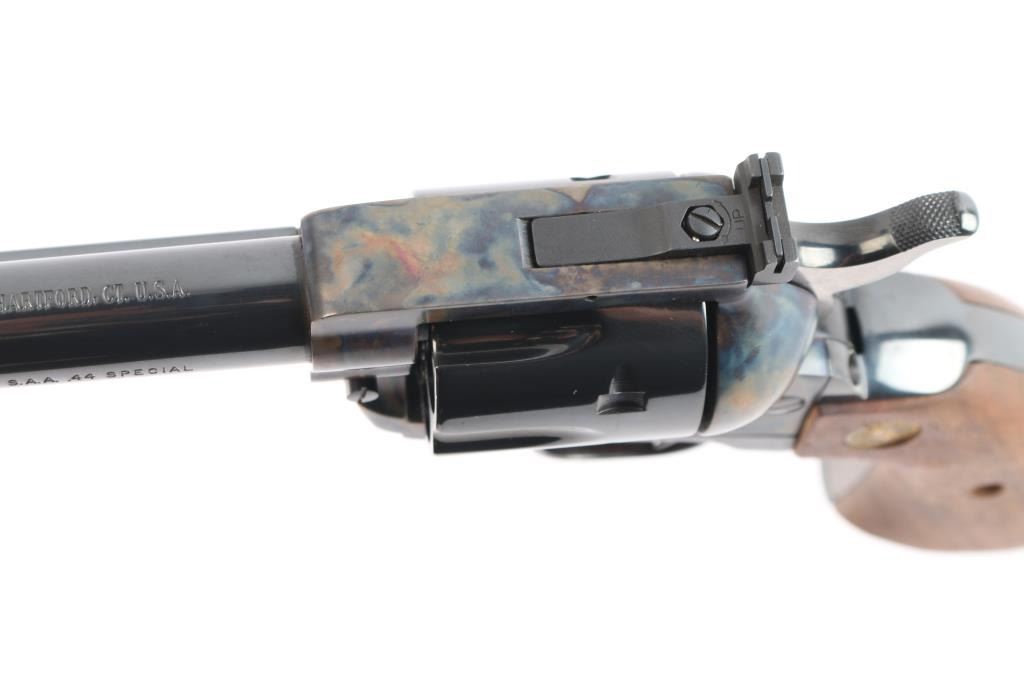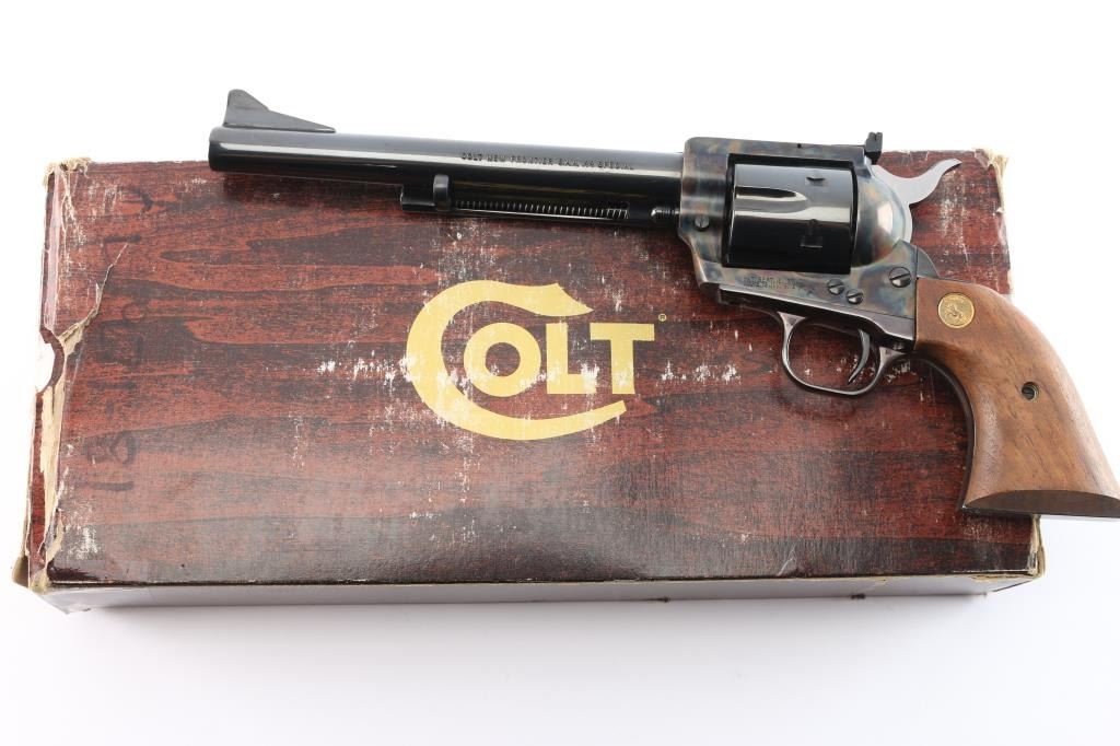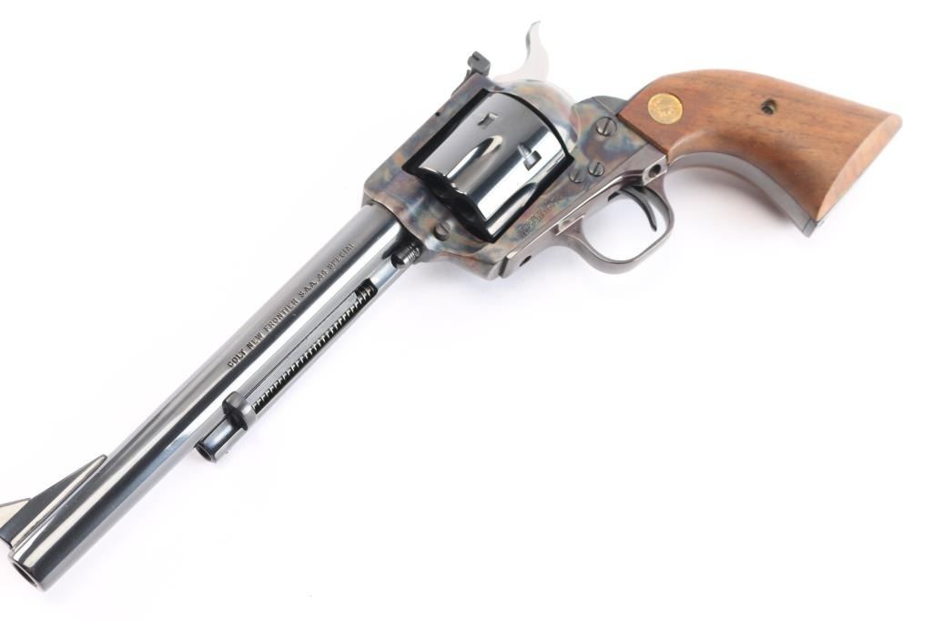 ‘P4770’ Single action revolver chambered in .44 Special. Manufactured in Hartford, CT circa 1979. The New Frontier was introduced as an ‘improved’ version of the Single Action Army with a heavy flattop frame, raised serrated ramp front sight and fully-adjustable rear sight. Features a polished blued & case hardened finish, 7 1/2" barrel, ejector rod with crescent head, fluted six-shot cylinder, checkered hammer spur, smooth curved trigger and smooth oversized walnut grips with gold Colt medallions. Includes the original wood grain cardboard box with matching end label, styrofoam inserts, and documents. Revolver retains approximately 99% of its original finish showing some superficial scratches, a very faint drag line on the cylinder and the triggerguard turned plum. The action is strong, the bore is excellent and walnut grips are very good with light sanding marks on the butt.