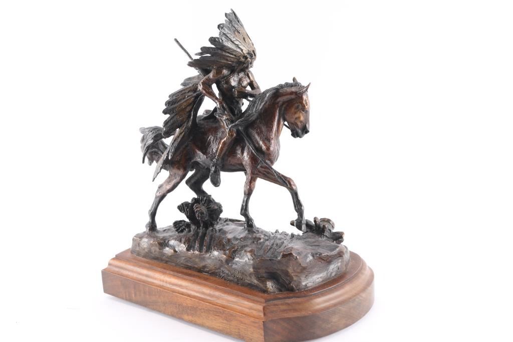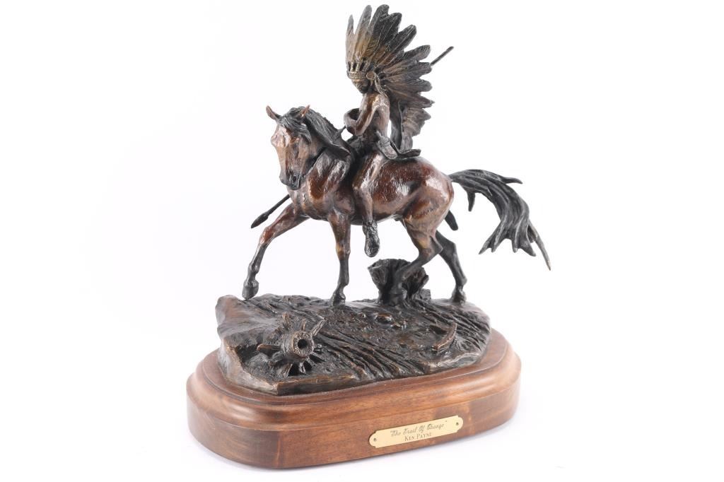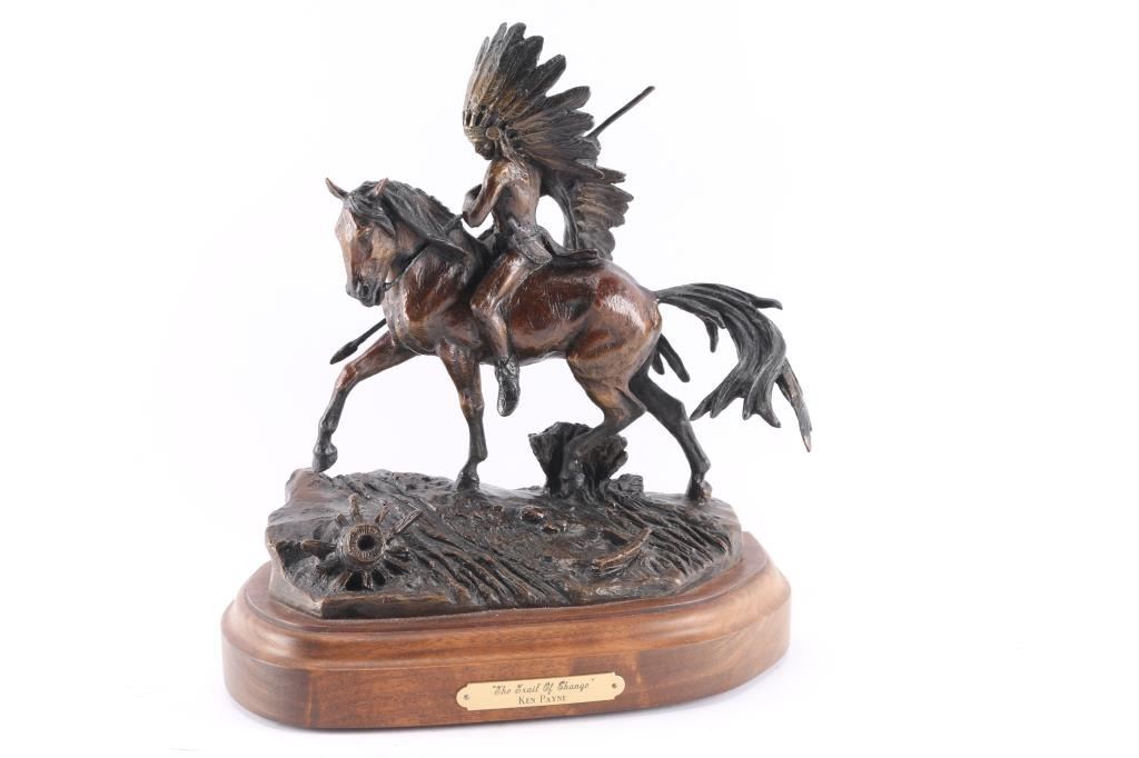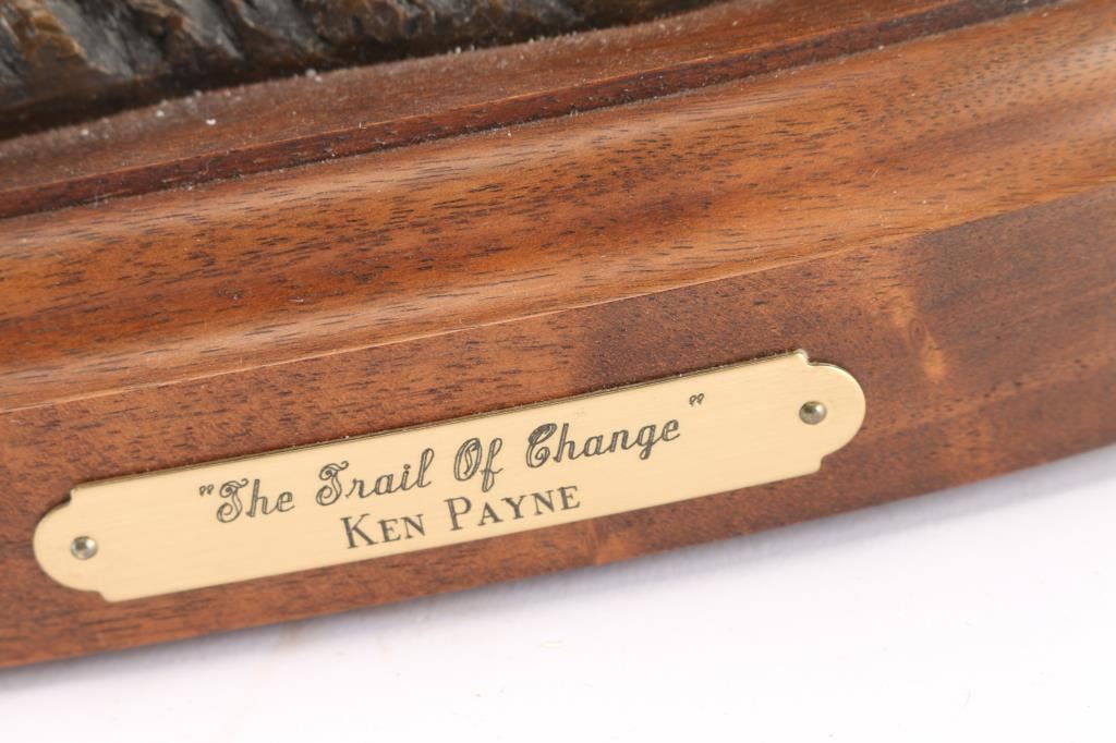 Titled "The Trail of Change". Payne is famous for Western-themed bronzes depicting Native Americans, cowboys, buffaloes, and wolves in action. Payne was influenced by the Greek and Roman masters, wanting to capture that same majesty in an historic frontier setting. Being born on a 24,000-acre ranch in New Mexico in 1938, he created artworks in his spare time, building a portfolio of Payne animal sculptures for sale. Eventually he went on to mentor young artists, teaching them stories of the disappearing Old West as he sculpted. On turntable wood stand with brass placard. Measures 12" tall by 10 1/2" wide. BRONZES NOT SHIPABLE!!