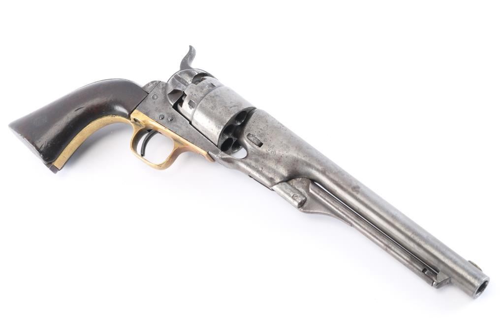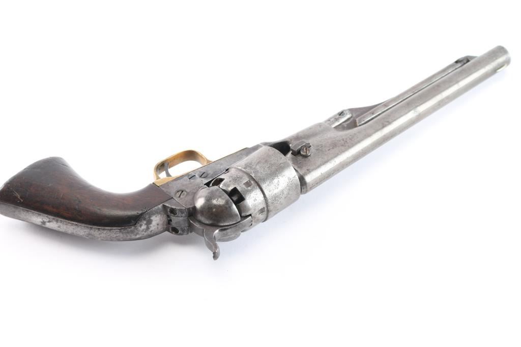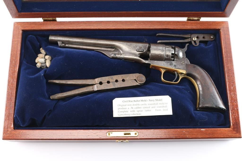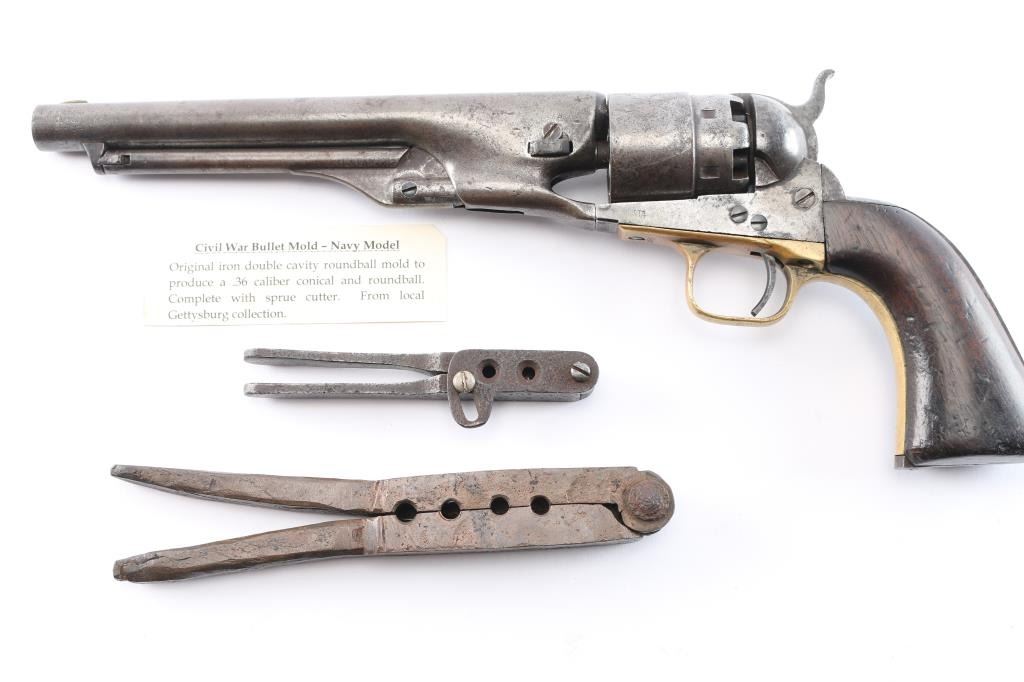"Three Screw Military Frame" Antique single action cap-n-ball black powder percussion revolver. Early manufacture, circa 1862. Features an 8" round barrel, German silver low profile blade front sight, 'v' notch rear sight cut into the hammer lip, smooth thin trigger, knurled hammer spur, non-fluted six shot cylinder with roll stamped Naval Engagement scene, loading lever, round brass trigger guard, steel backstrap, shoulder stock cuts in the recoil shield & butt and one-piece oil finished smooth walnut grip. military inspector stamps, B & D on barrel, H on triggerguard, C on cylinder. Bore is fair to good, strong rifling, some scattered light pitting. Metal surfaces show a uniform dull molted gray patina with areas of pitting. Wood grip is good with slight shrinkage, several small chips or gouges. Cylinder scene is not visible. Single line barrel address is fairly crisp. Serial number repeated on barrel, triggerguard & back strap. Cylinder & wedge are mismatched. Two of the frame screws appear to be newer replacements. Action is sound. Comes in a nice glass topped, blue felt lined display case with key and a Navy model iron double bullet mold for .36 cal. conical and ball bullets, complete with sprue cutter, appears to have been in the elements for a while. Tag states "From local Gettysburg collection". Also included are seven conical and one ball battlefield recovered bullets and a Civil War "Gang" bullet mold, made of copper for making four conical .36 cal. bullets at once. Tag states "Quite probable of Confederate manufacture". A nice set.