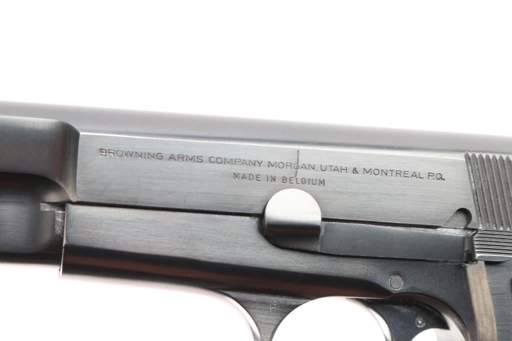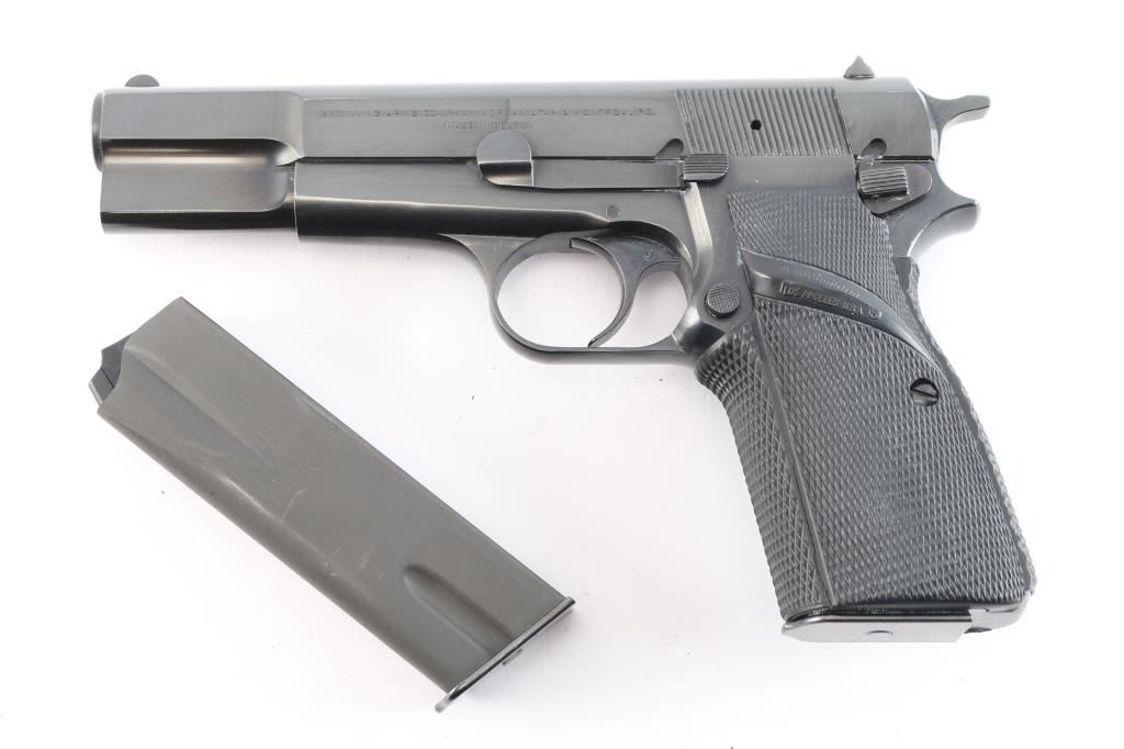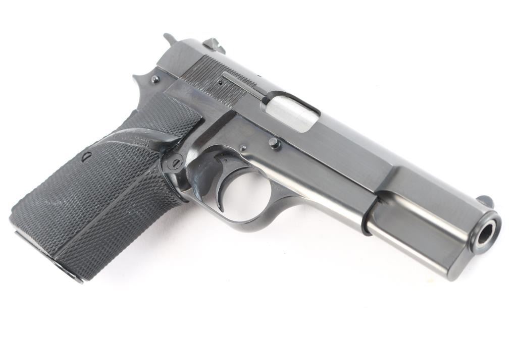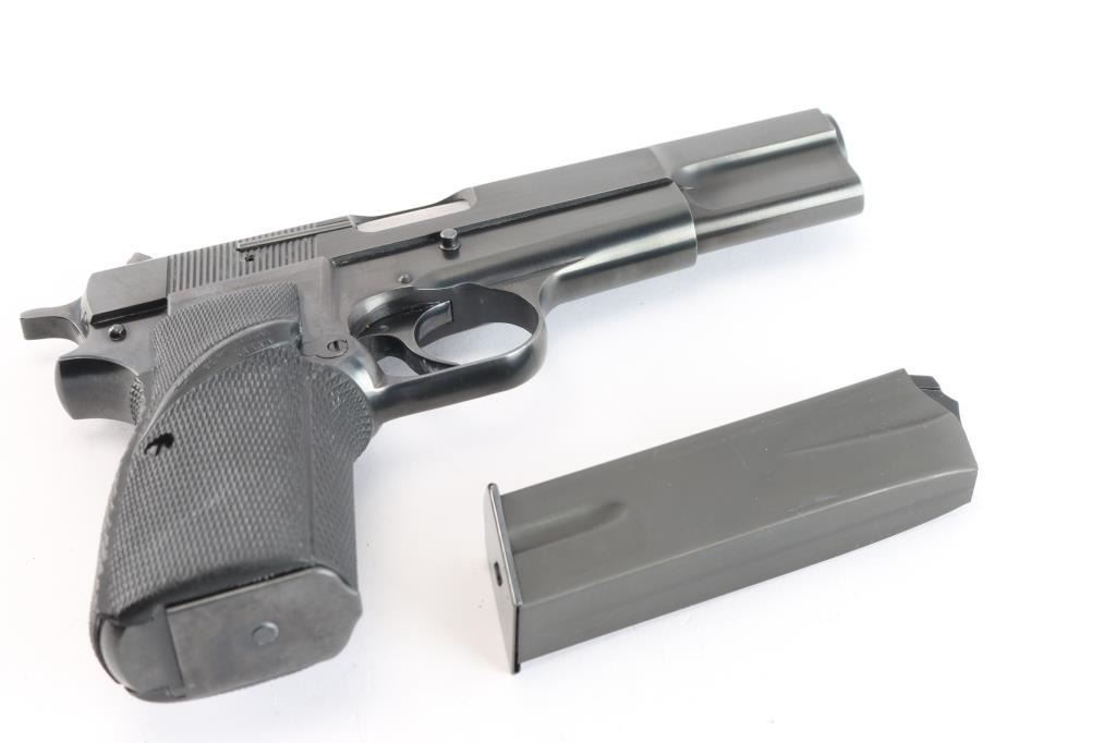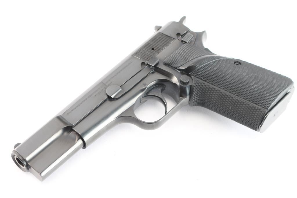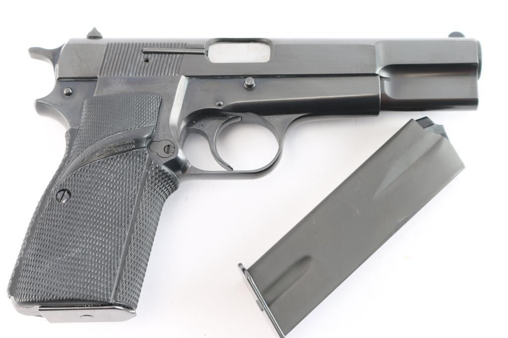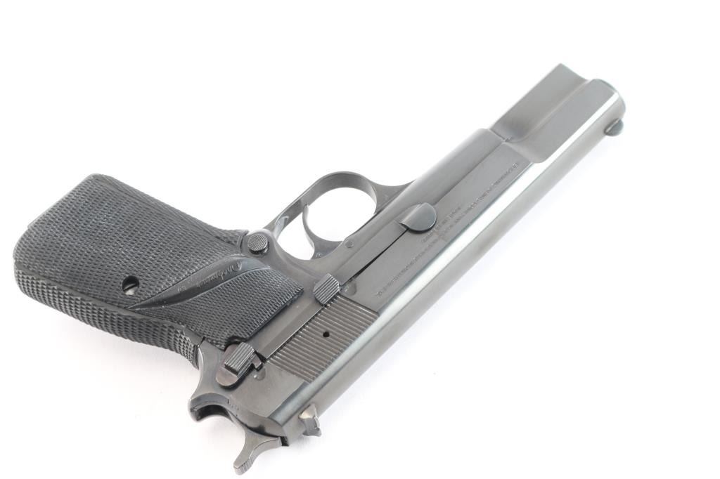 Desirable, single action semi-automatic pistol chambered in 9x19mm. Manufactured in Belgium by Fabrique Nationale circa 1979 and imported/marketed by Browning Arms Co. of Morgan, UT. Features all steel construction with a blued finish, two-piece 4.75" barrel finished in-the-white, fixed round blade front sight, dovetailed rear sight with square notch, smooth curved trigger, serrated hammer spur, external extractor, thumb safety & slide catch on the left side of the frame, knurled push button magazine release, 13 round magazine, and two-piece Pachmayr Signature checkered black rubber full-wrap-around grips with thumb rests. Includes a spare magazine. Pistol retains approximately 97% of its original finish showing minor edge wear, some scattered superficial scratches and a 3/16” long scrape in the center of the slide legend. The action is mechanically sound, the bore is excellent, and aftermarket rubber grips are excellent.