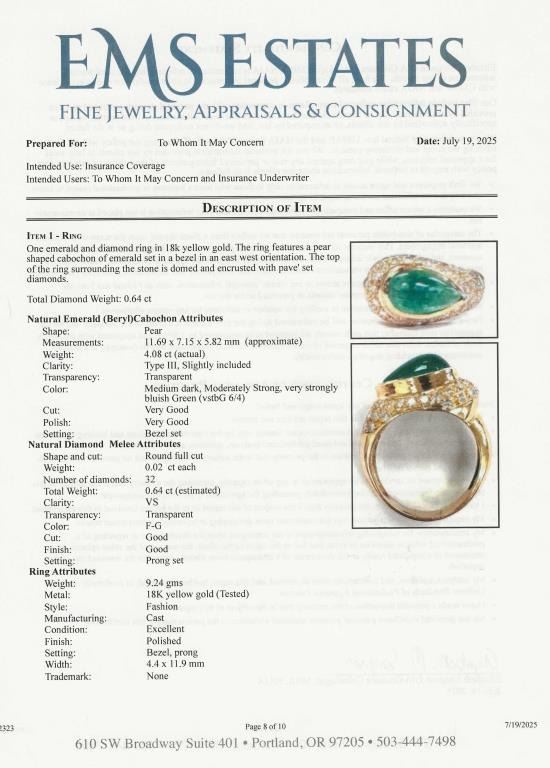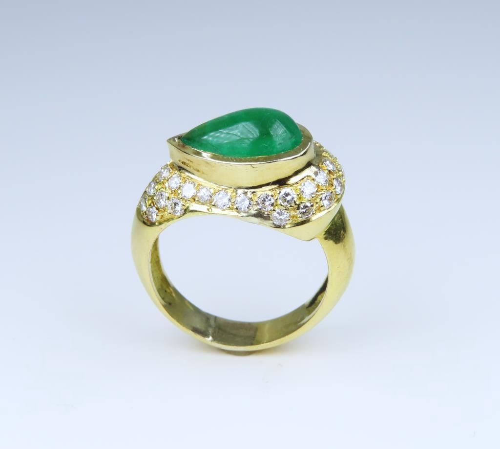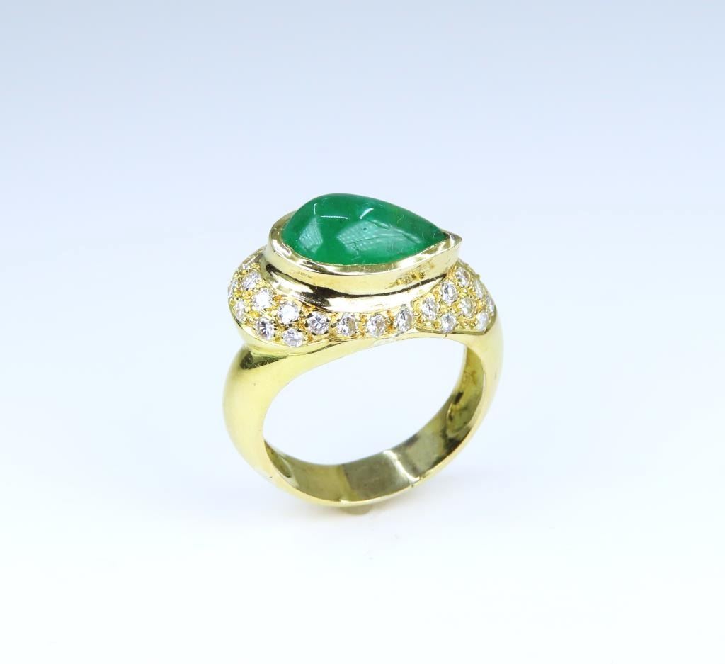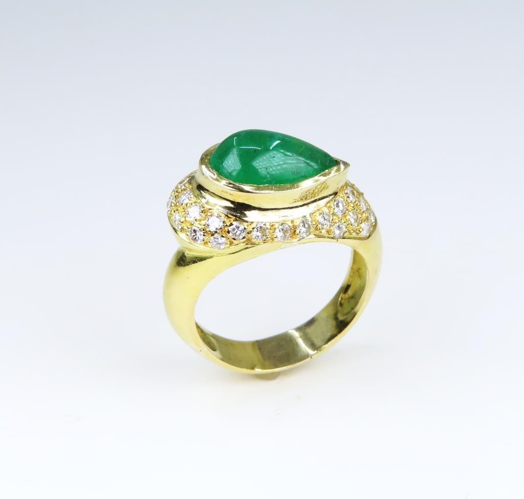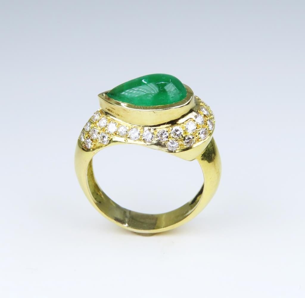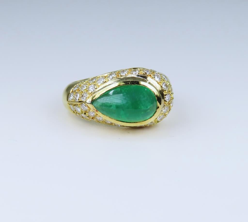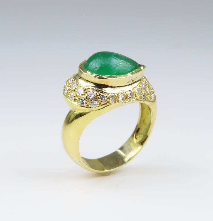 and Diamond Ring featuring a fine 4.08 carat pear shaped Cabochon Emerald with intense vivid Blue Green color. Emerald is brilliantly accented with 37 pave set round cut Diamonds weighing approx. 0.75 carats with G-H colors and VS clarity, set in a sophisticated design crafted in heavy 18 karat yellow gold weighing approx. 10.00 grams, ring size 7 ¾. Full Retail Appraisal - $20,000.00