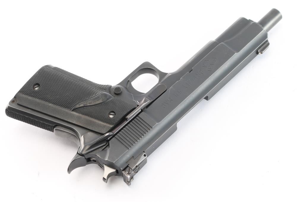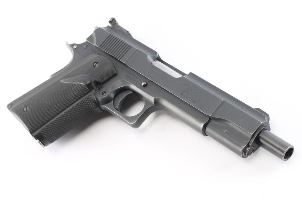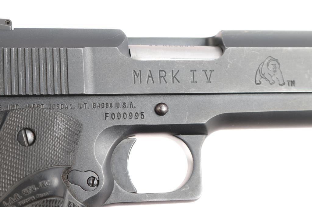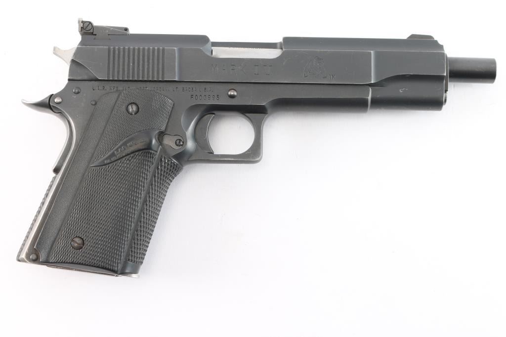 'Mark IV' Extra large frame 1911 style semi automatic pistol chambered in .44 Magnum. Features a parkerized finish, 6.5" extended barrel, flat top slide, 3 dot sights with fully adjustable rear sight, thumb safety, beavertail grip safety, serrated trigger, serrated hammer spur, push button safety, flat knurled mainspring housing, 7 round factory magazine and LAR marked Pachmayr black checkered rubber wrap around grips. Pistol shows edge wear, some minor scratches. Action is strong, bore is excellent/bright, and grips are fine. Comes with two magazine black nylon belt pouch, 3 spare LAR 7-rd magazines, (4) total, Bucheimer brown leather belt holster and a LAR brown leather shoulder holster.
