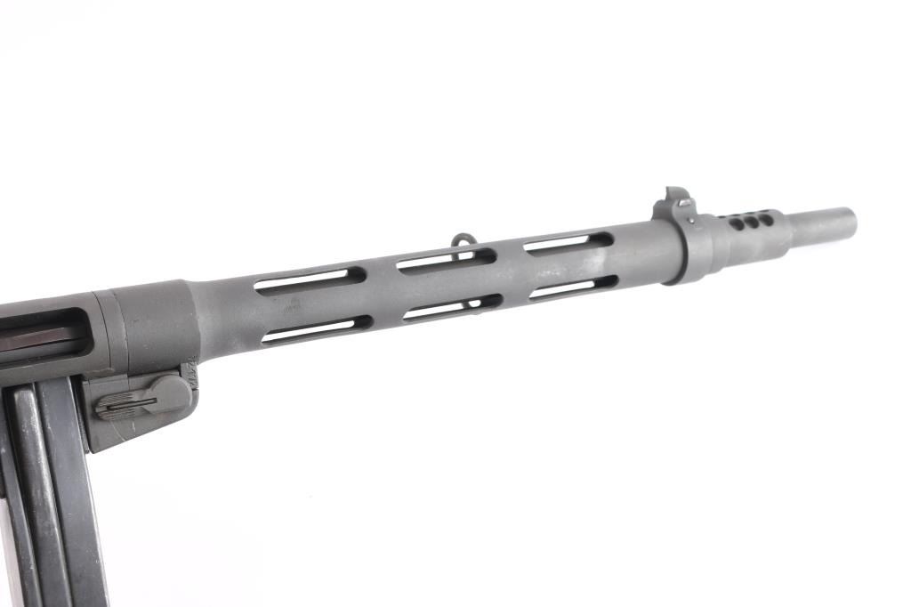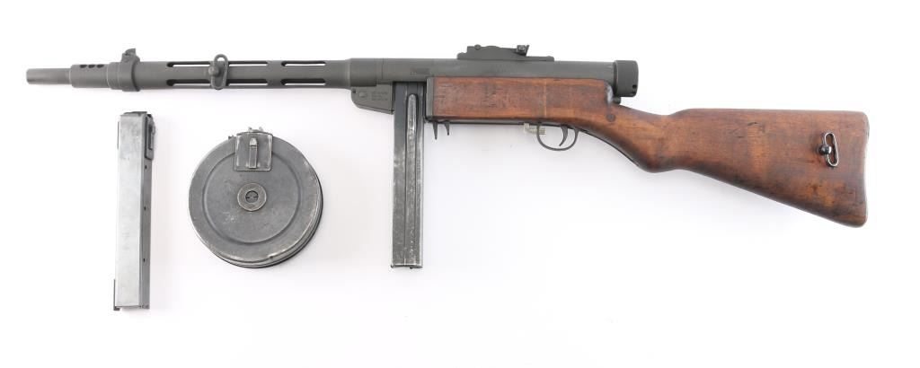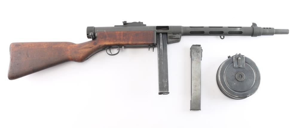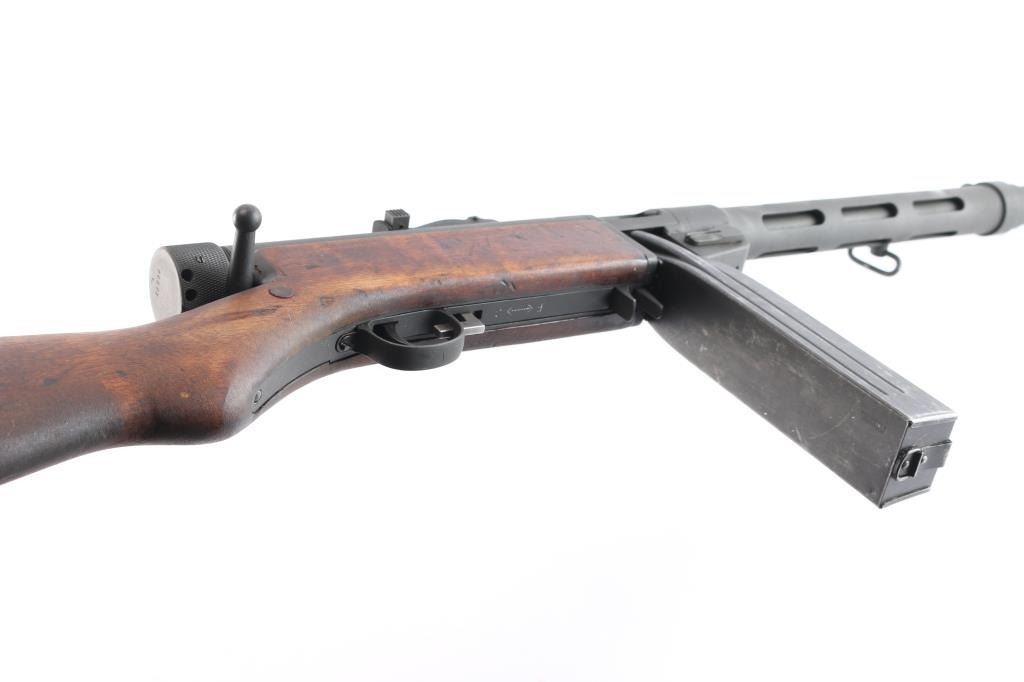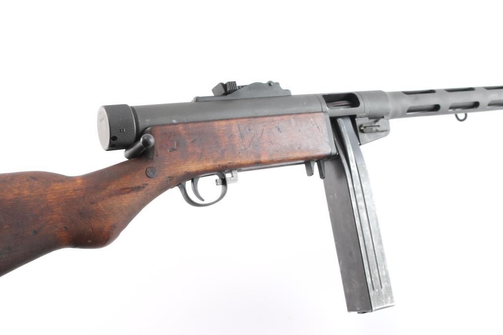 Semiautomatic Pistol Caliber Carbine (PCC) assembled in the US using parts for a Finnish Suomi sub-gun. Features 16" barrel with ventilated shroud, blade front & tangent rear sights, manual safety, parkerized finish, wood stock. Bore is bright. Retains 90% finish with handling marks. Stock is very good condition with handling marks, dents. Includes a 50 round "Coffin" magazine, a 36 round stick mag, and a 71 round drum.