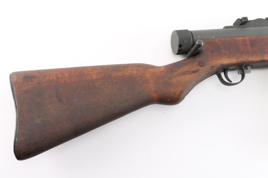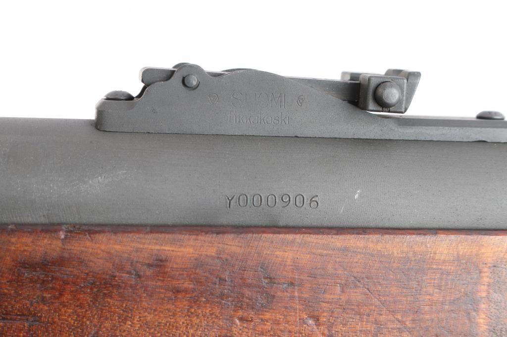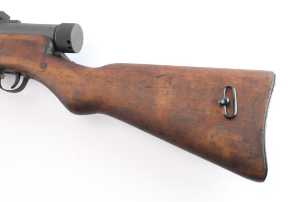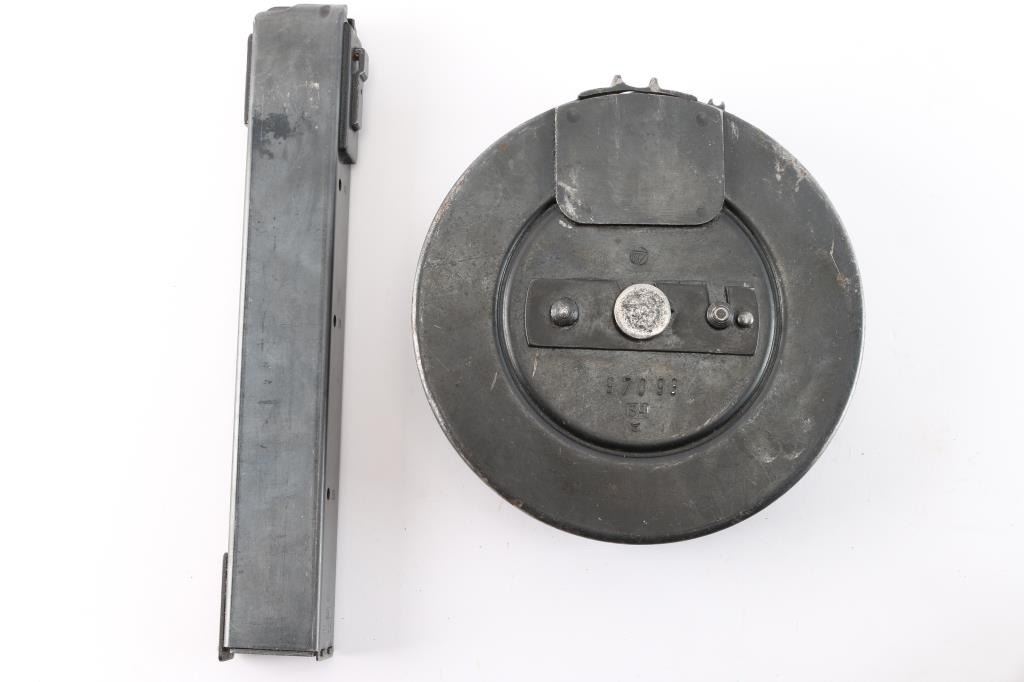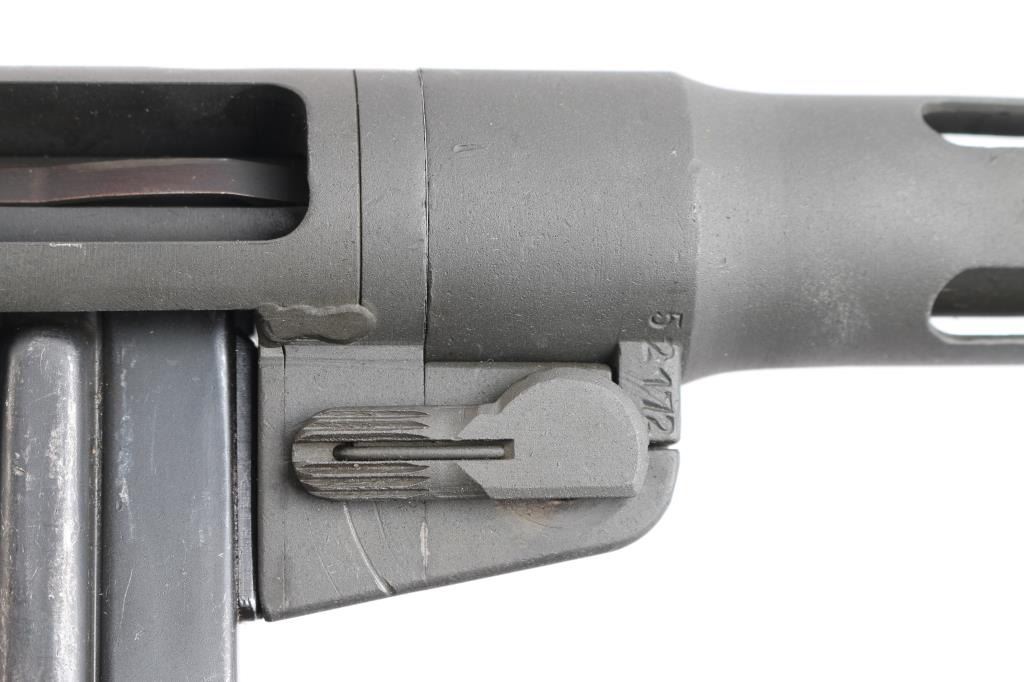 Semiautomatic Pistol Caliber Carbine (PCC) assembled in the US using parts for a Finnish Suomi sub-gun. Features 16" barrel with ventilated shroud, blade front & tangent rear sights, manual safety, parkerized finish, wood stock. Bore is bright. Retains 90% finish with handling marks. Stock is very good condition with handling marks, dents. Includes a 50 round "Coffin" magazine, a 36 round stick mag, and a 71 round drum.
