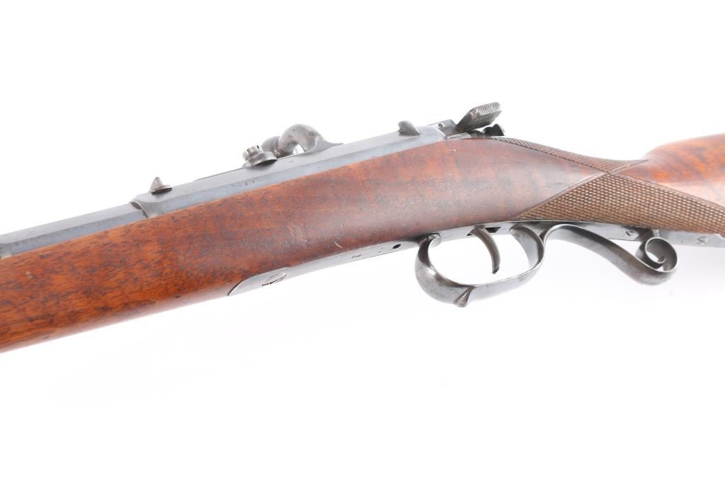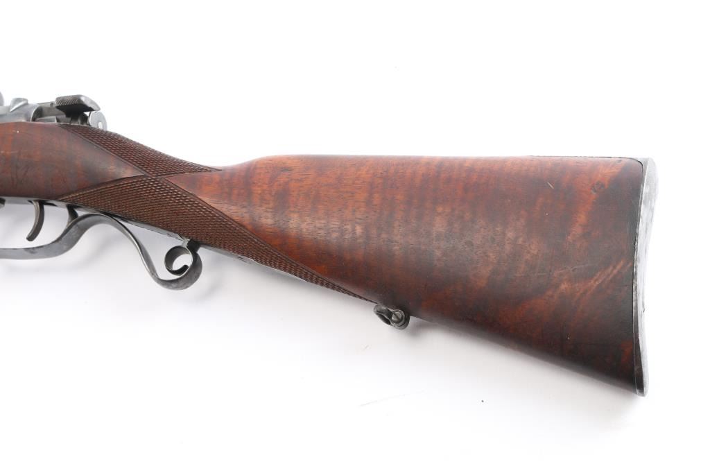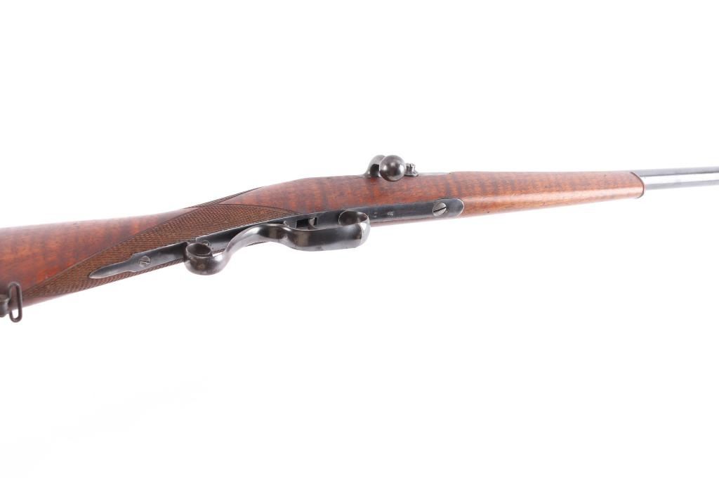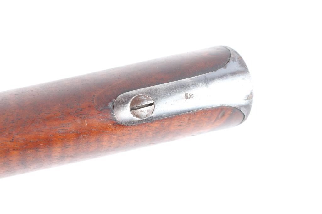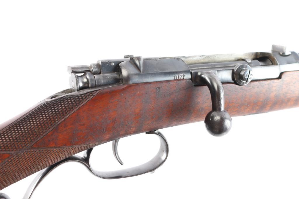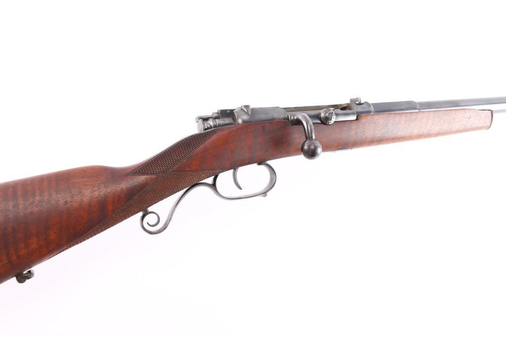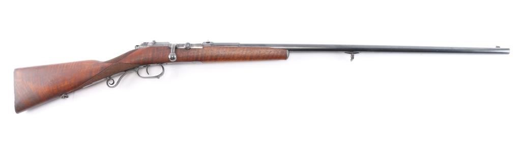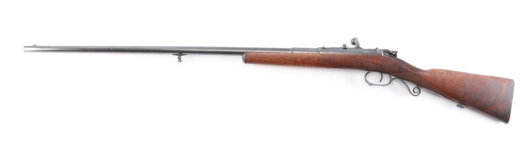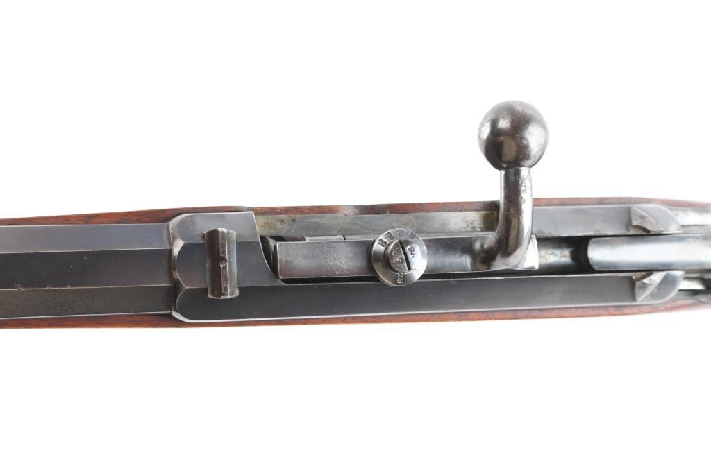 Early military single shot bolt action nicely converted into a shotgun by an unsigned maker. This type of gun is commonly used for driven boar hunting in central Europe. Features a 31" barrel, choke measures "IM", narrow sling swivels, fixed sights, manual safety, smooth steel buttplate, checkered walnut stock. Bore is bright. Retains 90% finish with handling marks. Wood is very good with fancy figure. Some original proof marks remain.
