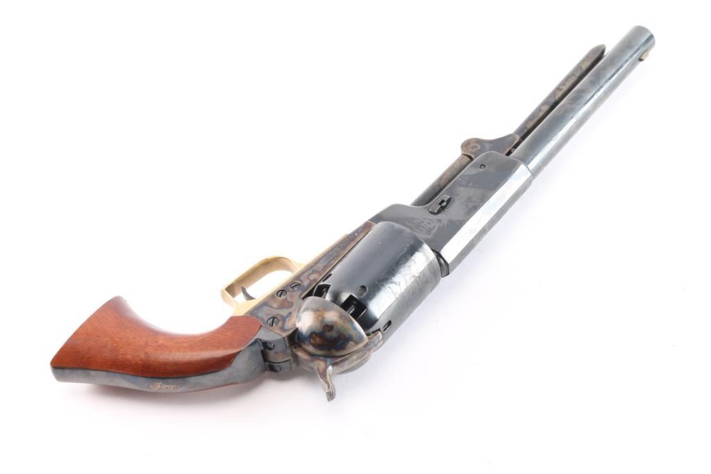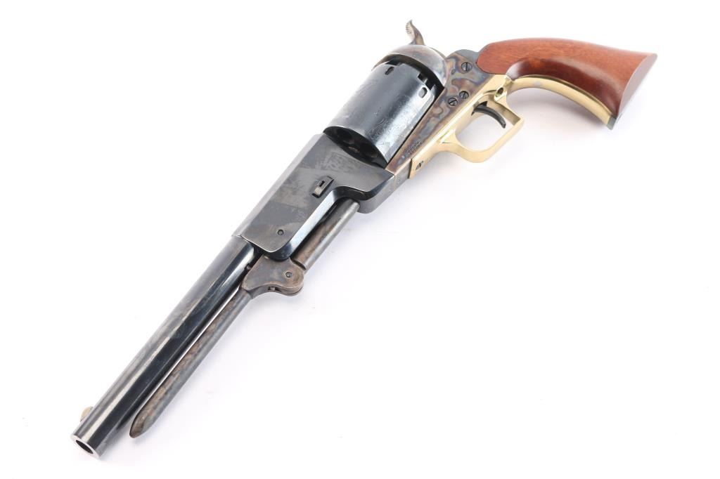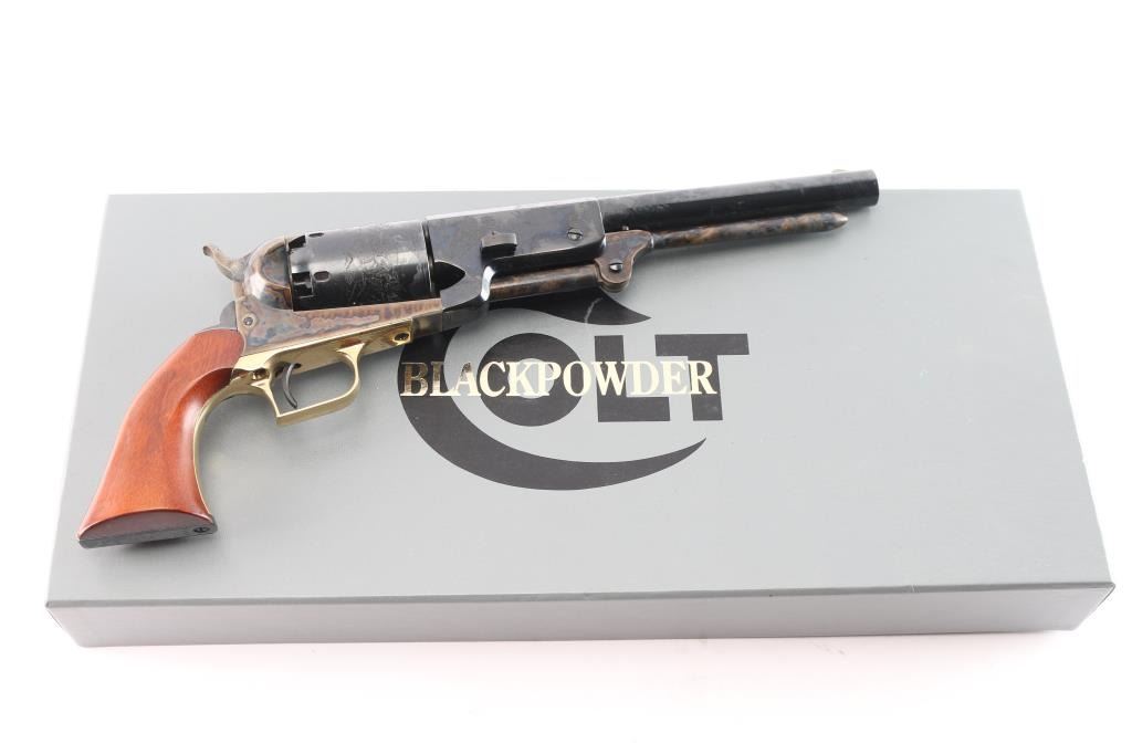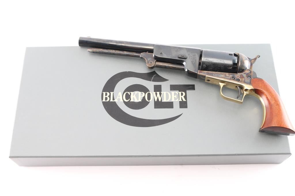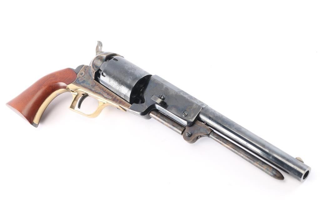 'Signature Series' 3rd generation. 1993-2002. Finely crafted reproduction of the Colt Walker, produced as a limited edition. Features a blued/case hardened finish, 9" barrel, blade front sight, 'v' notched rear sight on the hammer, unfluted six-shot cylinder with roll stamped battle scene on cylinder & oval stops, loading lever, brass square back triggerguard, smooth blackened back strap stamped with Sam Colt's signature highlighted in gold and one-piece smooth walnut grip. Right barrel stamped "U.S. 1847". Includes the gray factory one-piece cardboard box with fitted insert. Condition is nearly like new with few signs of handling.