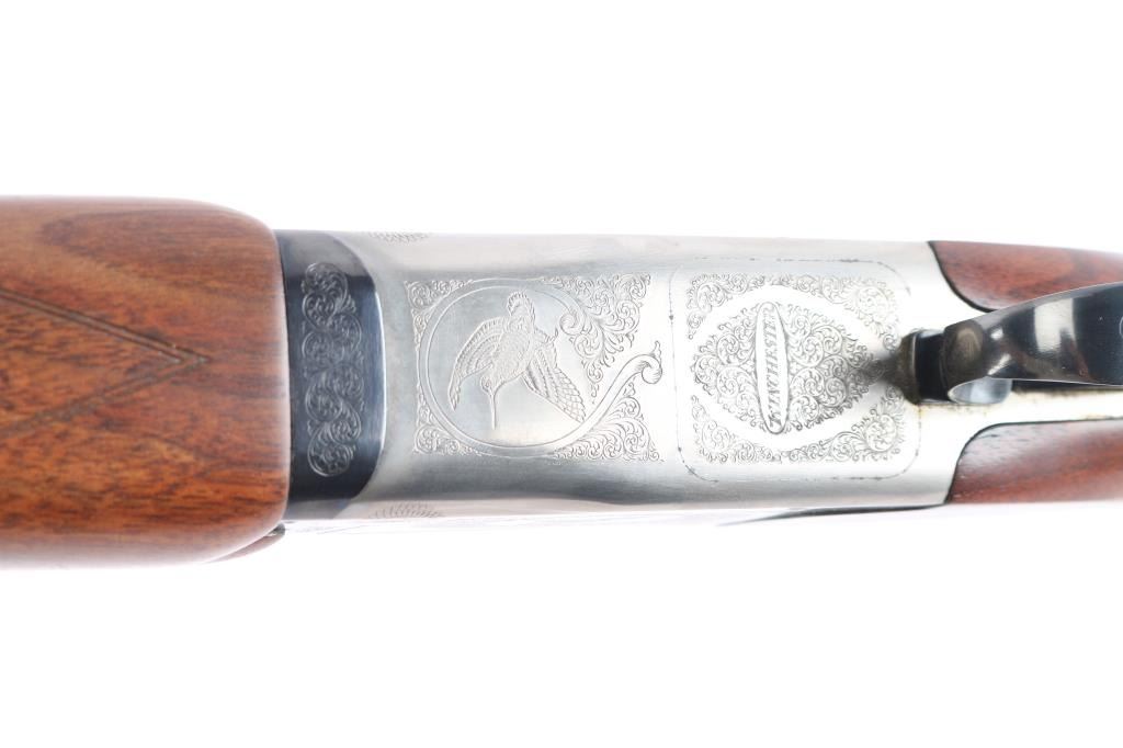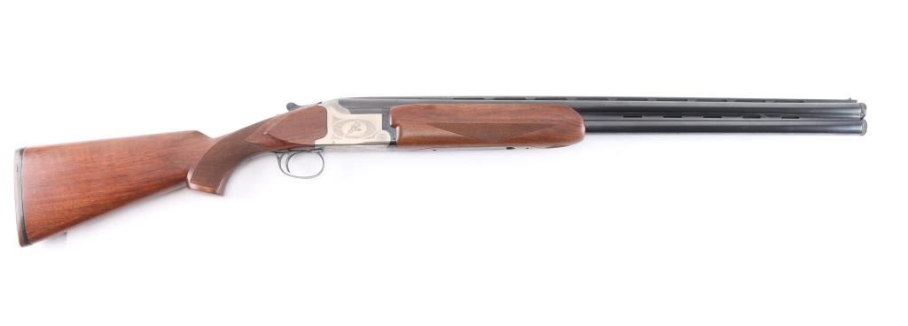 SN: K454249. 'Lightweight' Pigeon Grade Over & Under double barrel shotgun chambered for 12 gauge 3" shells, Manufactured in Japan by Olin Kodensha Co. Ltd for Winchester from 1982 to 1987. Features blued finish on barrels, coin finished & engraved receiver & trigger plate, single trigger, top latch, safety at tang selects barrel, fancy figured walnut stock with checkered panels at wrist and forearms, selective auto ejectors, pistol grip stock. Barrels are 27" long with choke tubes (IC chokes installed in both barrels), vent ribs, Bradley style white front bead, small white mid bead. Receiver engraving is 75% coverage, Quail, pheasants, and woodcock surrounded and bordered with floral scrolls. Forend latch with floral scrolls, checkered brown rubber recoil pad. Length of pull is 14-1/4". Bores are excellent/bright. Bluing is about 98%. Forend and stock are in excellent condition with few scuffs to finish.