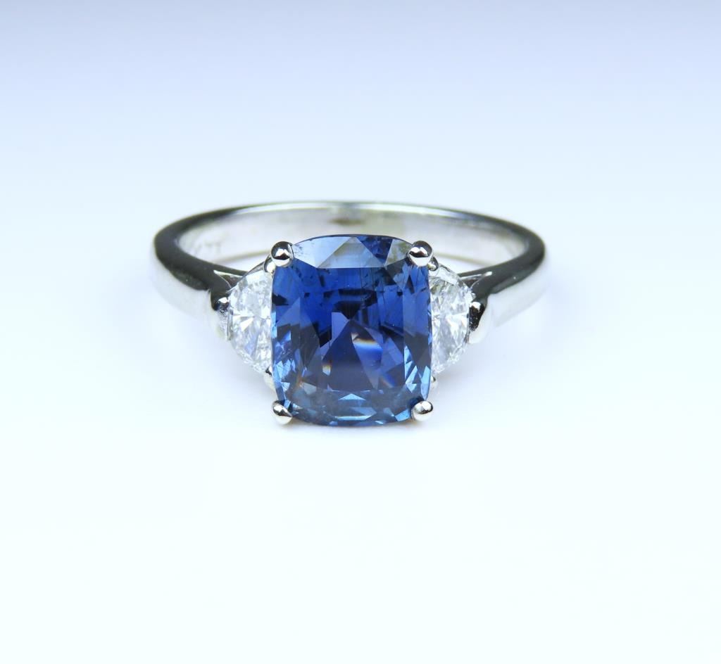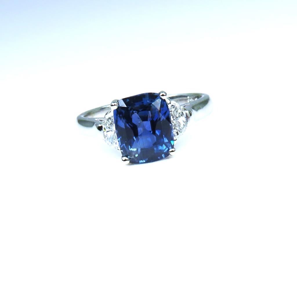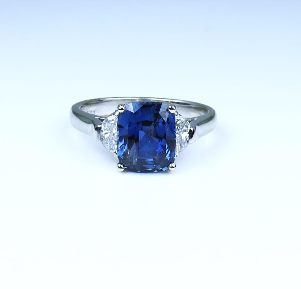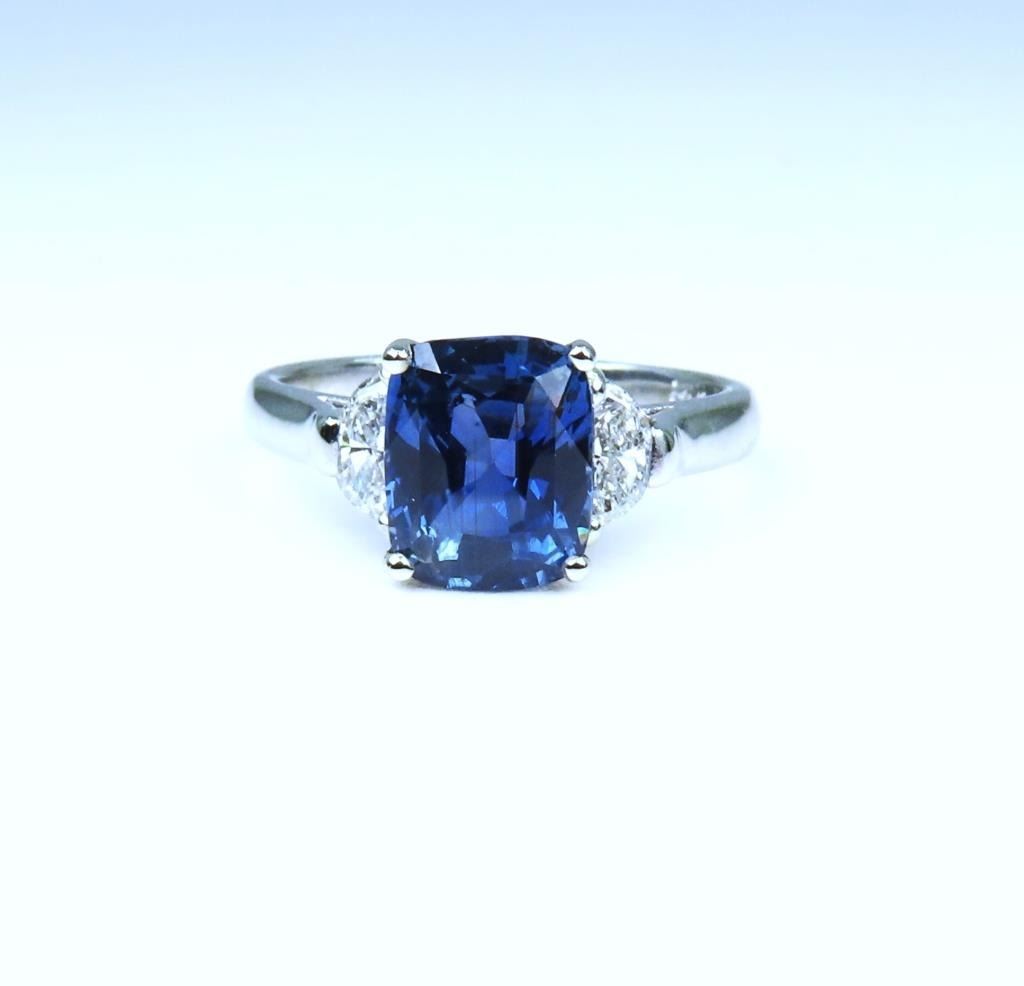 Blue Sapphire and Diamond Ring featuring a rectangular cushion cut 3.10 carat Blue Sapphire with NO Treatment accented with 2 half-moon cut Diamonds weighing approx. 0.70 carats with F-G colors and VS clarity set in a classic custom design crafted in 14 karat white gold. Retail $20,000-$30,000